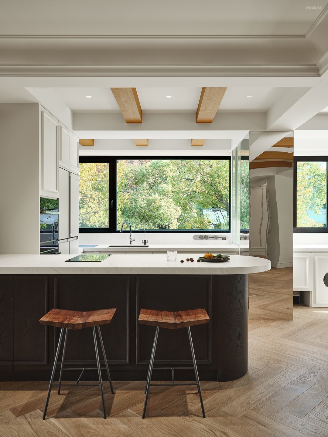 三米的岛台,链接公共区域,同时充当了烹饪社交功能,屋主在此备餐时,可以和客厅或书房里的另一半互动,在这里,烹饪不再是孤独的味觉秀,而是一场可随时上演的浪漫约会。