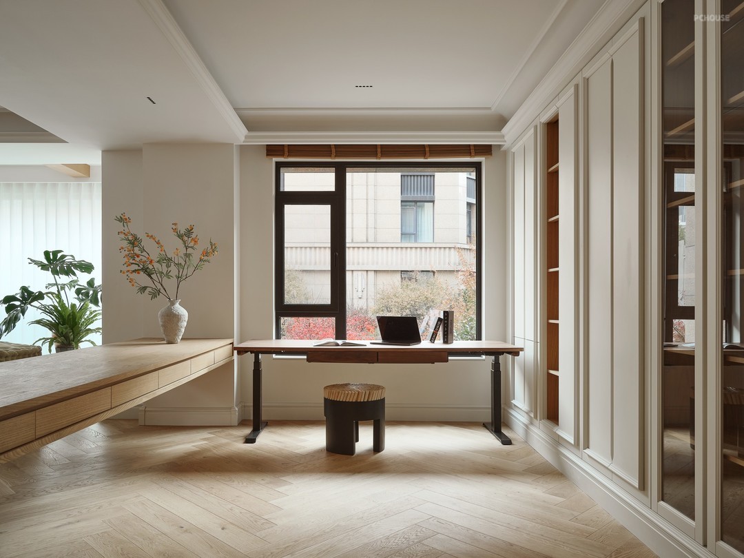 书房是屋主的常待区域,中间钢架结构的悬浮书桌,设置了两个办公位,一个在书桌区,另一个则在阳台靠窗区,考虑到屋主的职业属性,常年需要久坐,对于脊椎腰椎不太友好,升降桌的巧妙设计增添了工作舒适度,屋主可以随时选择站立办公,活动筋骨,释放压力。