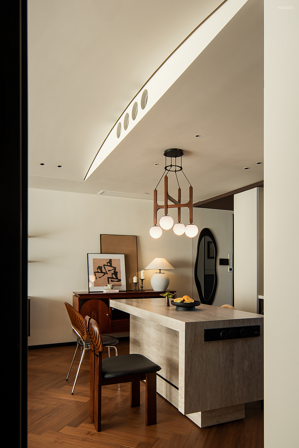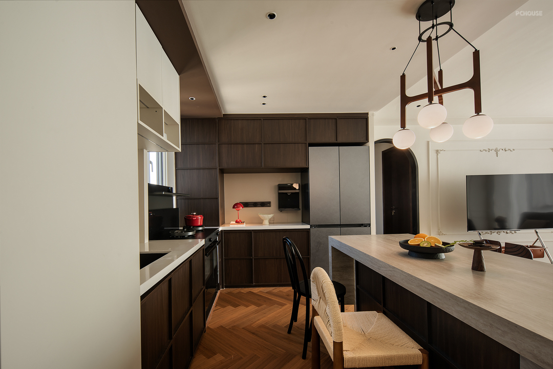 餐厨的设计不仅拓宽了空间的维度,还极大地促进了不同区域间的互动交融。经过精心调整的客厅与厨房实现了无缝衔接,使得居住者能在烹饪美食的同时,轻松享受彼此的交流时光。