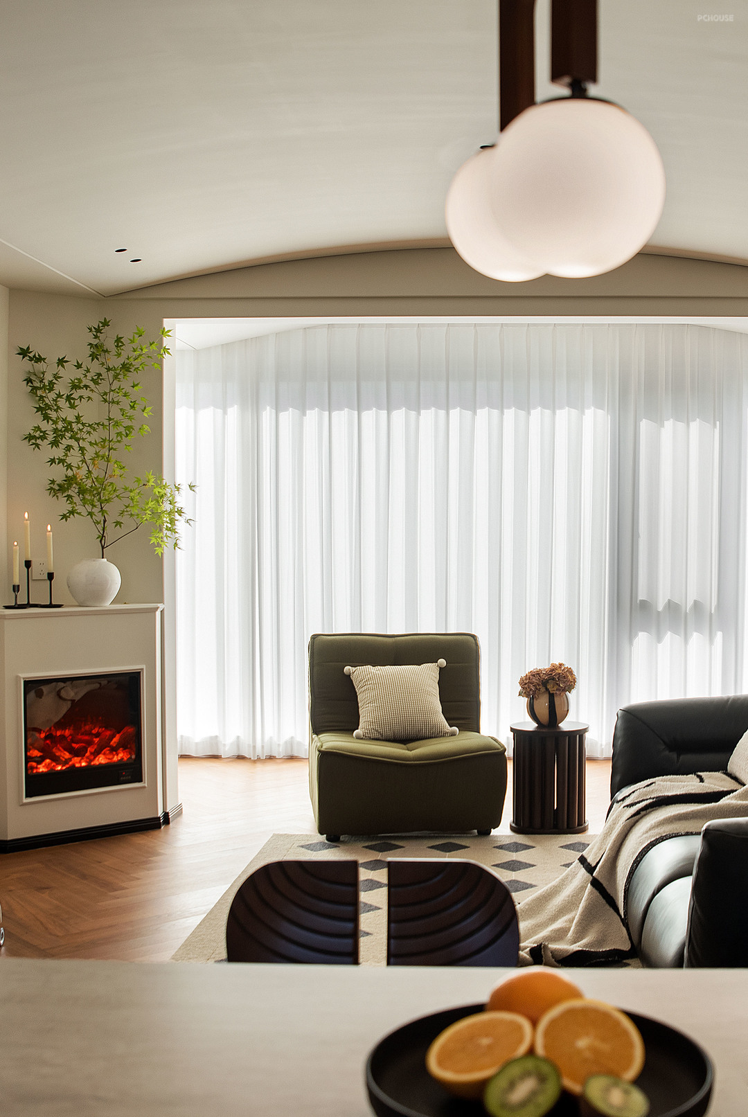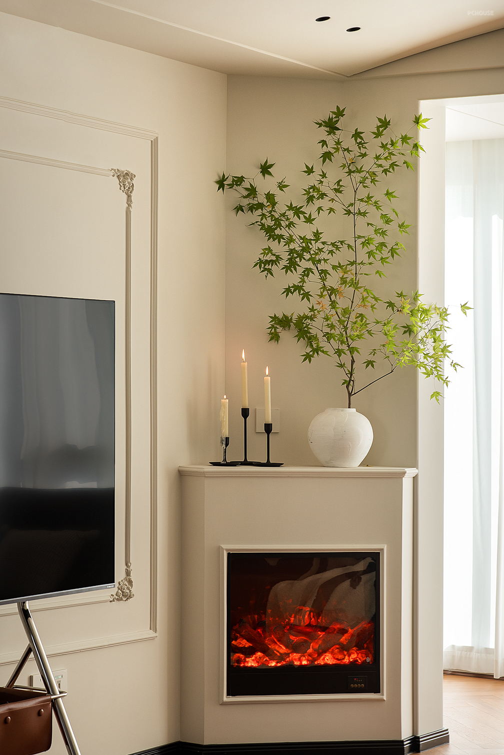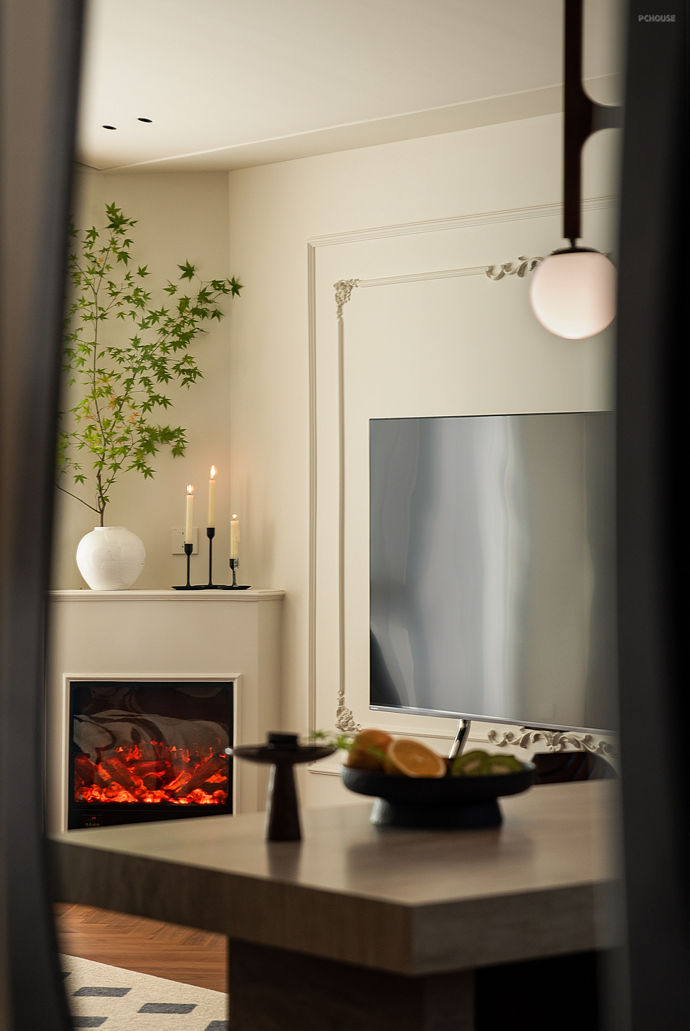 平面视觉中所突出的一角是家中独特的壁炉造型,与之相应的是古朴的材质 、拼接、和与空间整体的协调度,构造功能和视觉的个性化。
