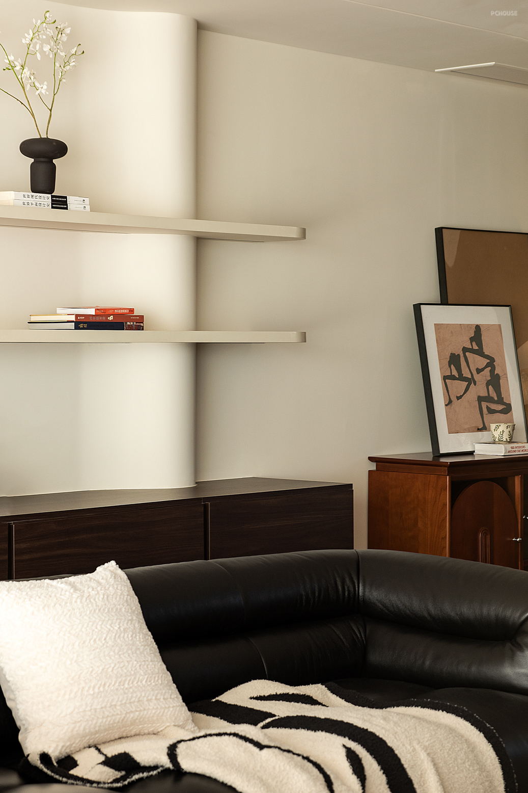 以此为背景做观影模式的承载,和灯光所营造的“建筑感”,用不同视角窥视着家中的静时状态。