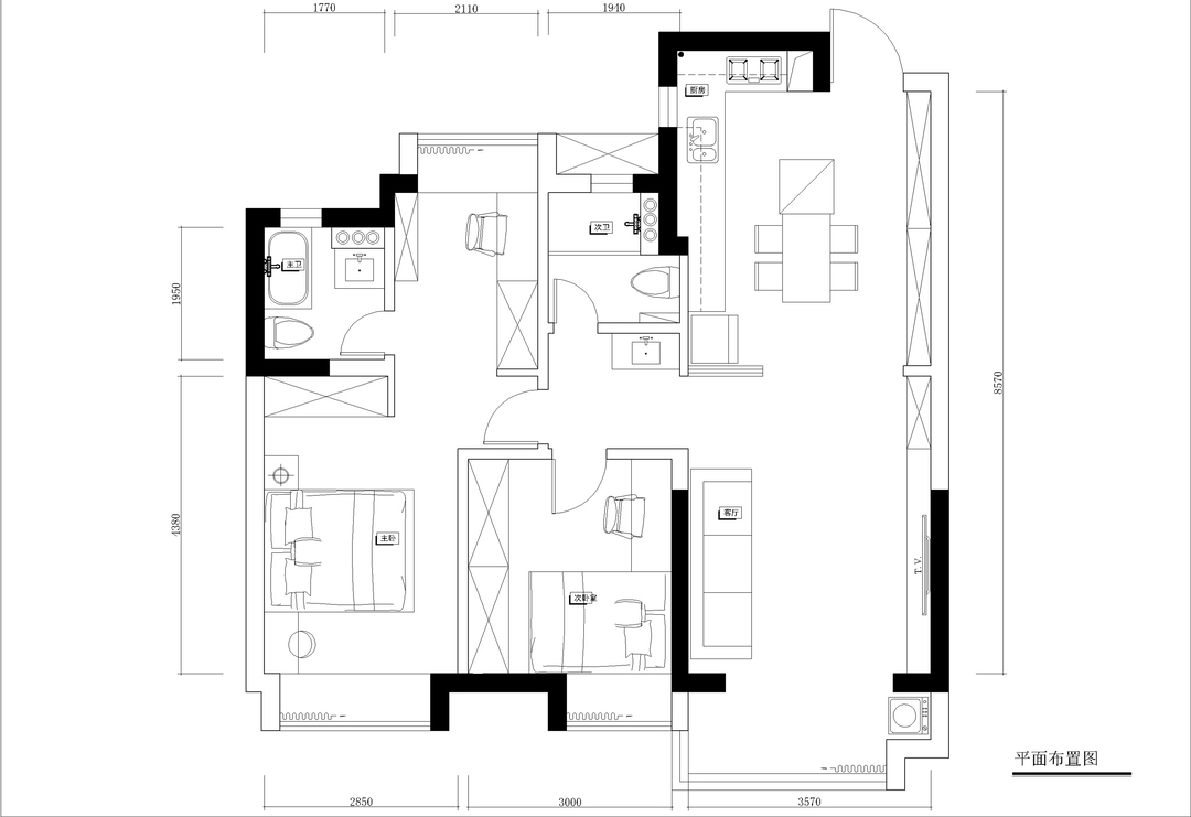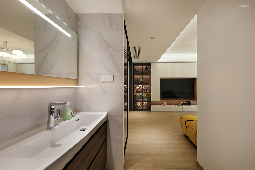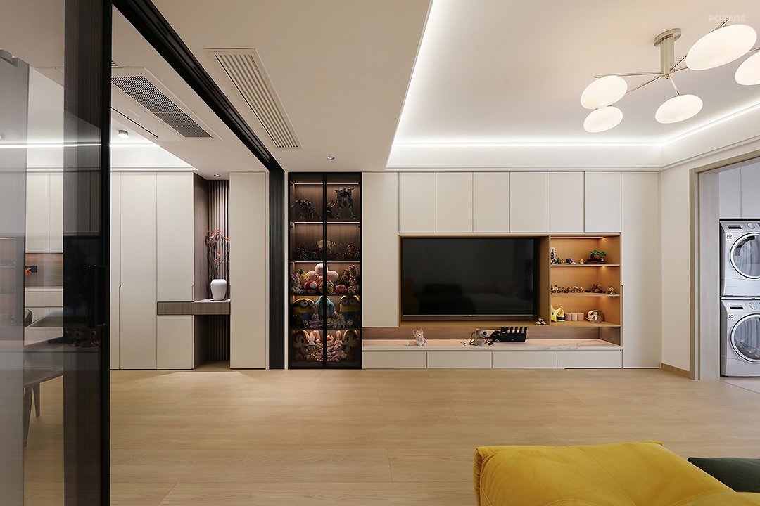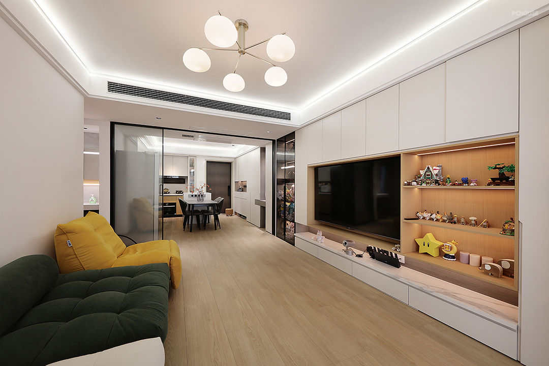 客厅︱拆除与阳台隔门,优化公区采光条件,同时增扩视野,营造自由慵懒的客厅氛围。电视柜结合餐边柜一体打造,保持室内区域的自然连接。白色的柜体板结合无把手设计,延续公区的简洁纯粹基调。