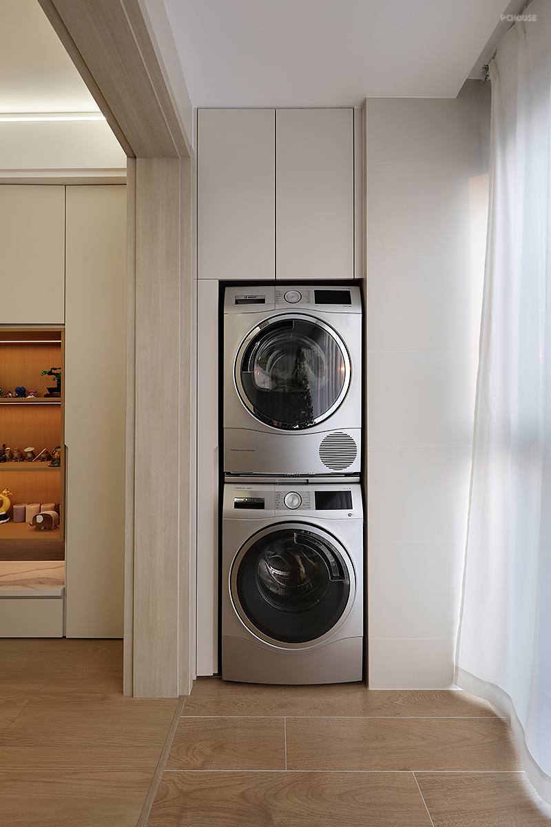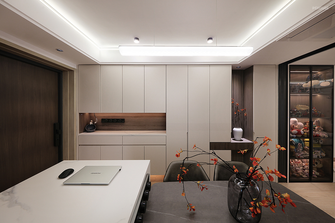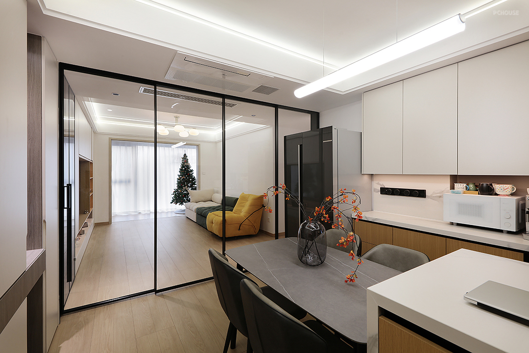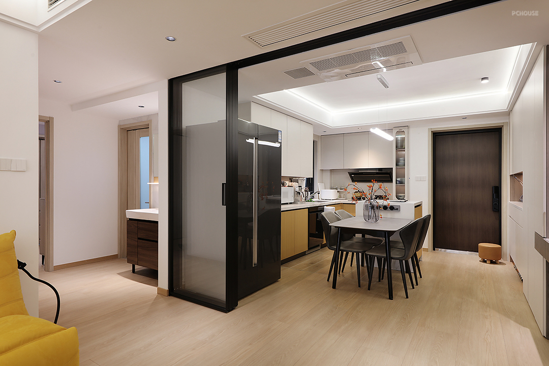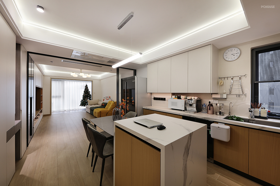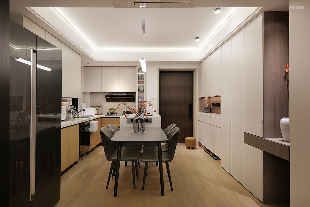 餐厅︱沿用LDK设计布局,选用了岛台+餐桌一体化设计,一方面能增加用餐的位置,另一方面岛台能增加收纳空间,还能充当西厨操作台,方便下厨时与家人朋友交流。