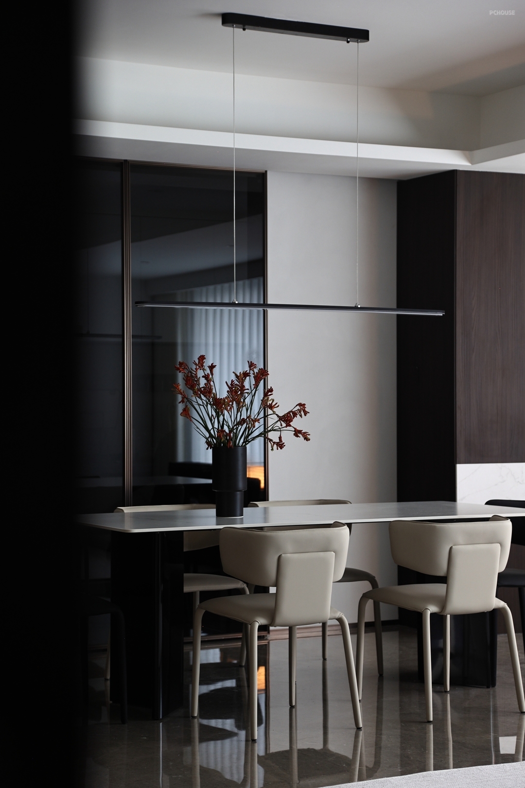 整体配色上,以李女士和黄先生喜爱的棕色系为主调,营造出温暖而雅致的氛围。这种色彩的选择不仅与空间的自然采光相得益彰,还为空间带来了舒适感和包容性,使得用餐环境更加宜人。通过这样的设计,餐厅不仅更具功能性,也更加符合业主的审美需求。
