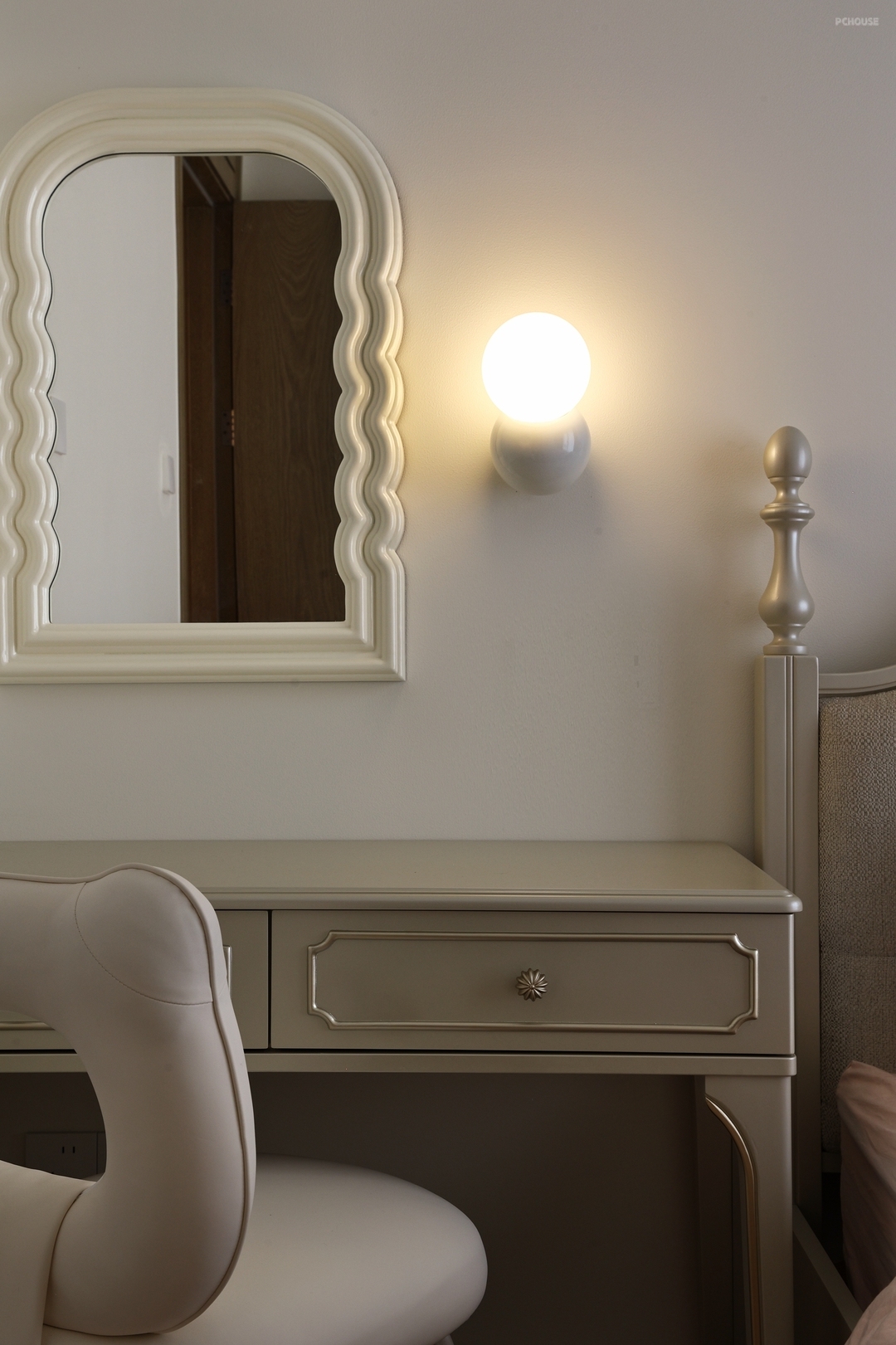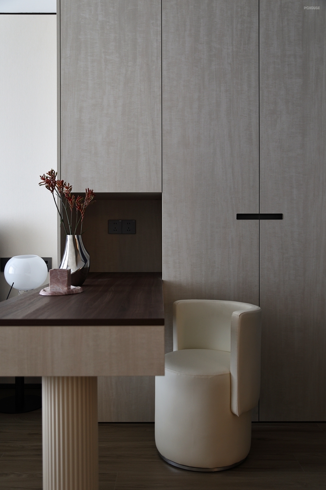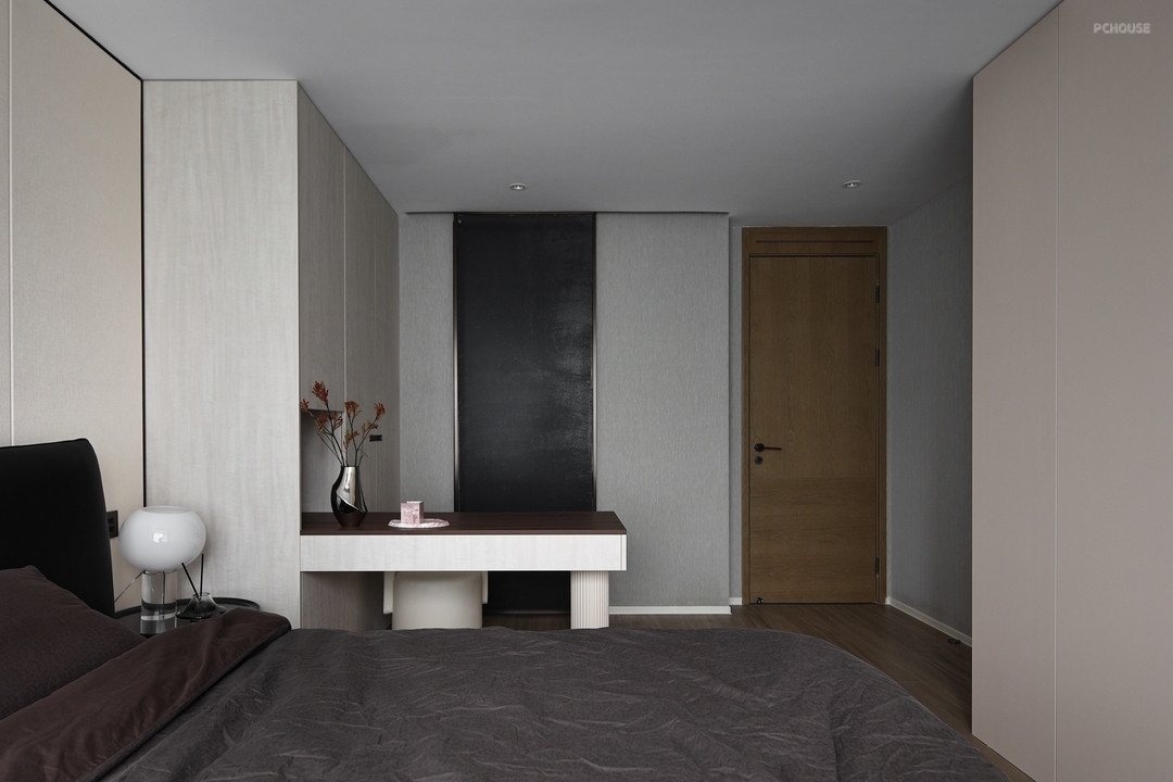 在主卧室的设计中,注重保留宽敞的视觉感受,巧妙地布局以兼顾空间的功能性与美观性。整面的衣柜放在床尾,充分利用了墙面,避免了传统L型衣柜所带来的视觉拥挤感,使房间显得更加宽敞。侧面预留次净衣区,方便存放常用衣物,实现便捷的收纳与整理,使空间更加整洁有序。为女主人精心设计了独立的梳妆台,提供了一个舒适的个人空间,让日常妆容打理变得更加轻松愉快。