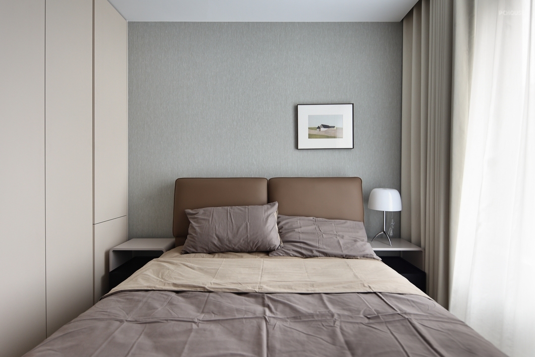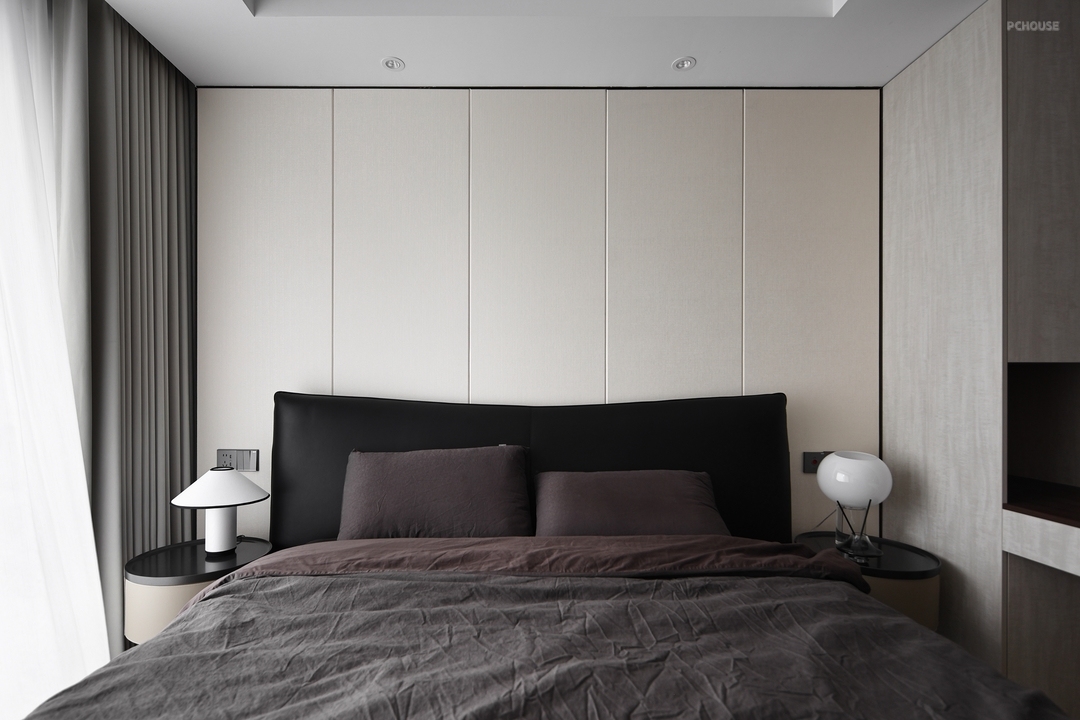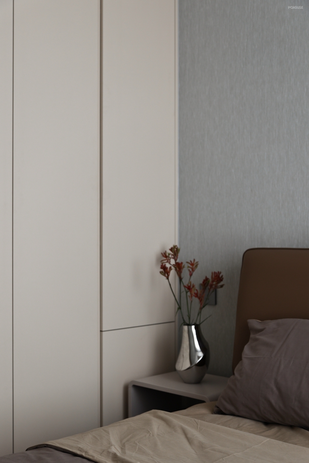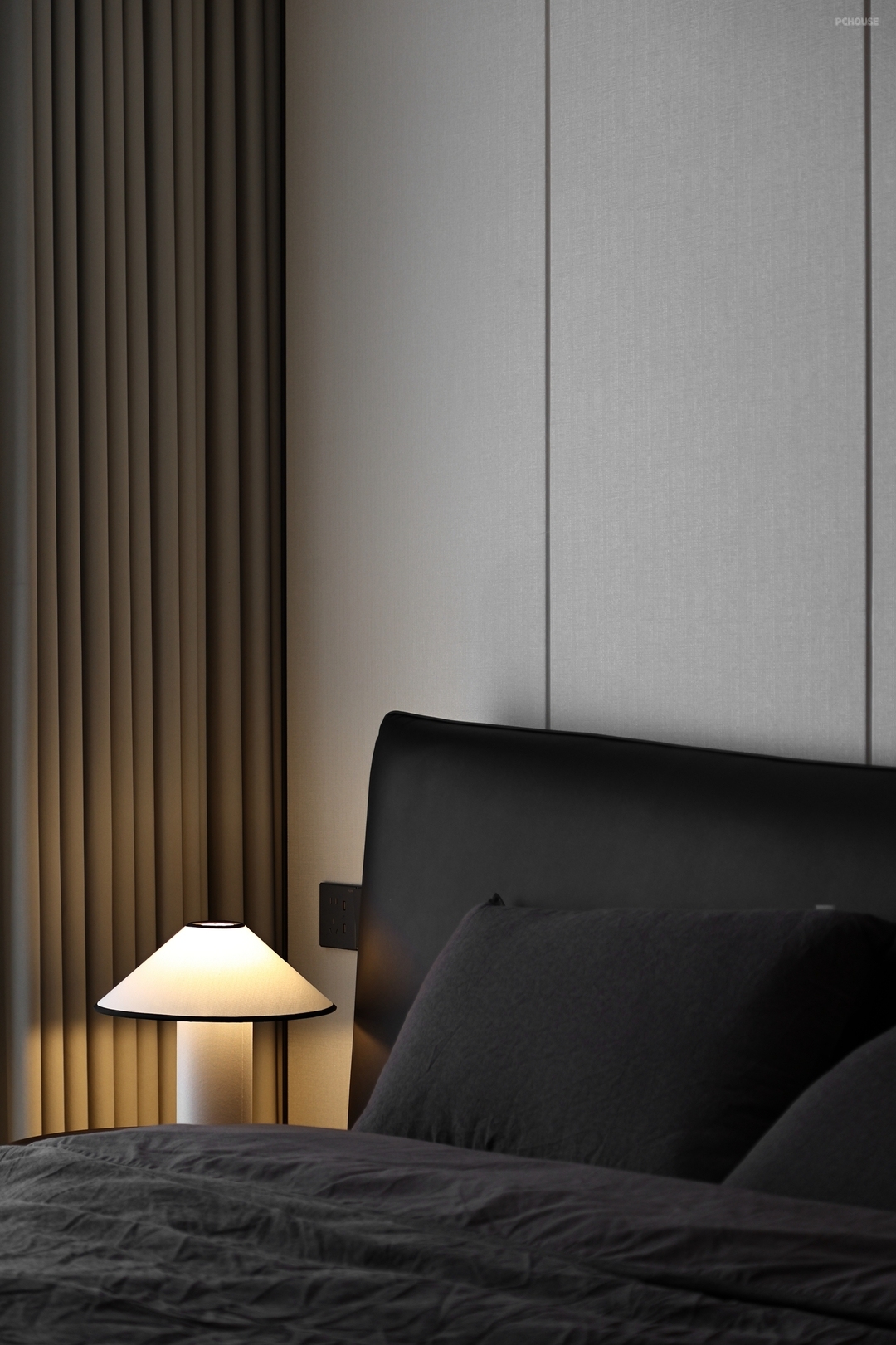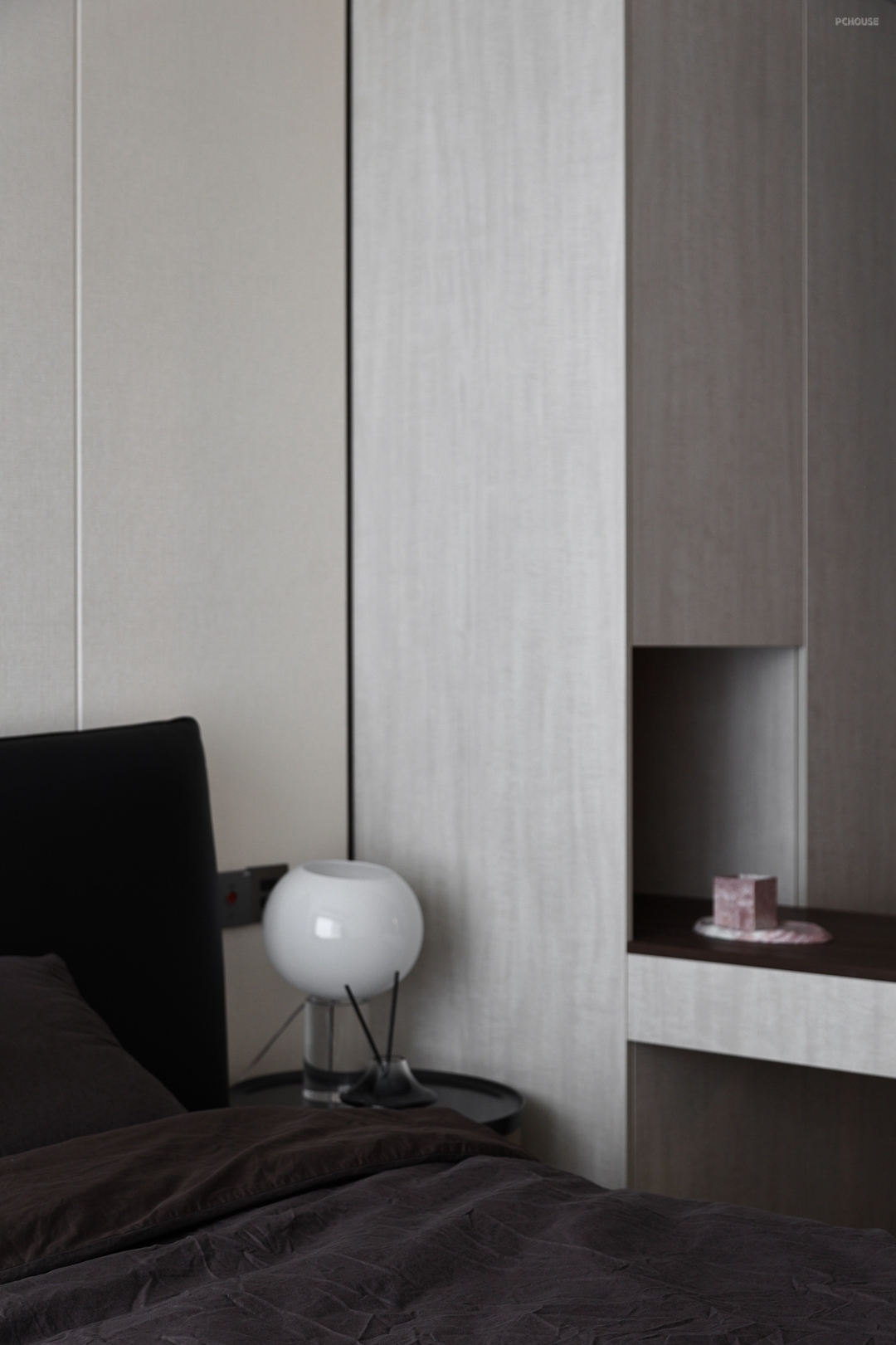 通过这样的设计,设计师力求为主卧室创造一个既优雅又实用的空间,让生活更舒适便利,同时保留了一份家的温馨与宁静。