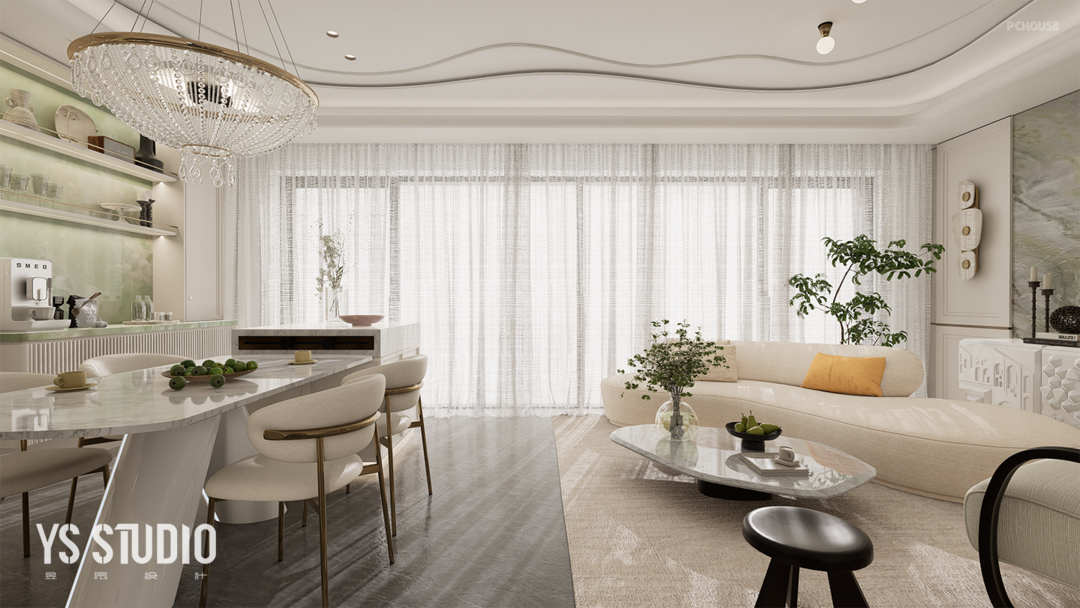 围合式的布局,做了LD一体化设计,将Living room(客厅)、Dining Room(餐厅),两个原本独立的功能整合,融合在同一空间内,甚至可以完全打开书房,形成客餐厅和书房的联动,让空间更有可塑性。