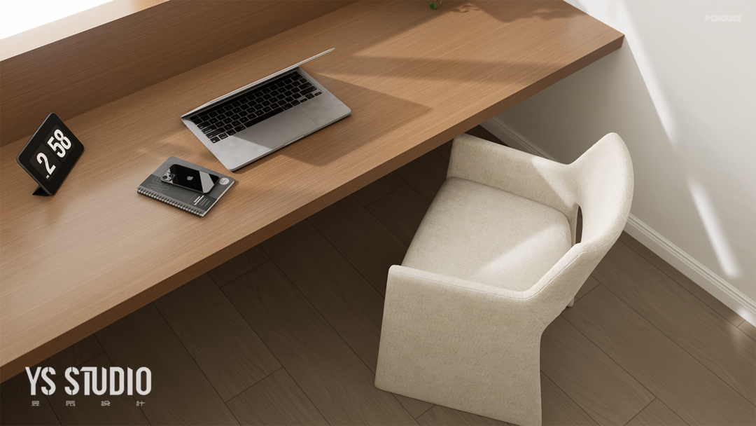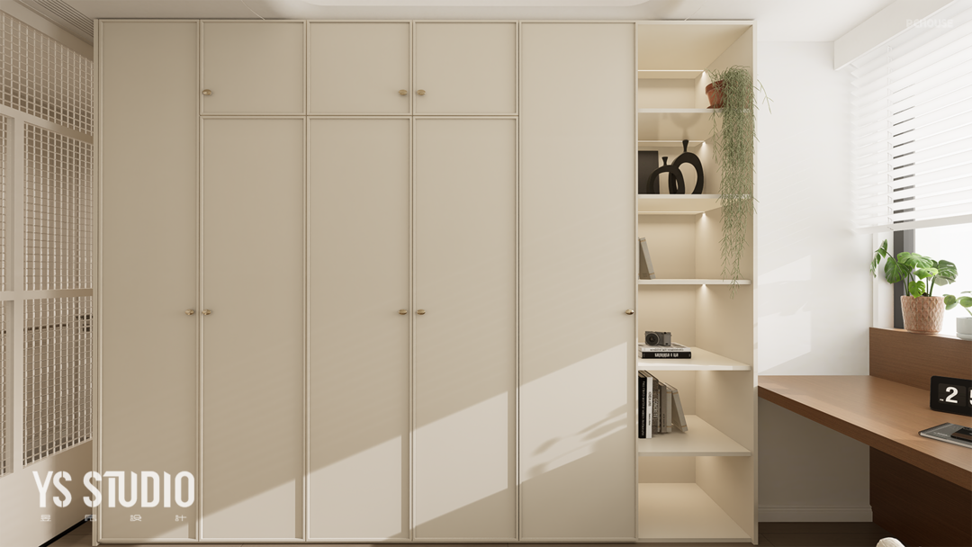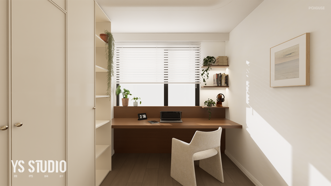 书房正如前文所提,是一个半开放式的空间。他可以是一个较有私密性的临时办公区域,更可以作为小朋友后期玩耍的区域,一个弹性空间的保留,对家里未来的需求具有铺垫和预见性。