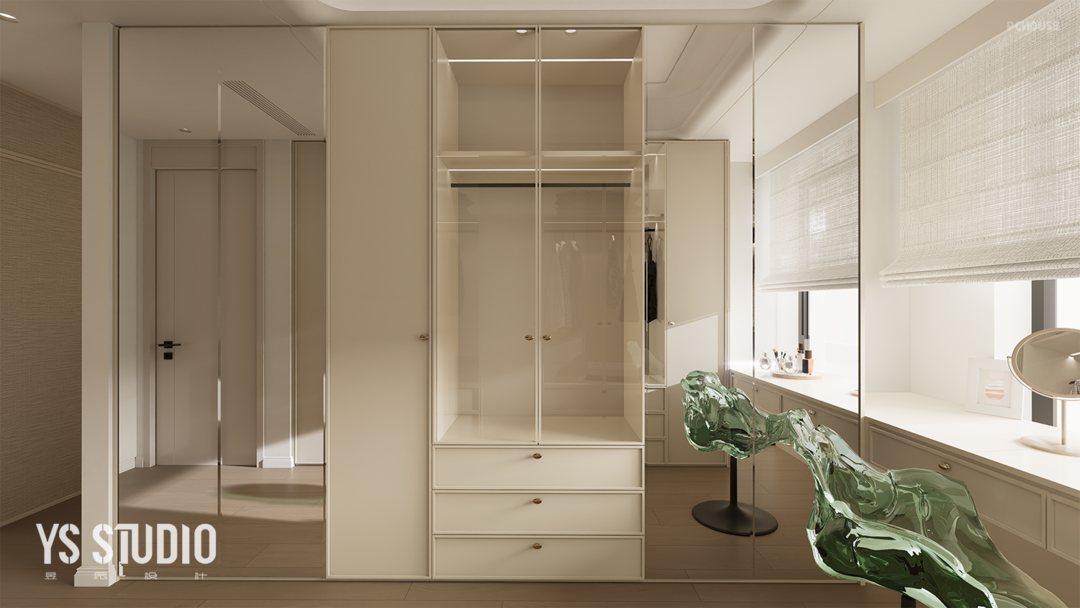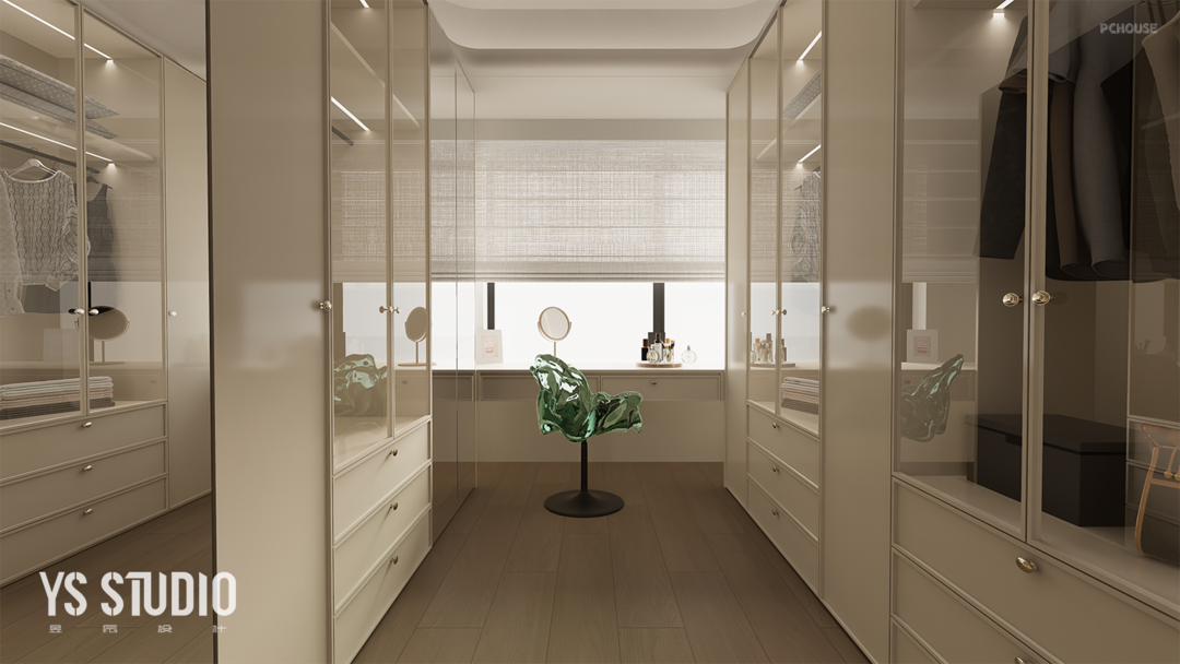 衣帽间运用了不同材质的融合,玻璃、镜面、木质等,以层次感对立千篇一律,方寸间井然有序,再以同样的配色-绿色的椅子去点缀空间,每一刻的美皆是真实而温暖的日常。