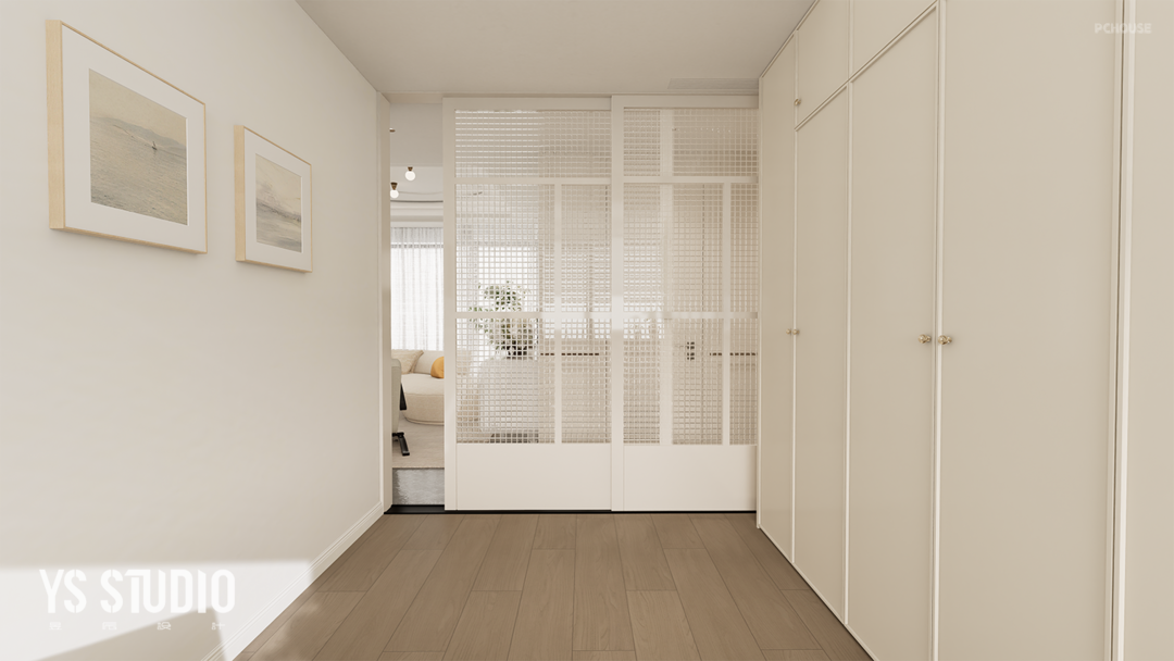 以一扇复古、通透的格框门形成两处空间的联动,来到干净整洁的书房区域。