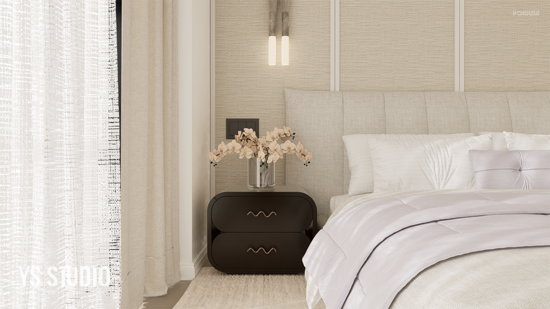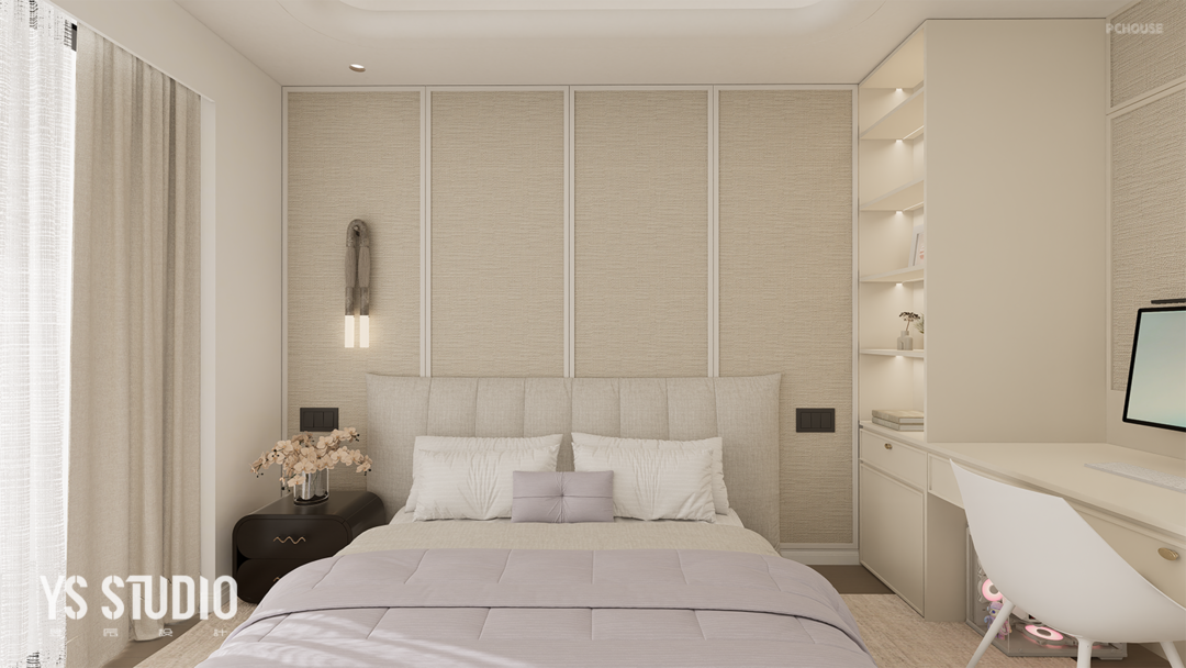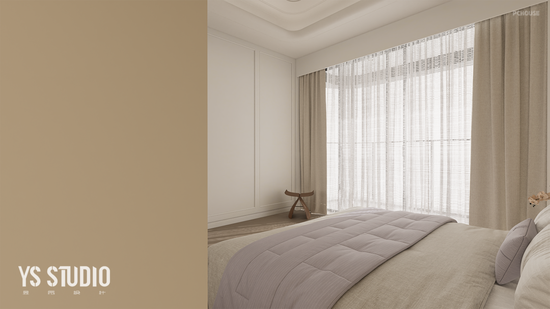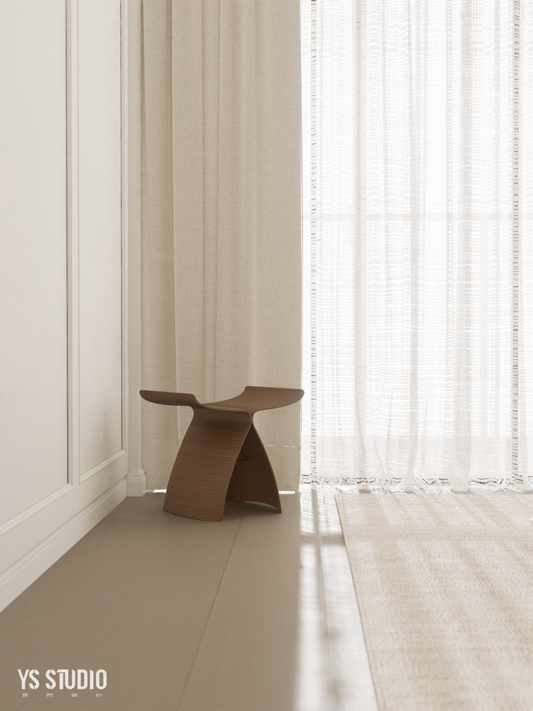 柔和的色调渲染了宁静的氛围,再通过一些木质、深色的小家具,去做出空间的层次变化。