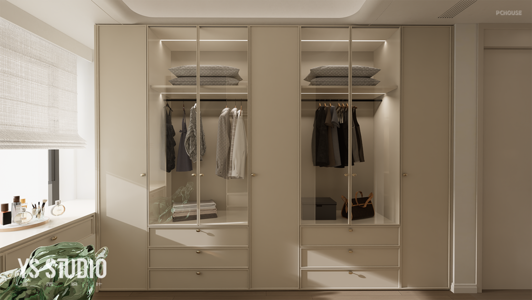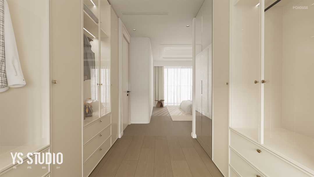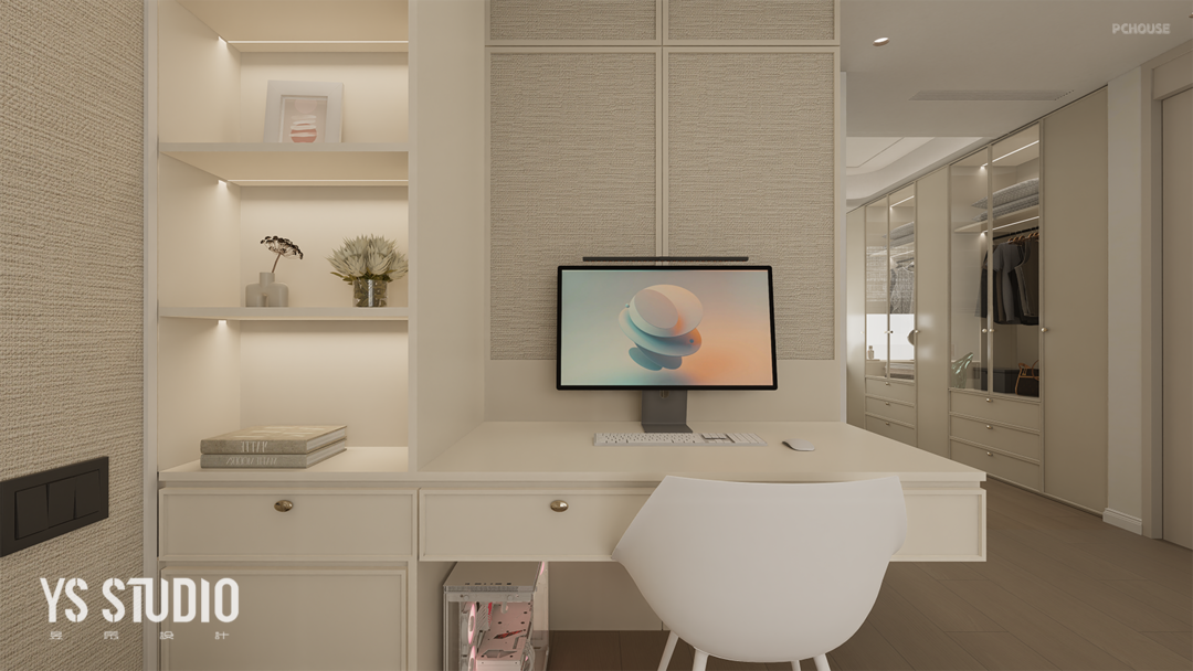 在床边一侧划分了临时办公区,顺着动线往前走,便是由原本的次卧改造而成的步入式衣帽间。就精装房来说,虽然牺牲一个卧室,但能为主卧套房的功能获得较大收益,去满足本身需求的一个做法。