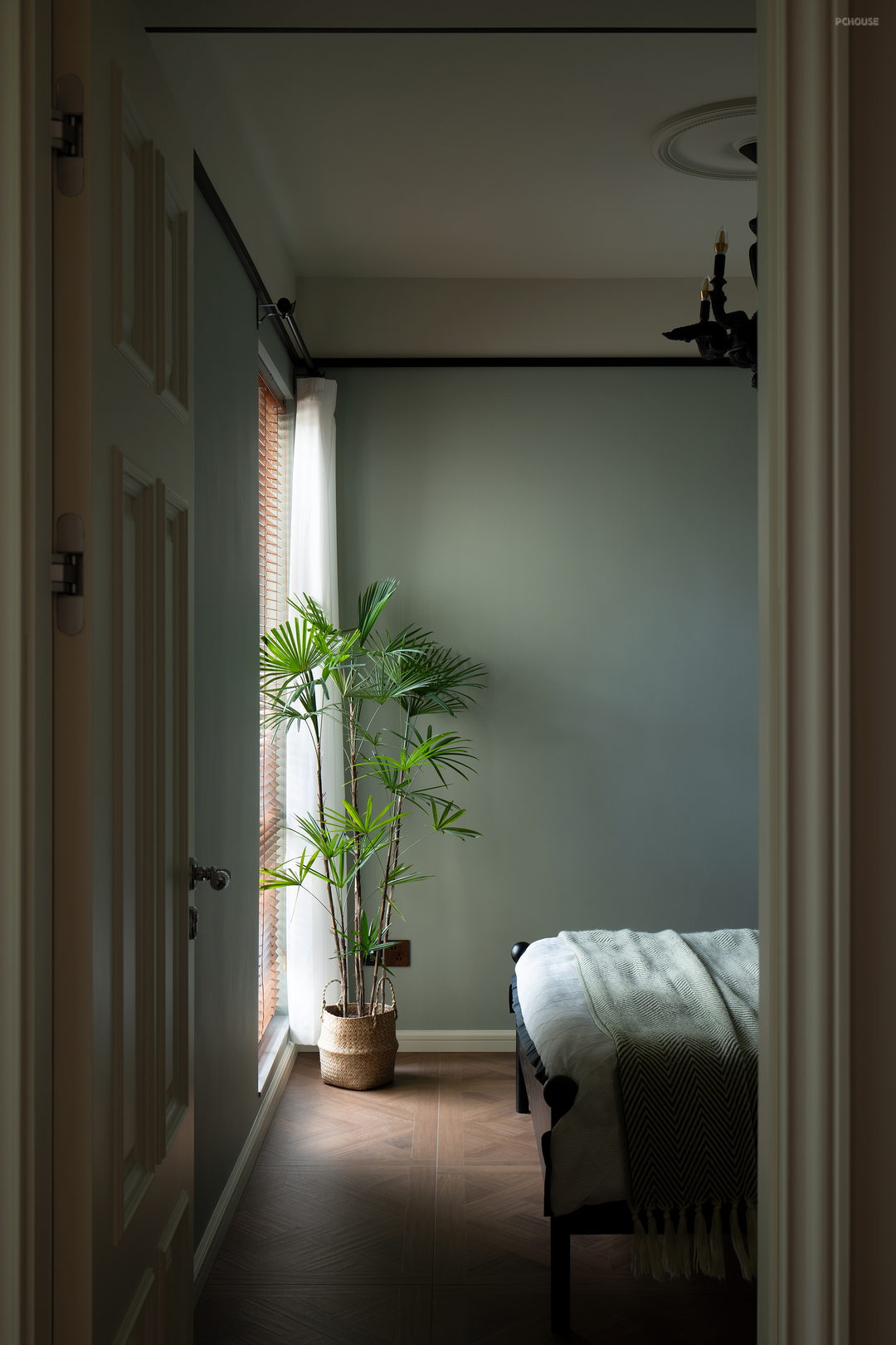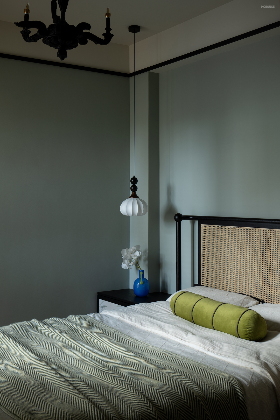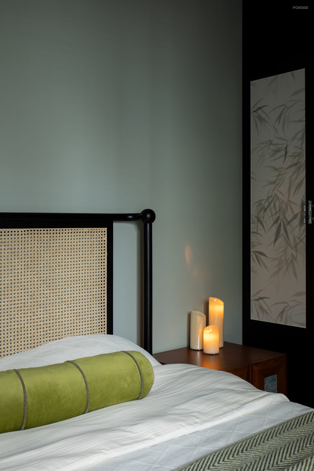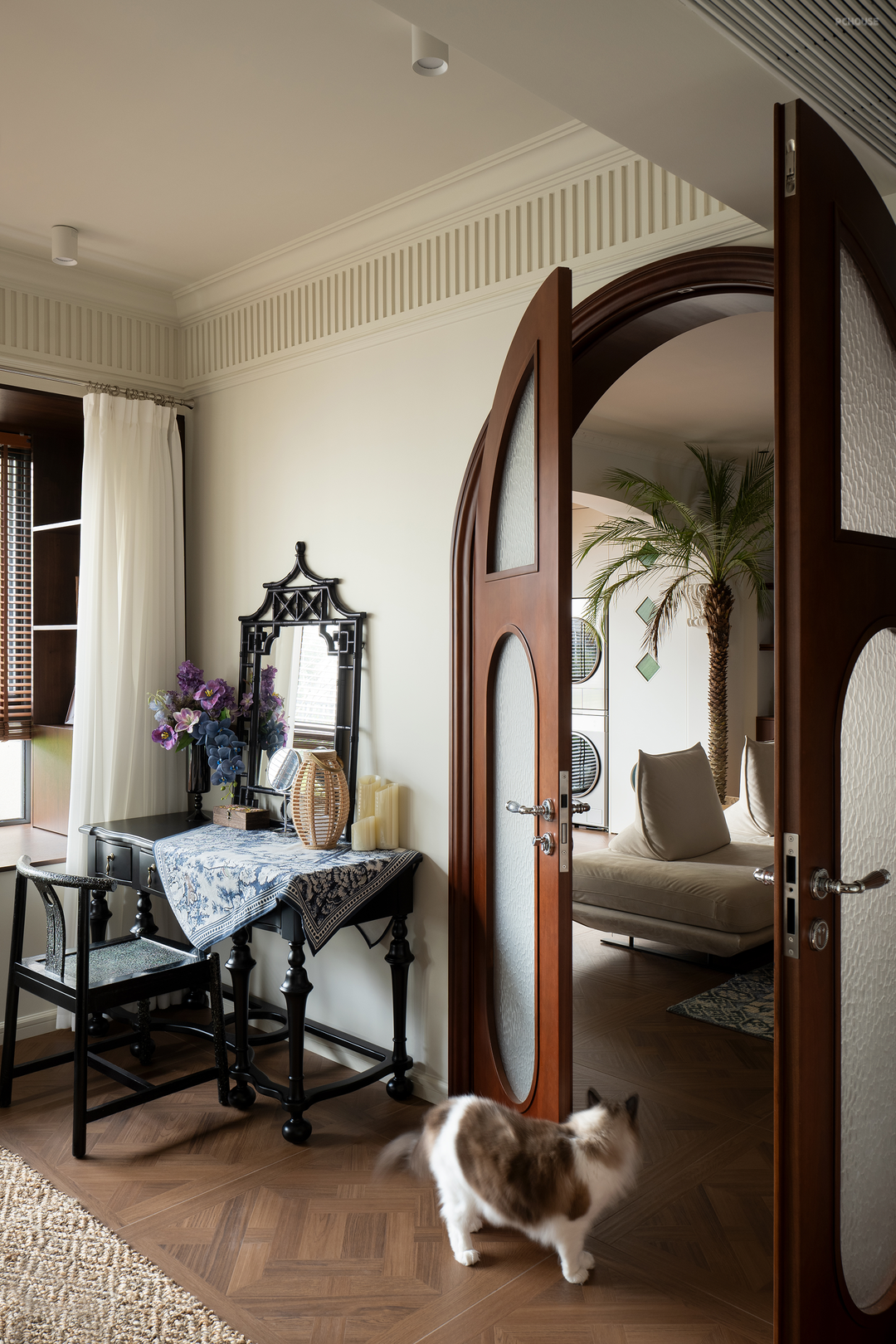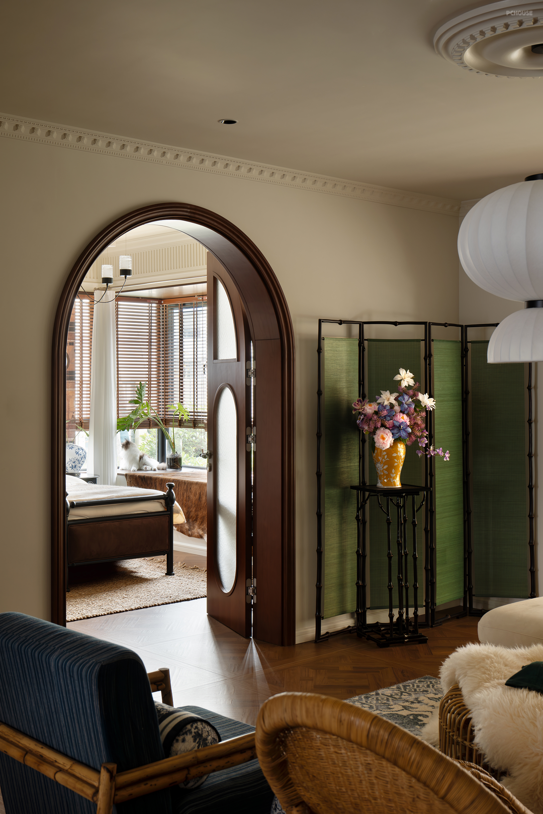 我们更改了主卧入口位置,做双开门。南洋风中,搭配进深色木质,突出木材本身的沉稳和馥郁调性,门洞与门扇中的弧形曲线营造慵懒随性之美。