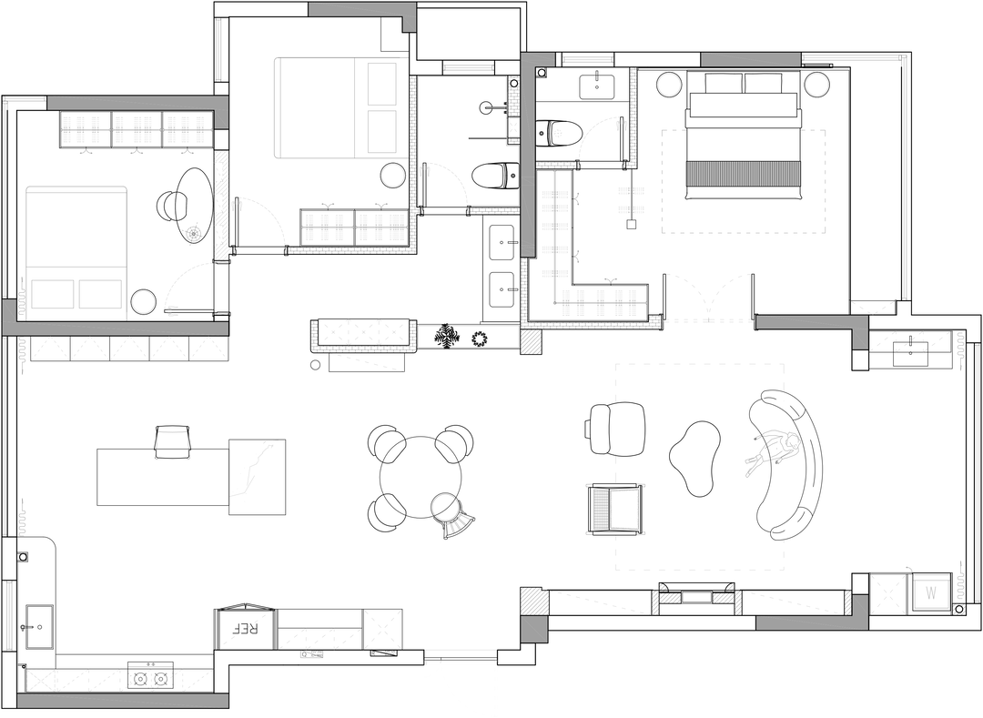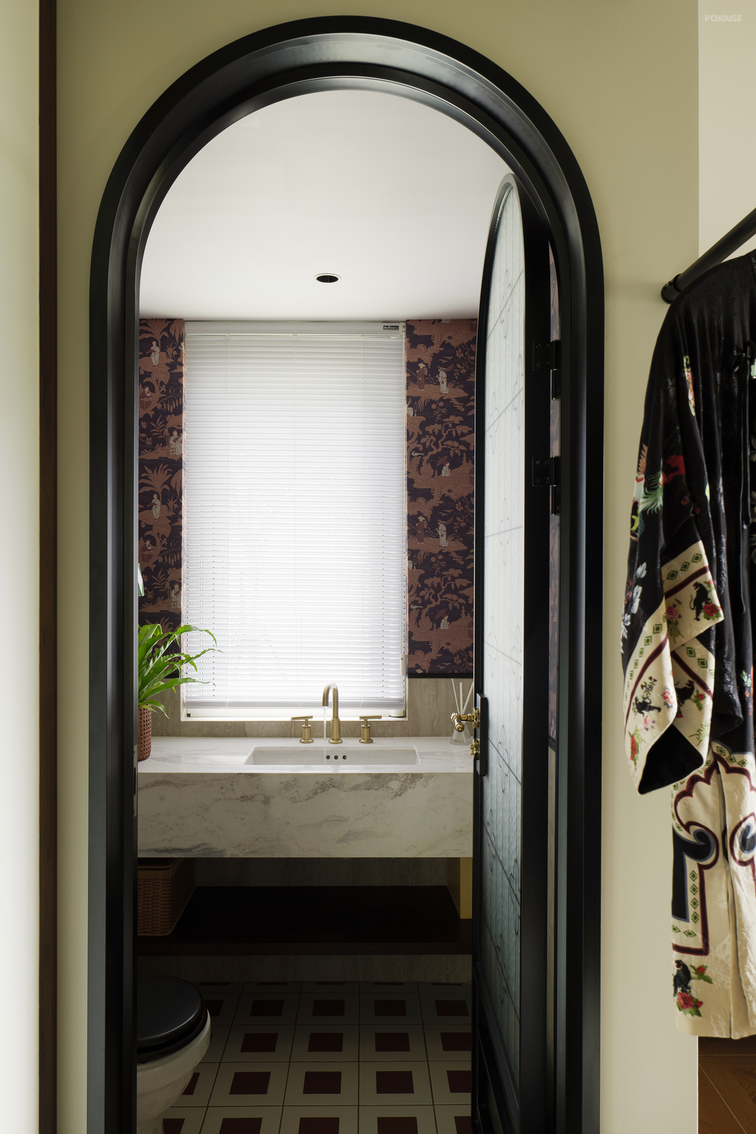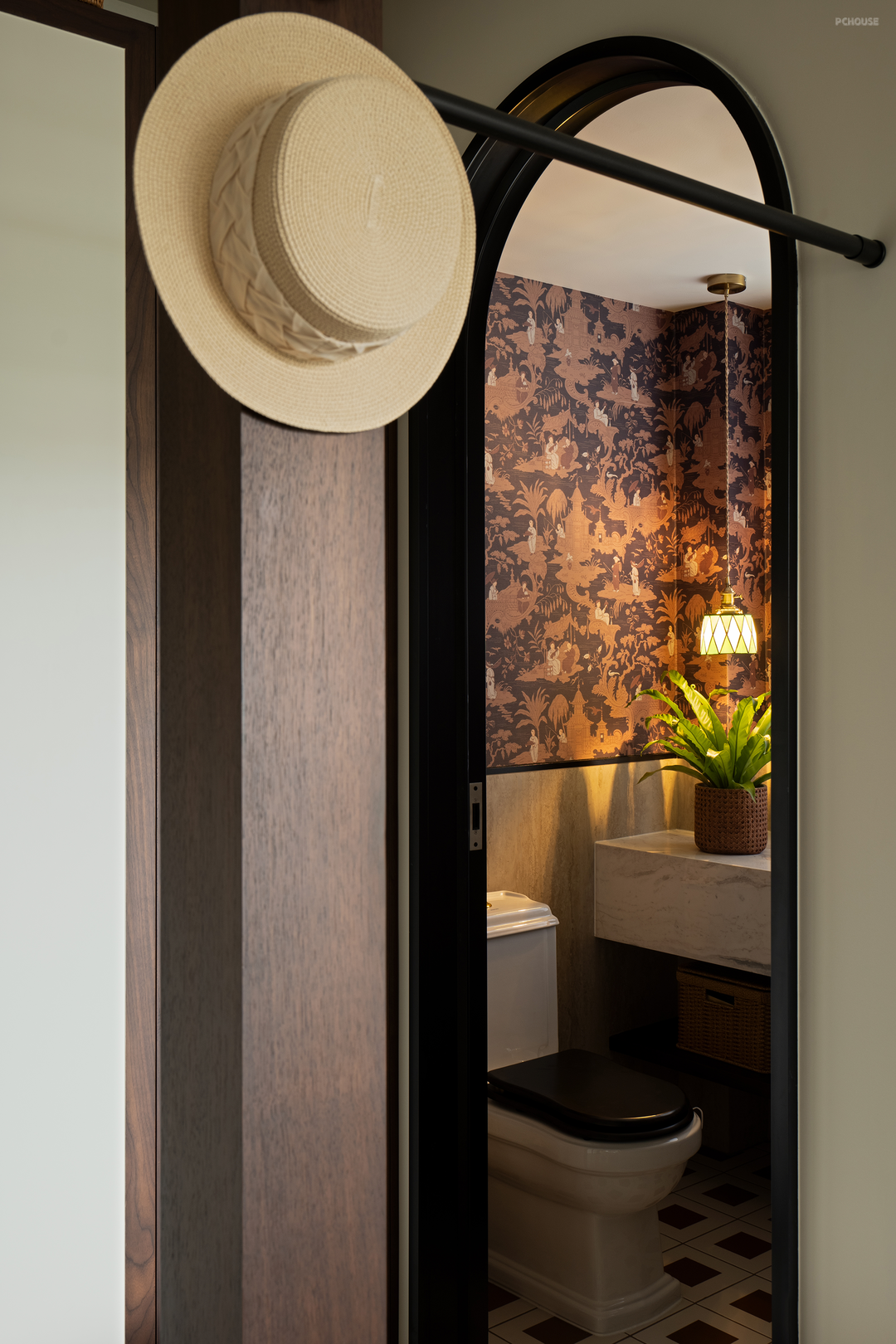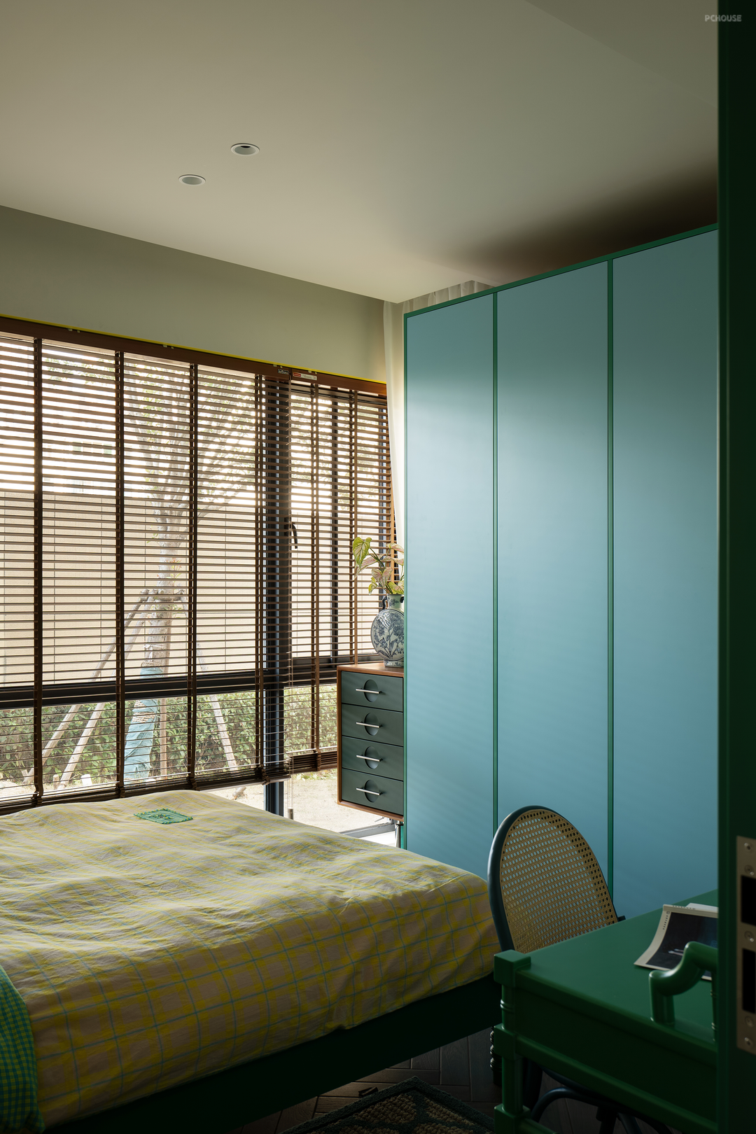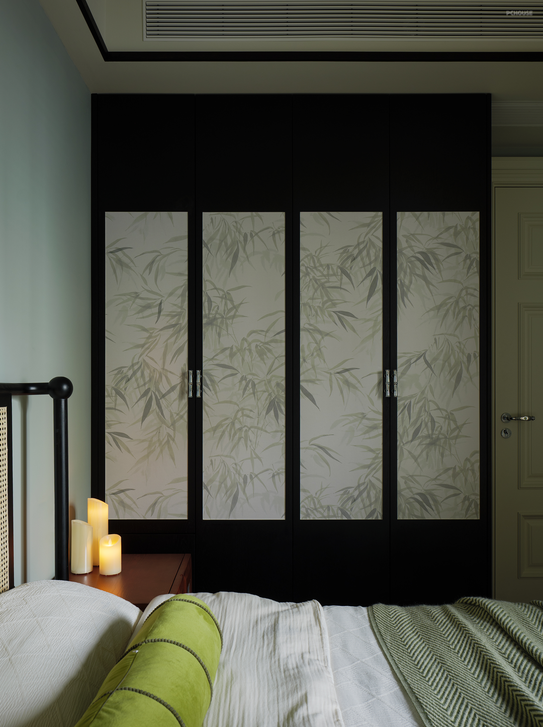 我们更改了主卧入口位置,做双开门。南洋风中,搭配进深色木质,突出木材本身的沉稳和馥郁调性,门洞与门扇中的弧形曲线营造慵懒随性之美。