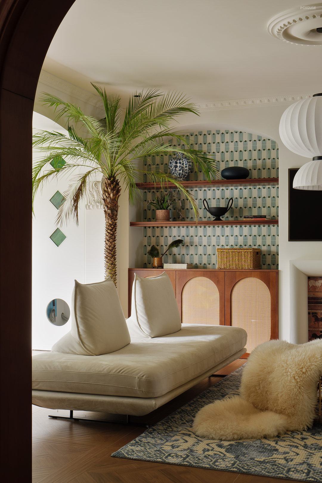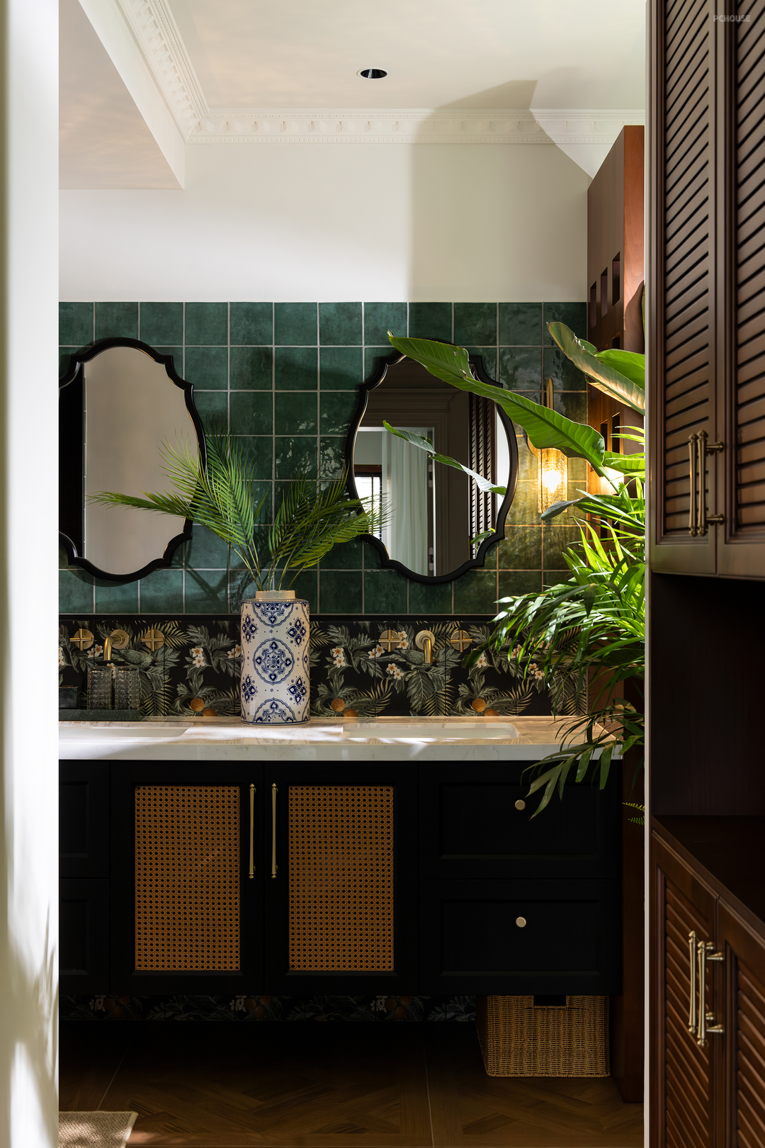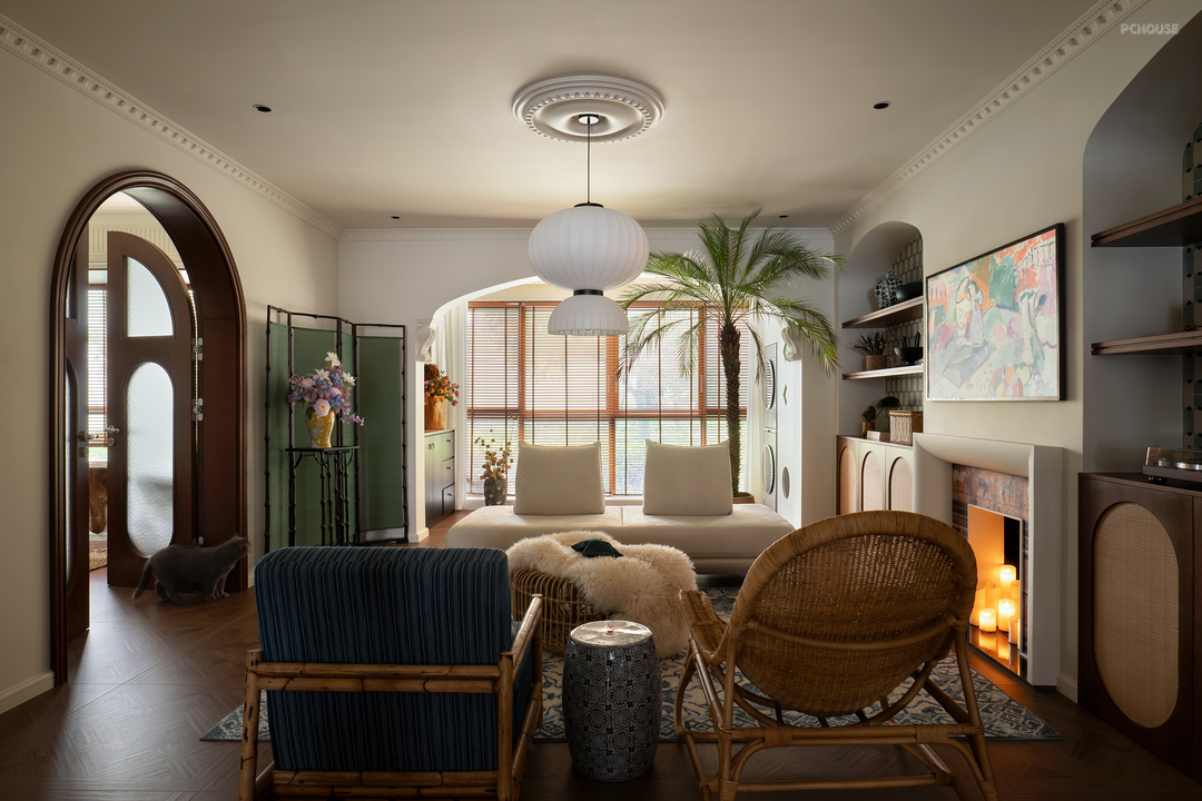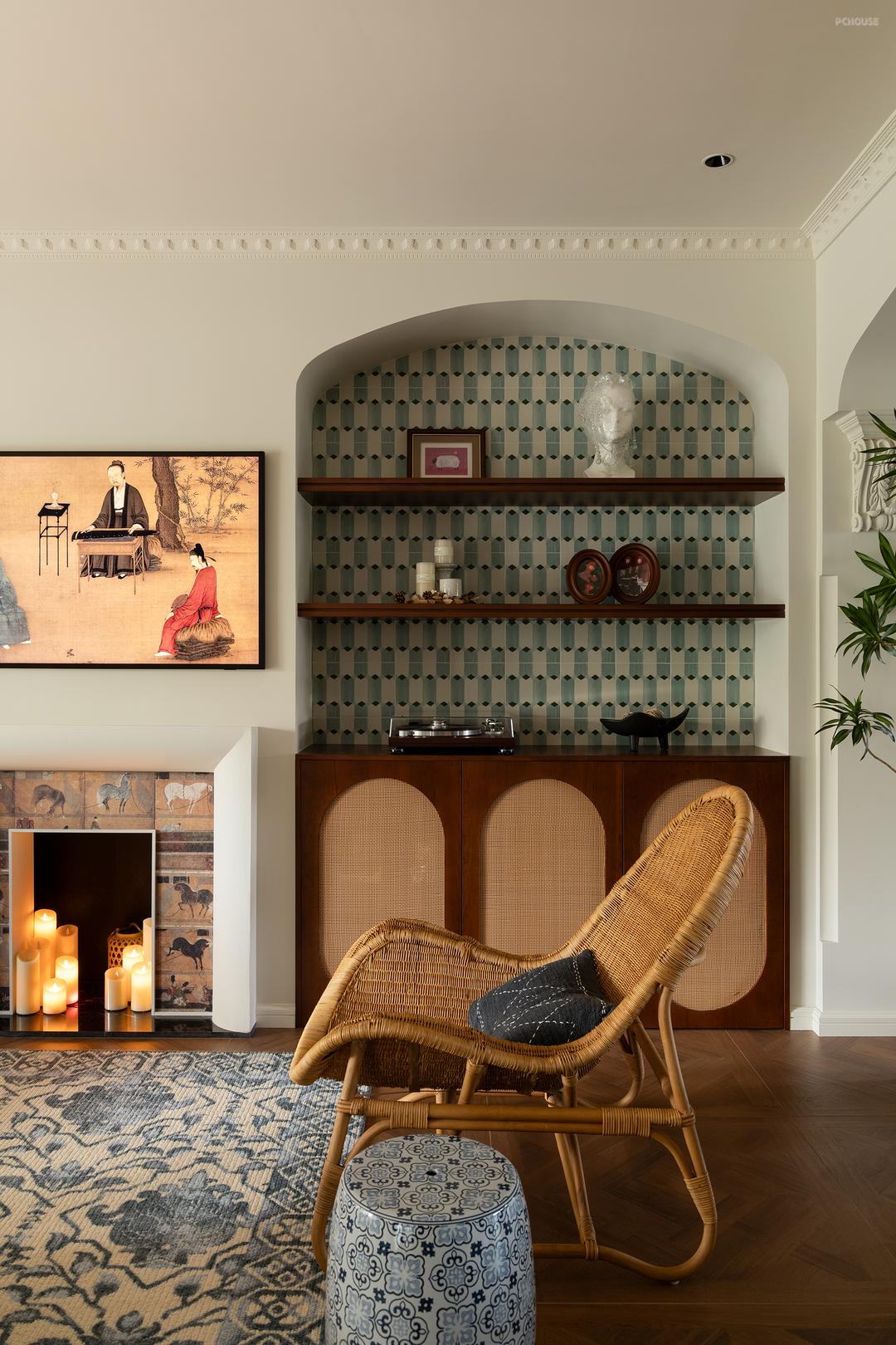 说起南洋风,离不开藤编家具、热带植物,低饱和度的绿色,以及一些中国风元素的点缀。比如壁炉处的唐风壁纸、壁龛背景的绿色小花砖和藤编柜体。两道壁龛,柜体造型、吊顶……空间中柔软的弧形如同植物伸展开的叶片,有一种自然的亲昵感。