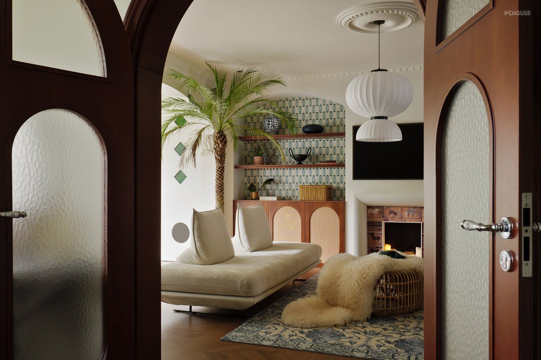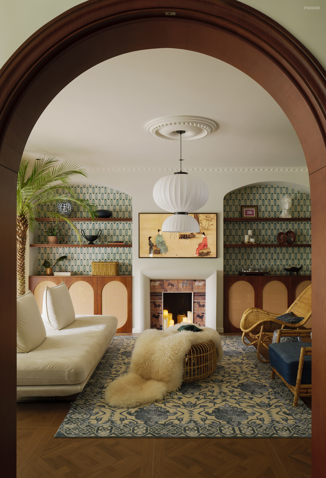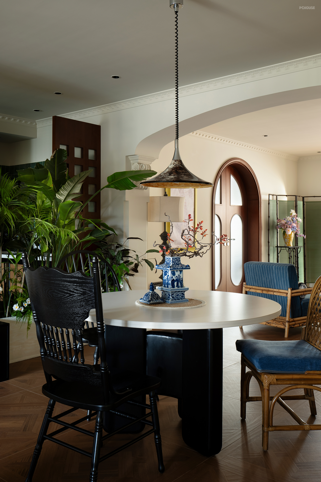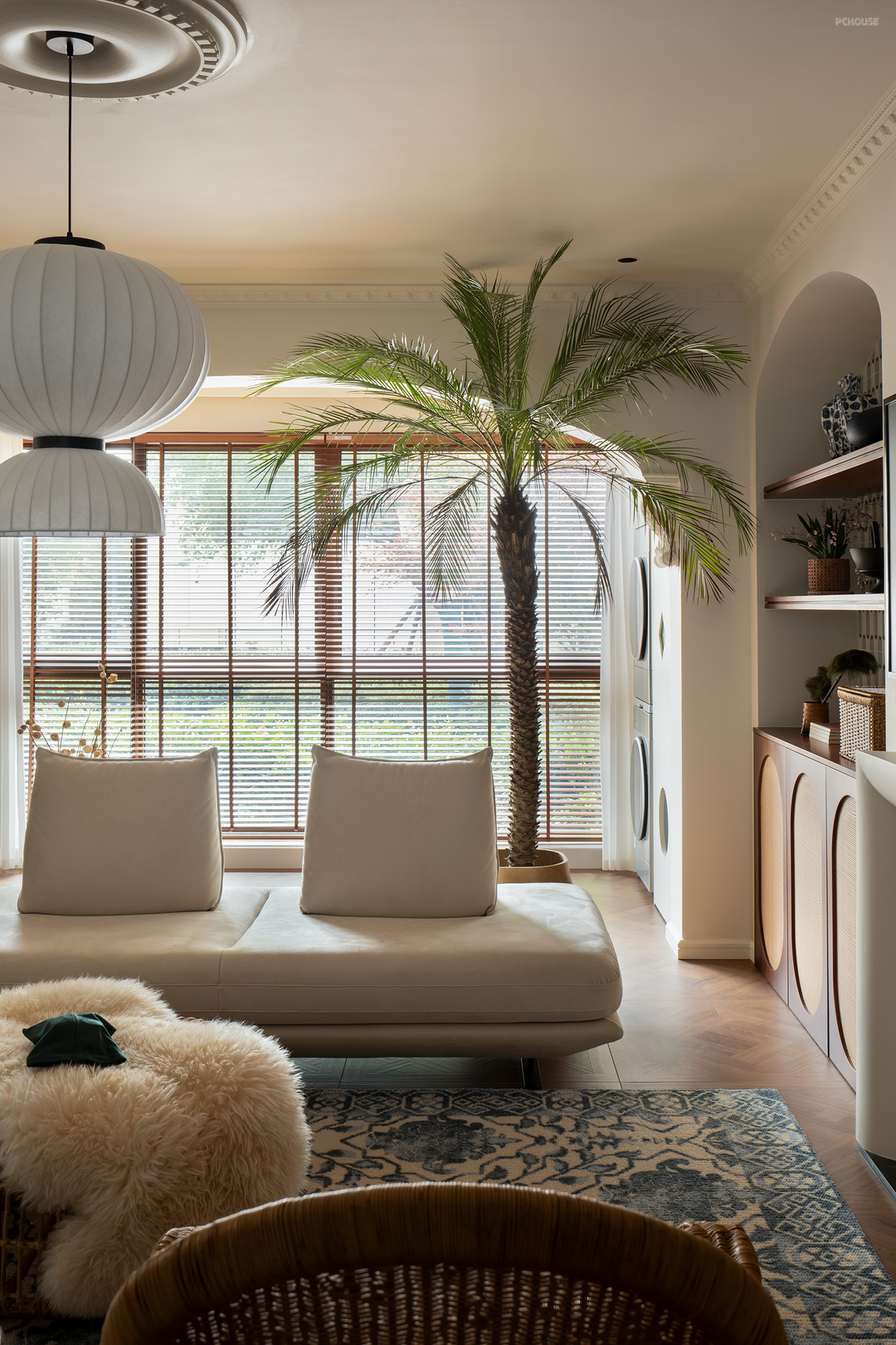 说起南洋风,离不开藤编家具、热带植物,低饱和度的绿色,以及一些中国风元素的点缀。比如壁炉处的唐风壁纸、壁龛背景的绿色小花砖和藤编柜体。两道壁龛,柜体造型、吊顶……空间中柔软的弧形如同植物伸展开的叶片,有一种自然的亲昵感。