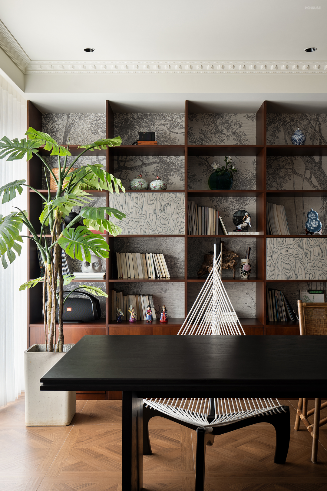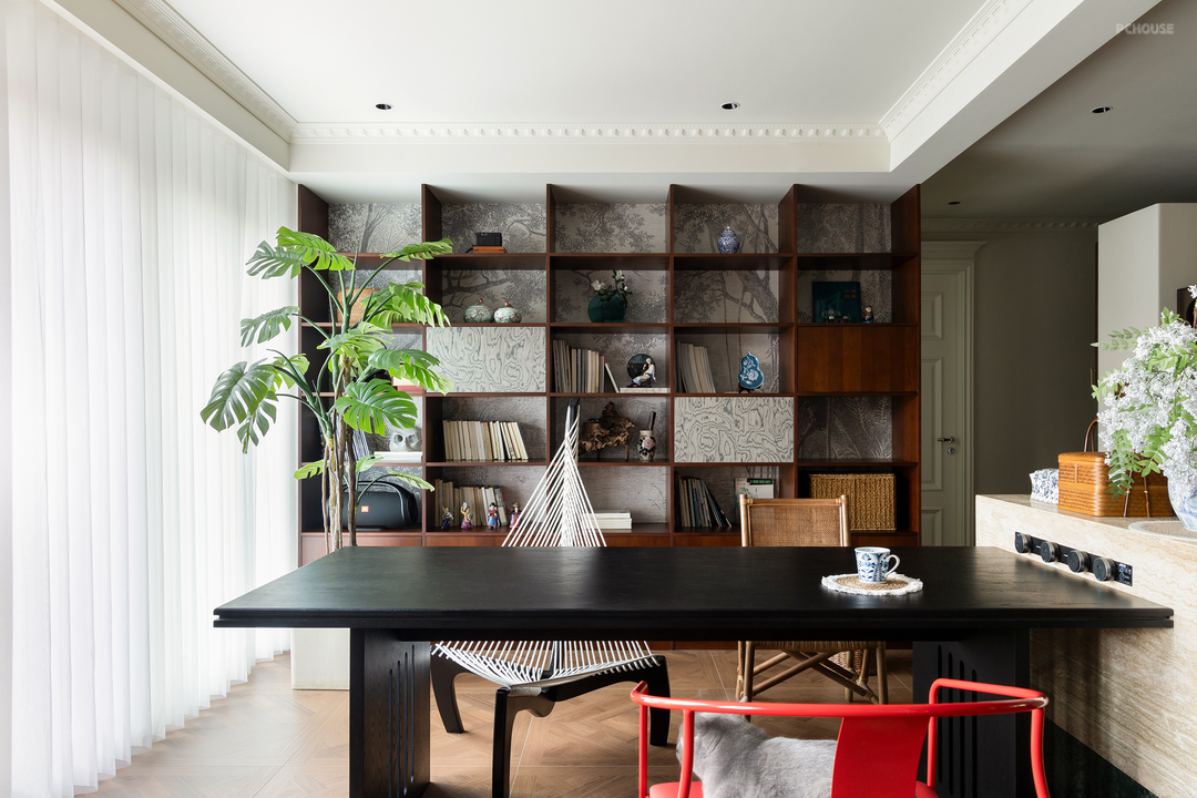 从事服装设计的屋主需要居家工作区,我们在厨房做了一个岛台餐桌,宽大的桌面足以铺展开各种资料,背面做了开放式书架,利用壁纸增添自然意趣。 两只有了年纪的小型犬,小窝直接放在柜子底层,屋主工作时也能照看。