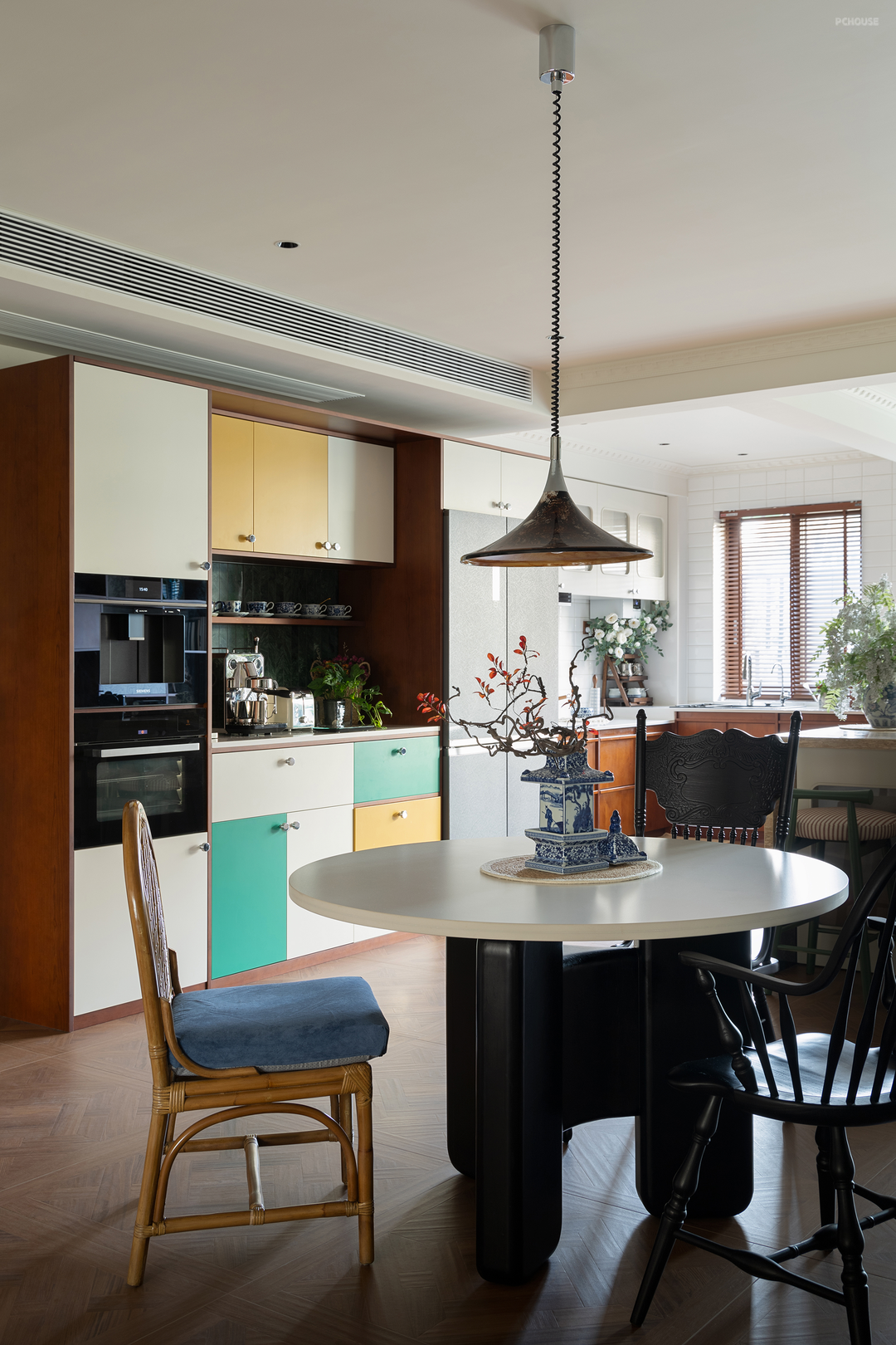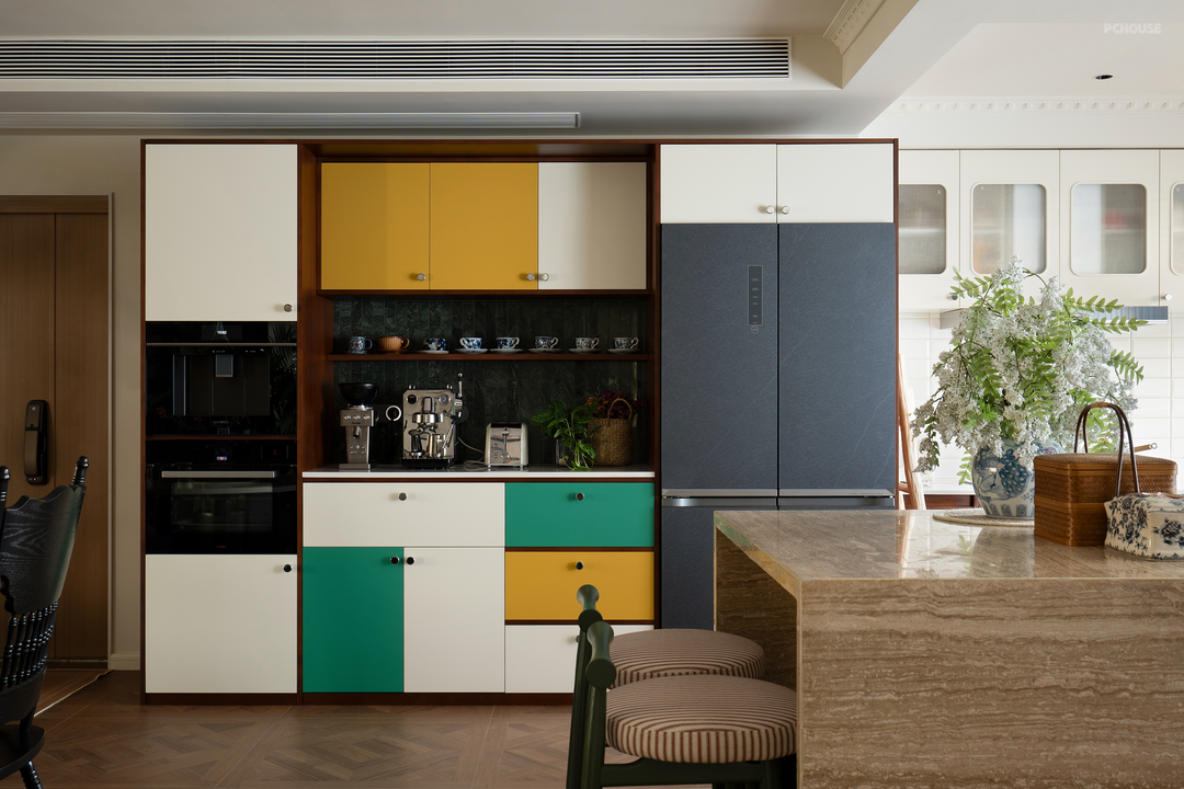 橱柜以外,餐厨还有两组柜体,一组柜子做水吧台,将冰箱、直饮机等电器集中到这里。木框包裹,几面柜门跳色,简洁有趣。