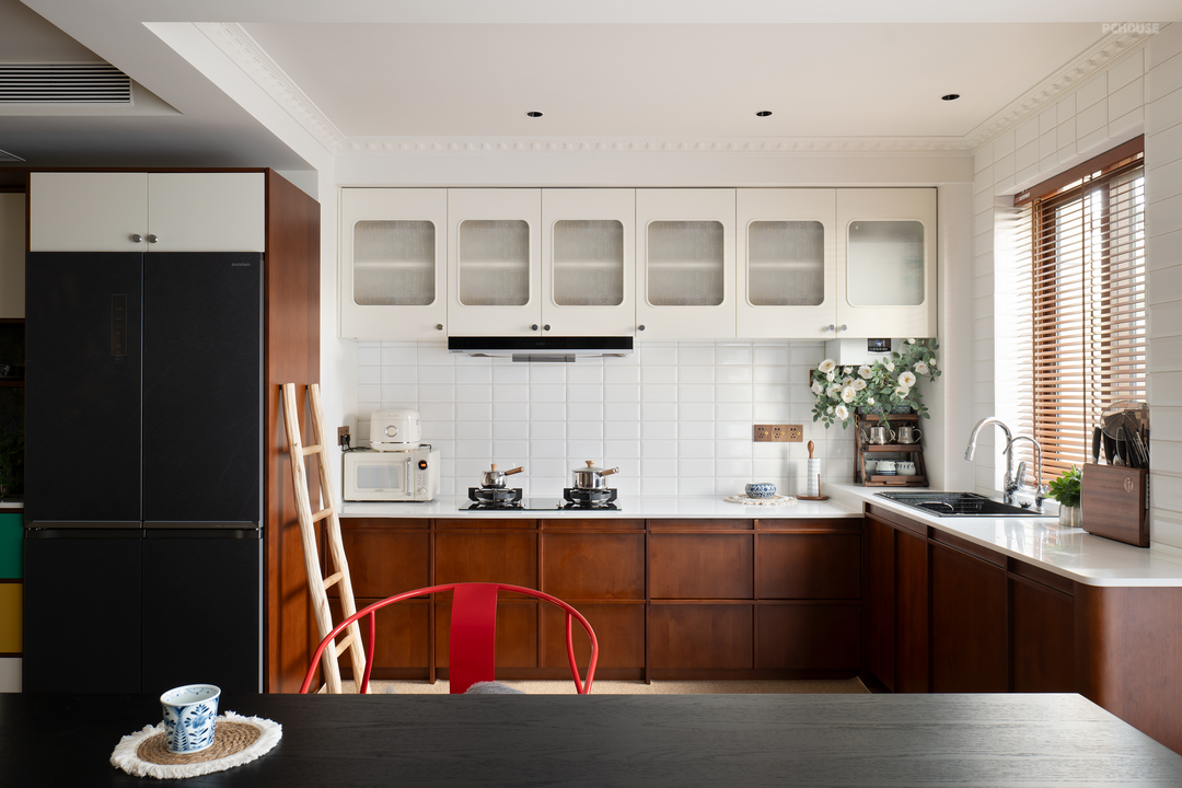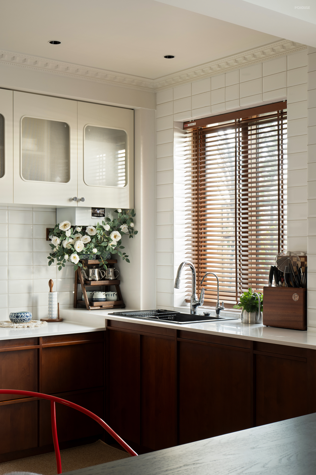 厨房用带有中古感的骨骼线橱柜搭配干净简约的小白砖,清新感迎面而来。