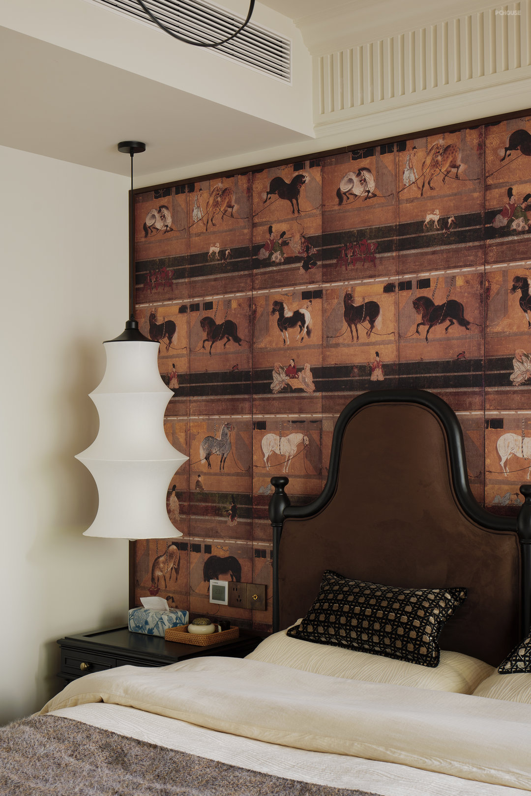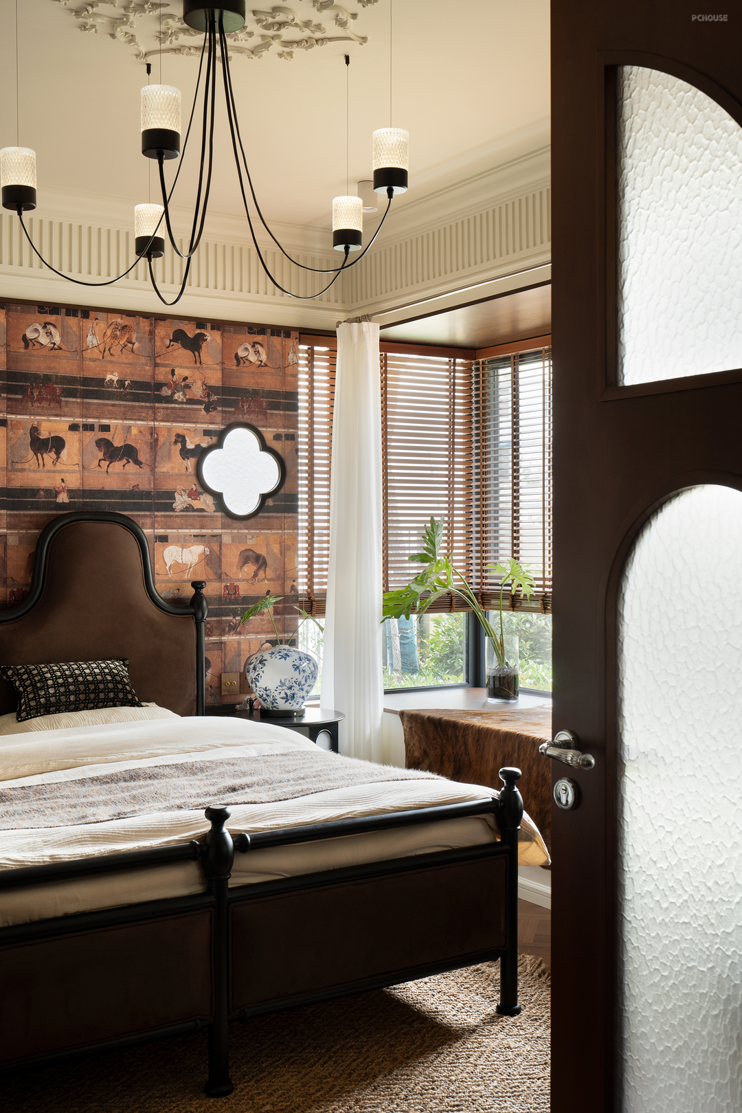 床头用大幅唐风壁纸搭配丰富的软装,营造休闲的南洋氛围。软装适当加入黑色,起到平衡作用,增强视觉冲击的同时让空间更为和谐。