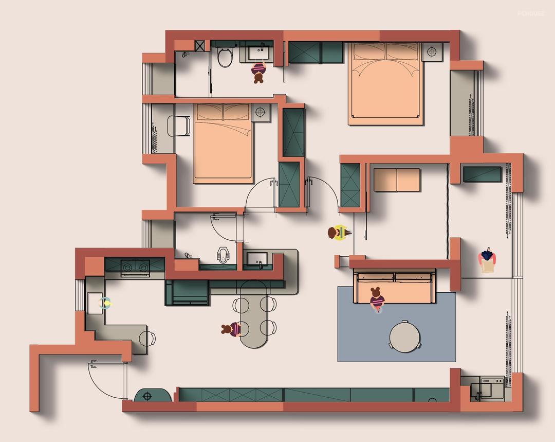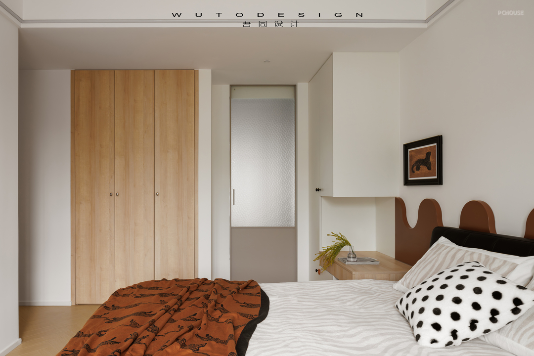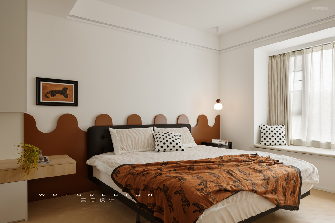 主卧的设计以白色与咖色的柔和交融,呈现出像融化巧克力冰淇淋般的波浪形态,加以樱桃蛋糕形态的灯具点缀,温暖而治愈~
