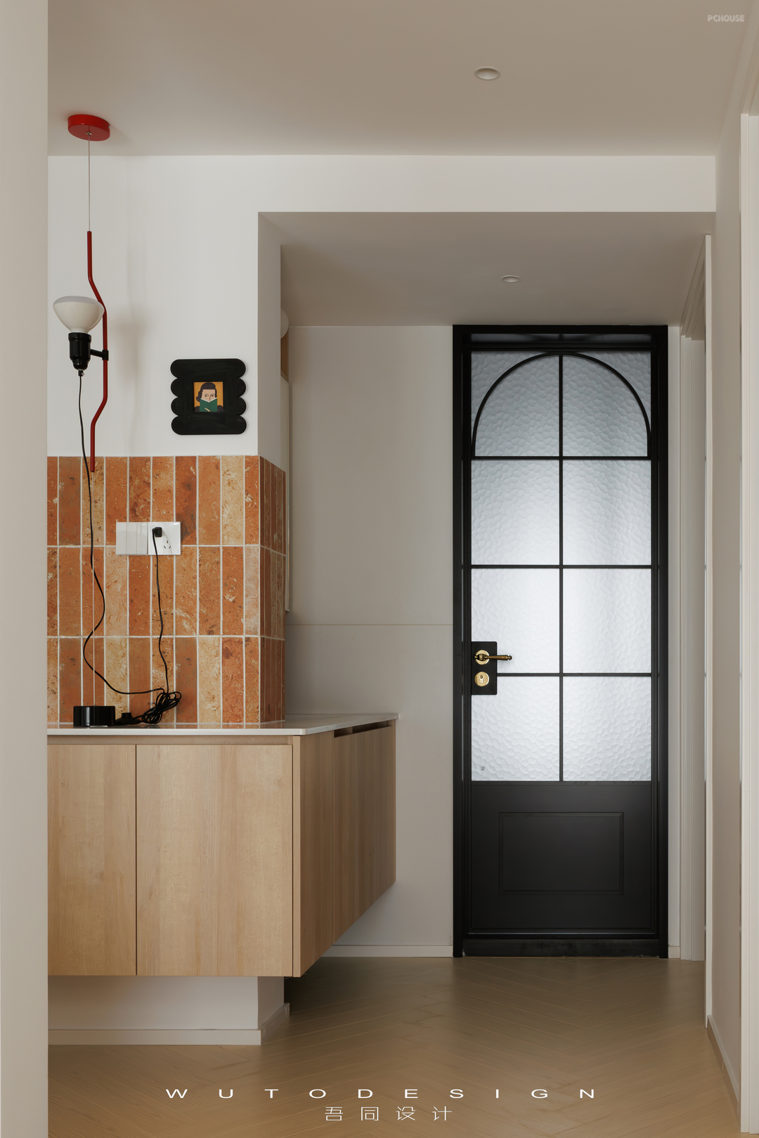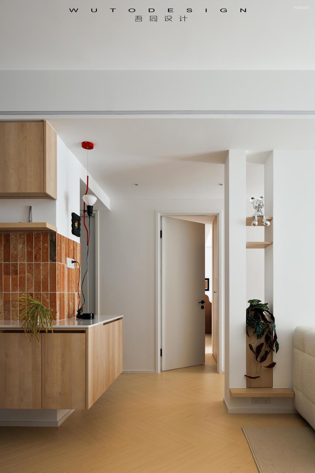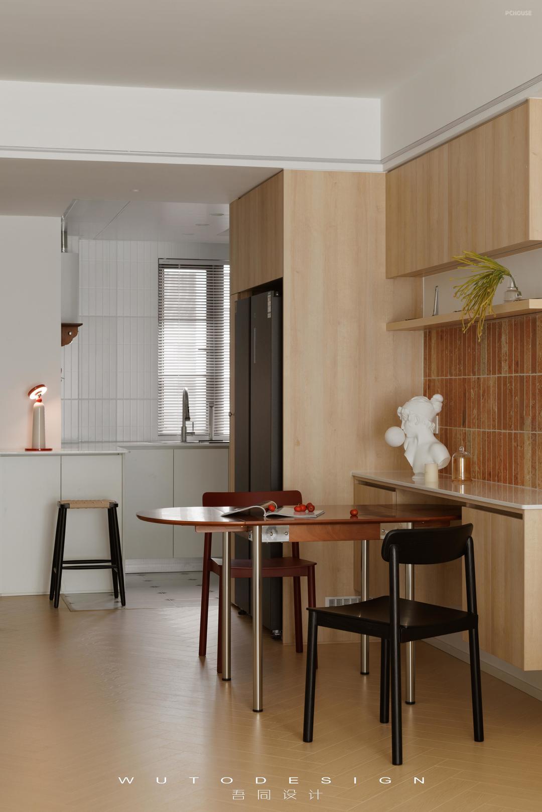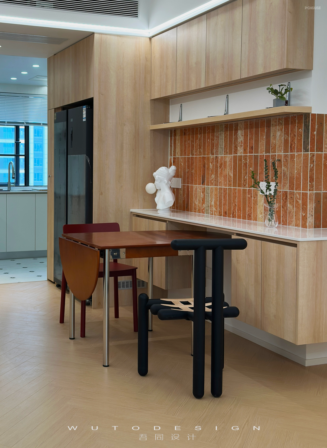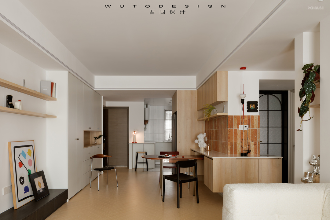 入户处的小吧台既是折叠换鞋凳,又是空间的分割者,悄然为餐厅与厨房划出一道柔和的界限。