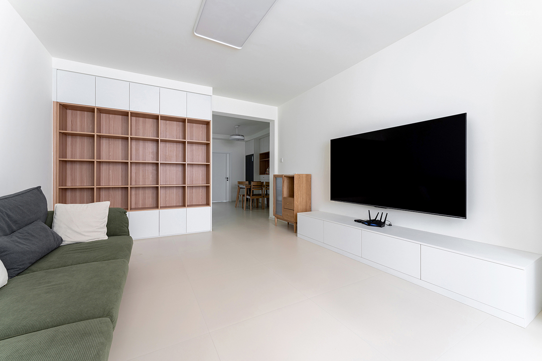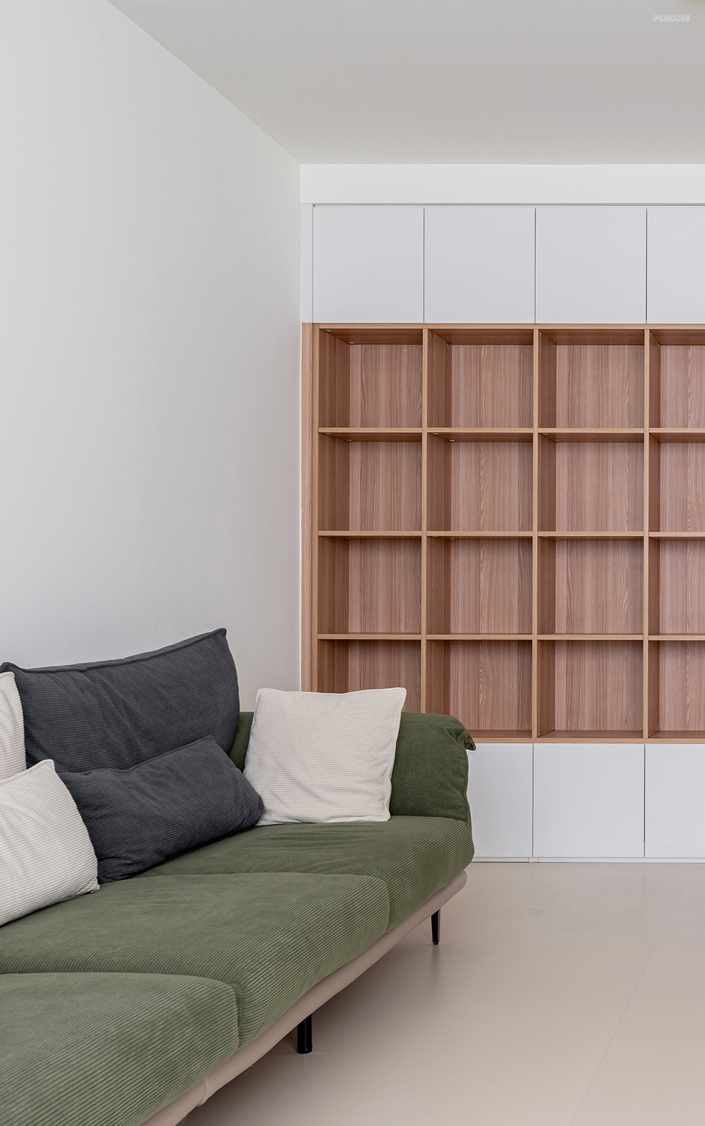 客厅做了一组到顶书柜,厚度35cm。开放格放置书籍方便拿取,高处和低处都用了封闭柜门,避免灰尘堆积。地柜部分也方便小朋友收纳自己的玩具。利用储物书柜结合,给家里带来干净整洁的体验~
