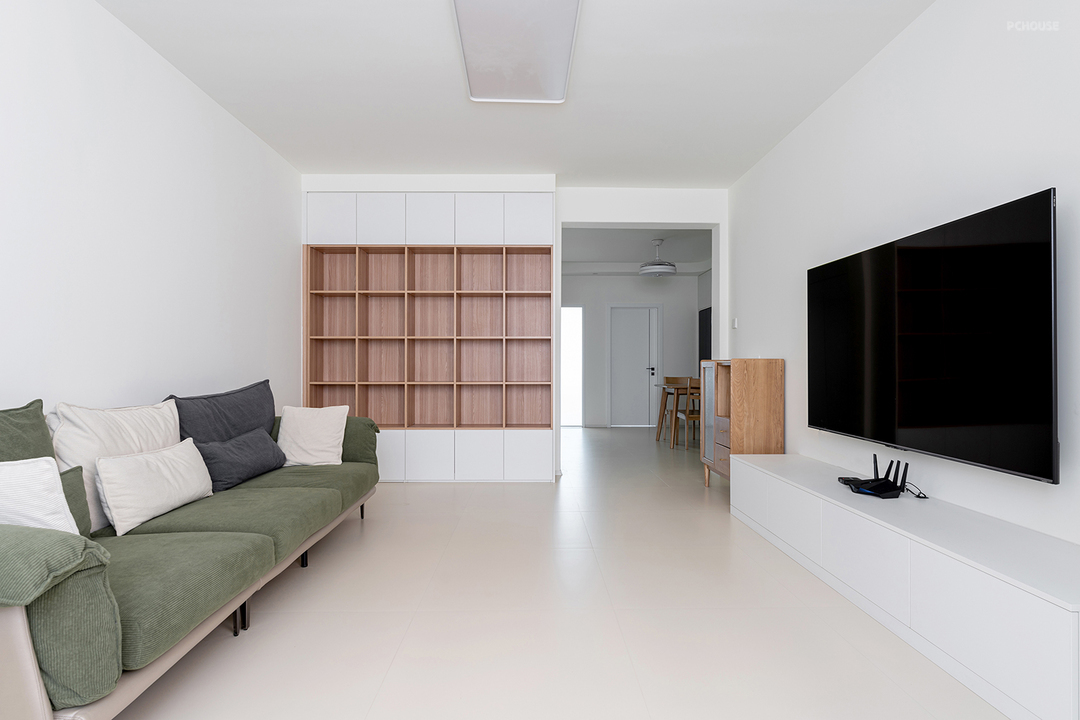 客厅整体极简原木风,治好强迫症。大面积用白色乳胶漆进行留白,家具的造型也选择横平竖直,点缀自然地木色。体块间的层次感,带来别样的美。