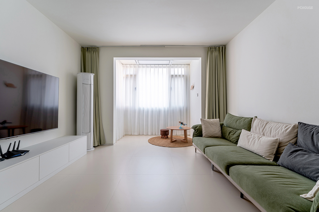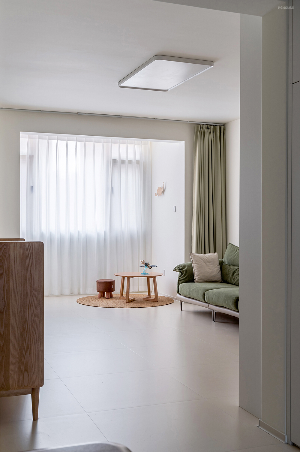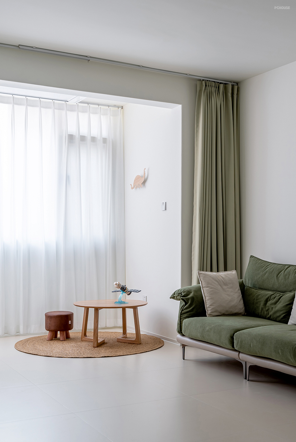 沙发选择大面积绿色,其它软装搭配米白浅色,丰富空间的色彩。窗帘选择奶白色,搭配透光不透人的纱帘,让整个空间更加舒适,打进来柔和的光线,互动的每个瞬间都是幸福的~