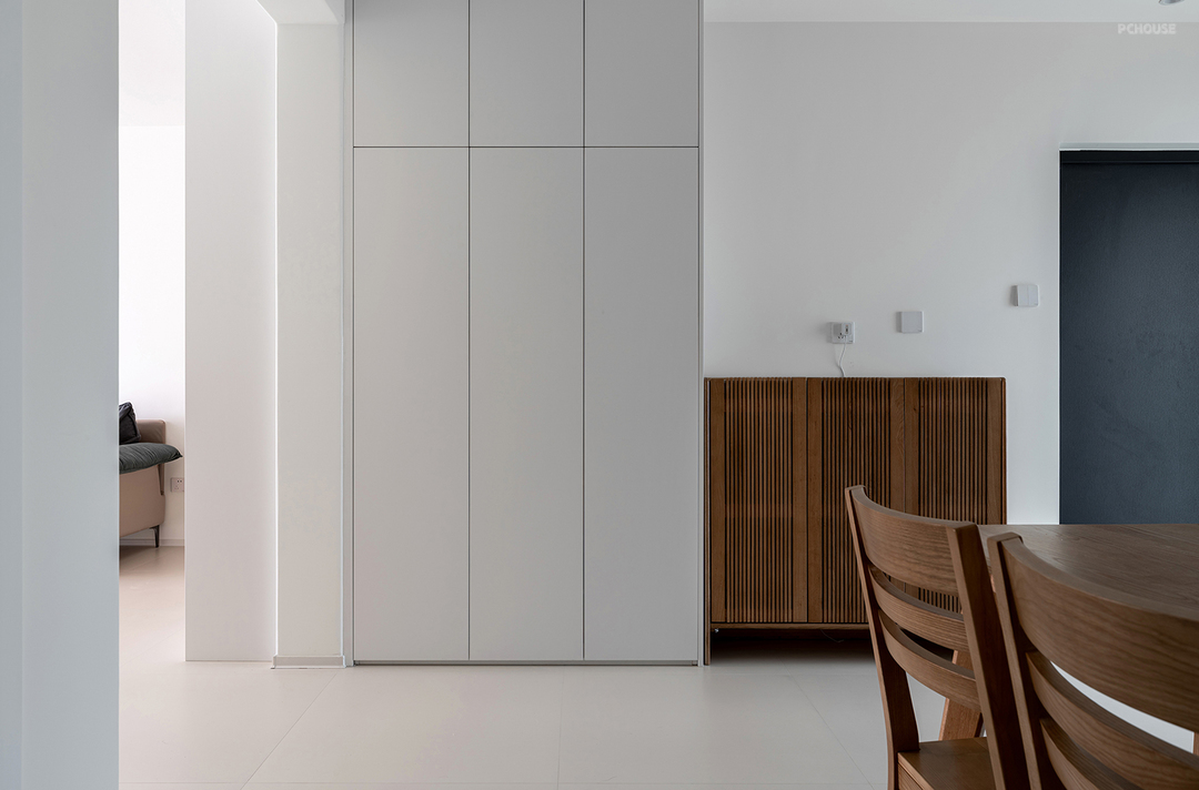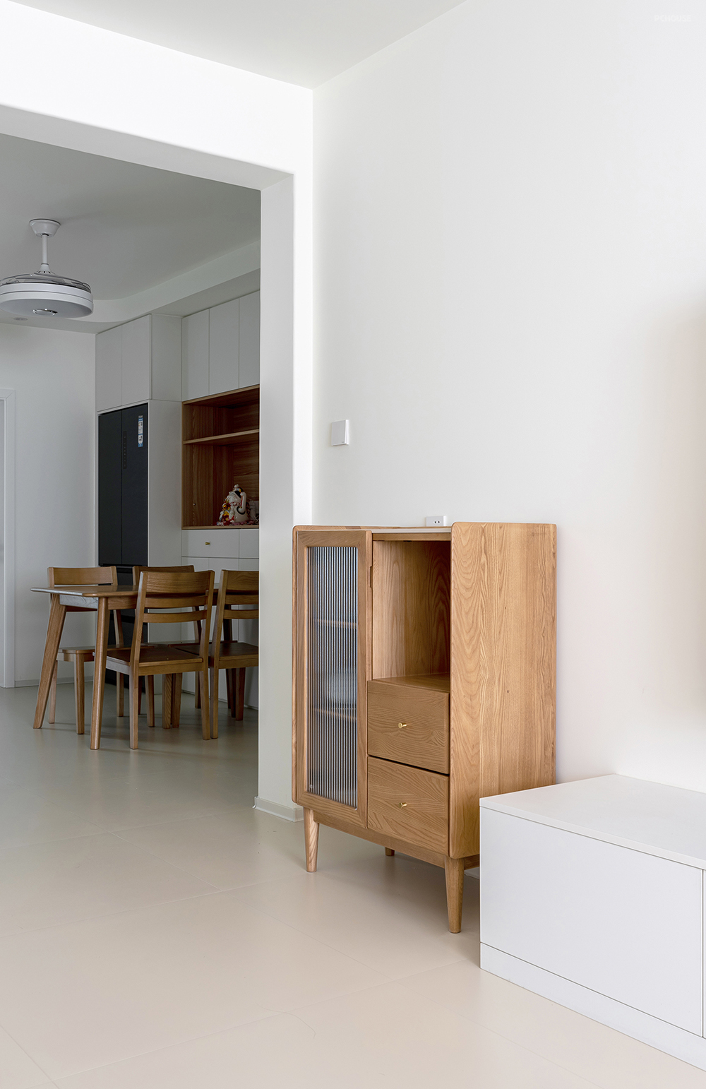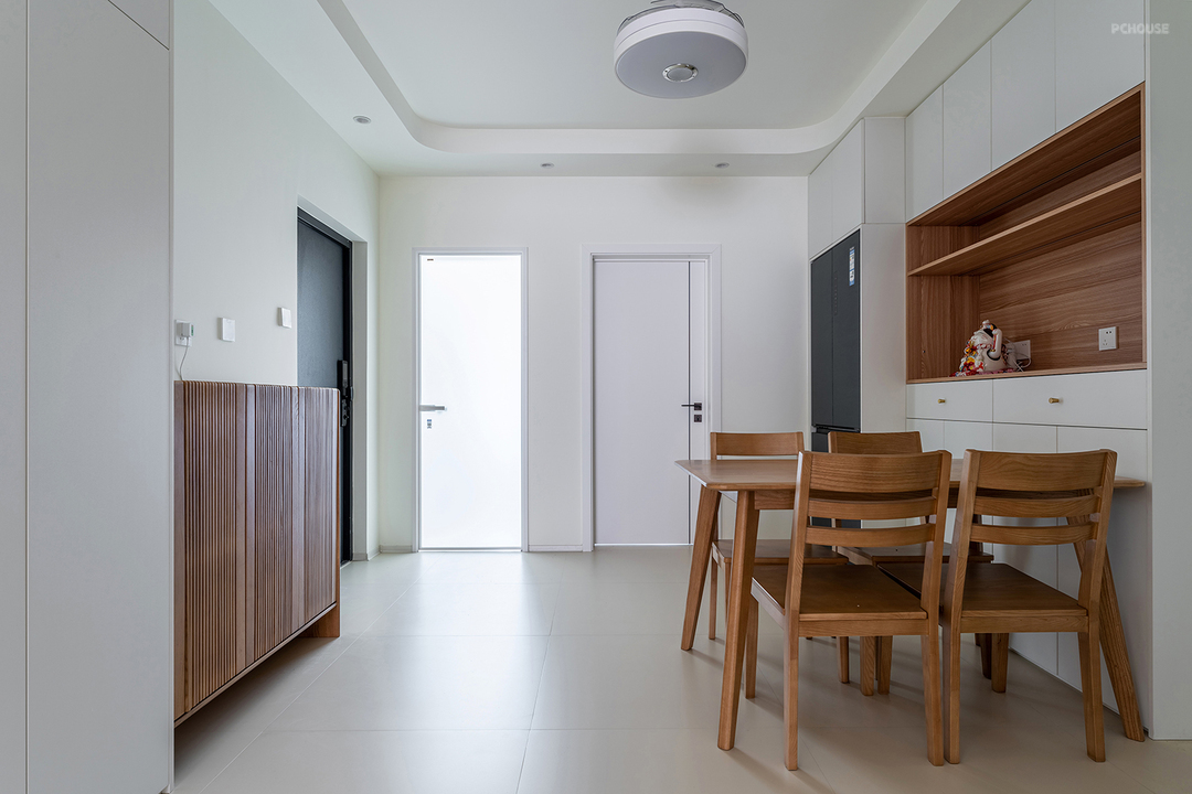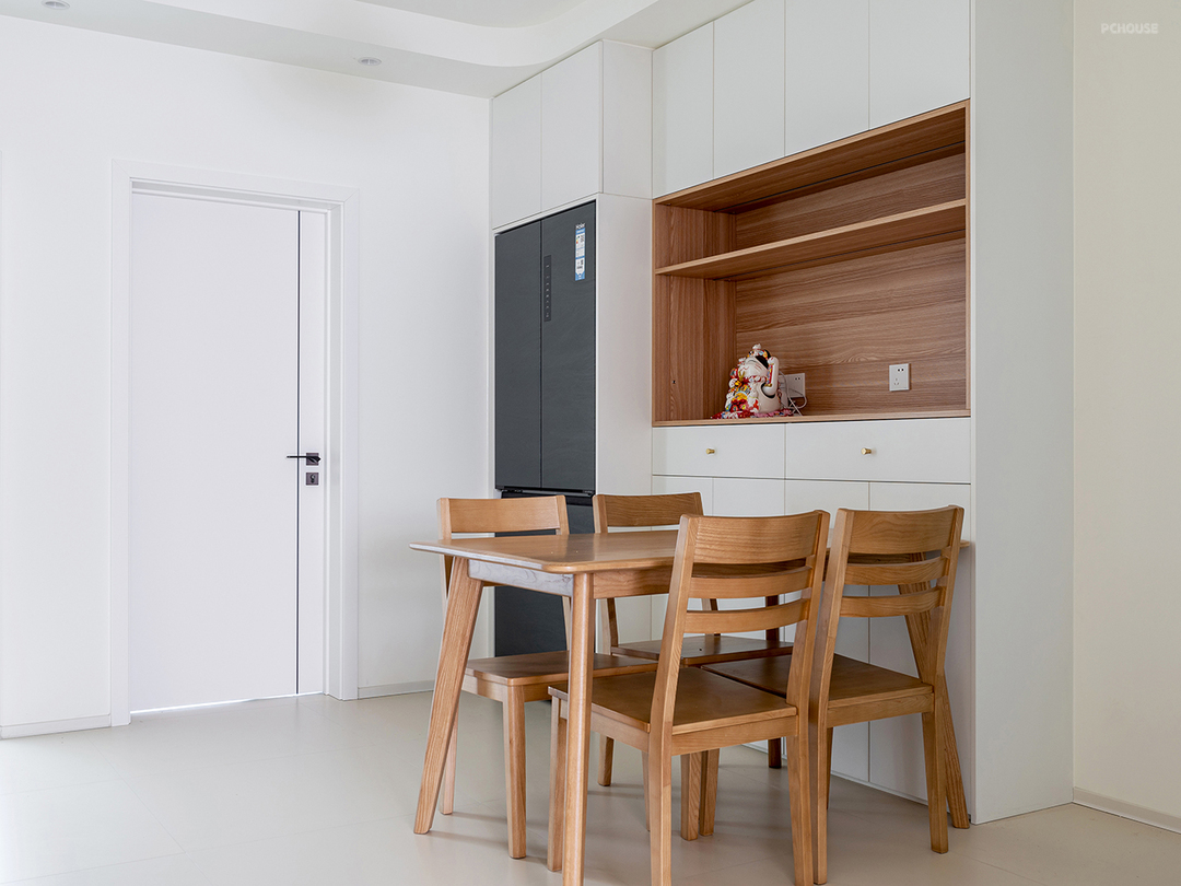 就餐区的餐桌和收纳紧靠,原木色餐桌和白色柜体搭配,颜值与使用感都很搭!
