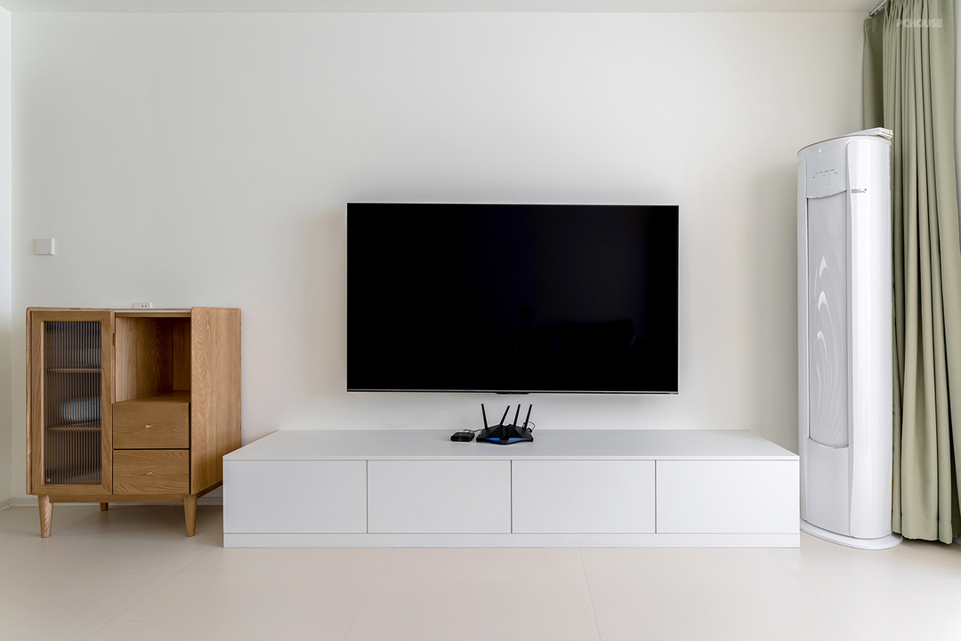 客厅电视柜选择长240cm*宽40cm,空调电视柜选择色调与墙面一致,减少多色彩体块,整体干净整洁。