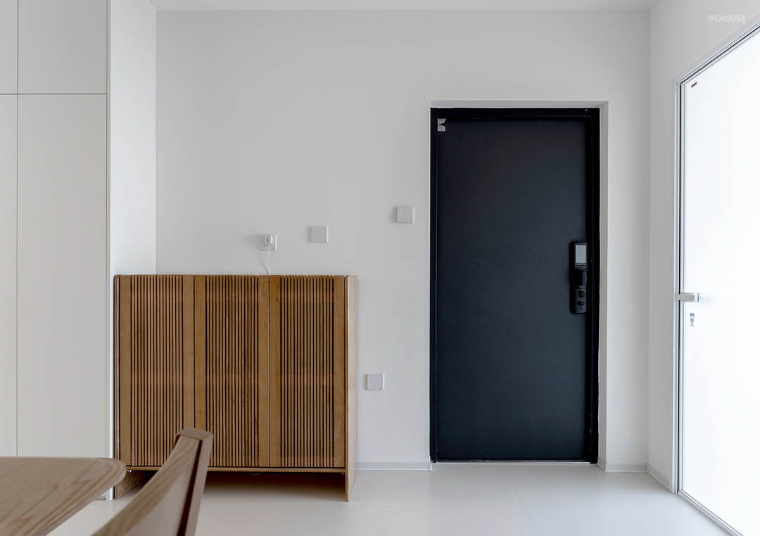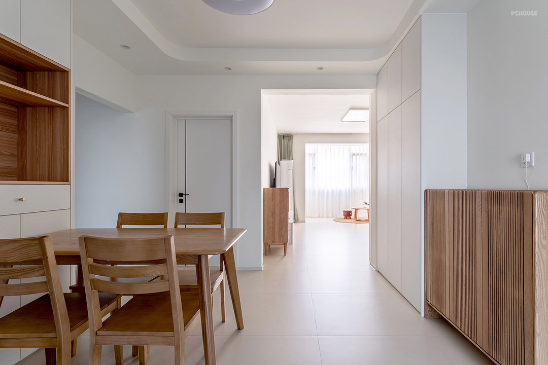 玄关对面就是餐厅区域,餐桌、鞋柜、起居室的边柜,都统一选择原木色相呼应,整个空间贯穿着又很和谐统一。