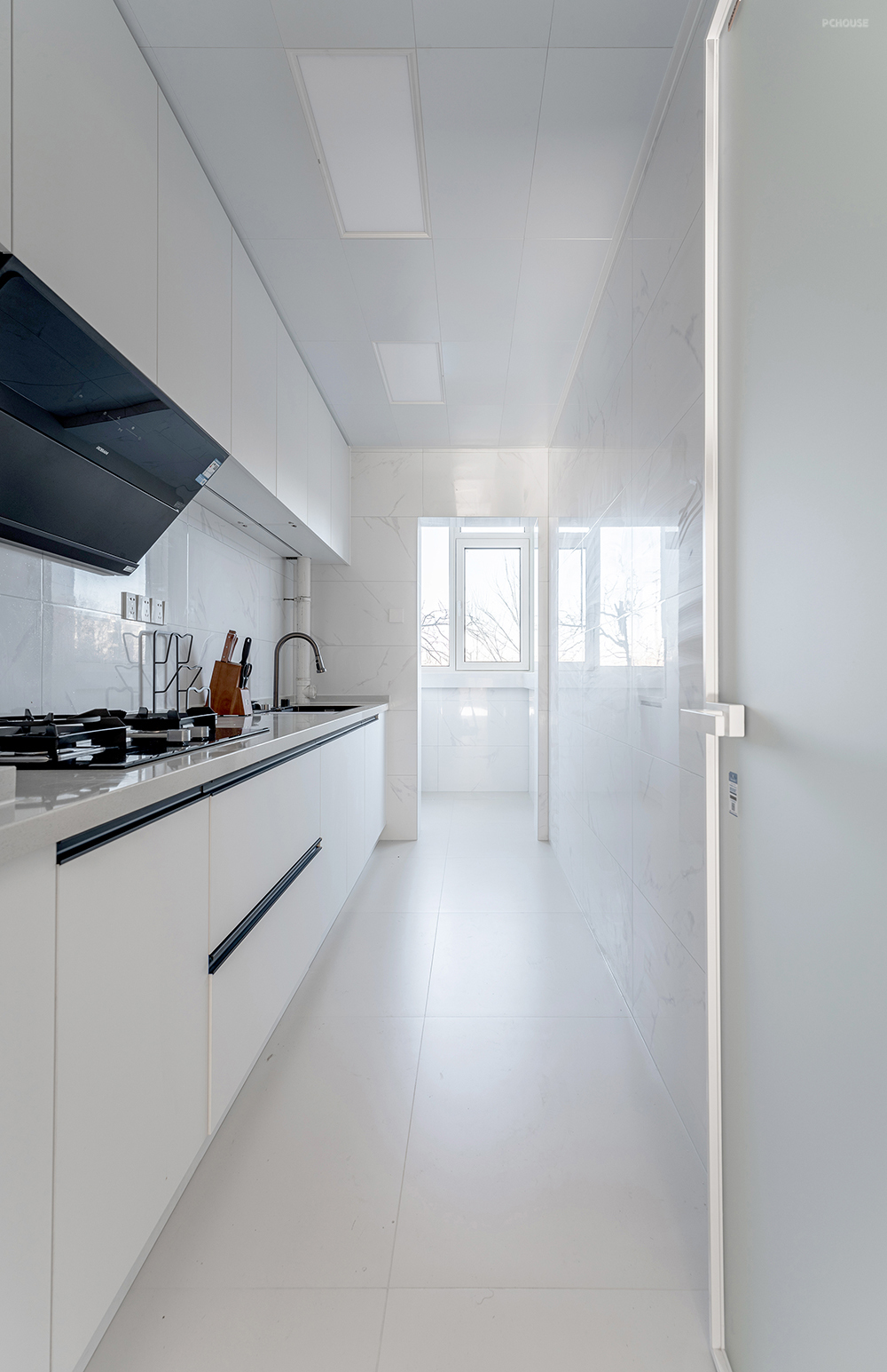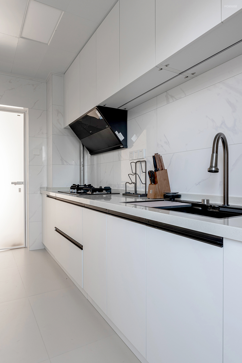颜值和高效可兼得,一字型动线洗、切、炒、盛一气呵成,台面以上加装灯带,可以照亮整个操作台,不怕背光。上方整面墙做35cm深吊柜,增加厨房的储物收纳。整体奶白色为主,沉浸式准备餐食。