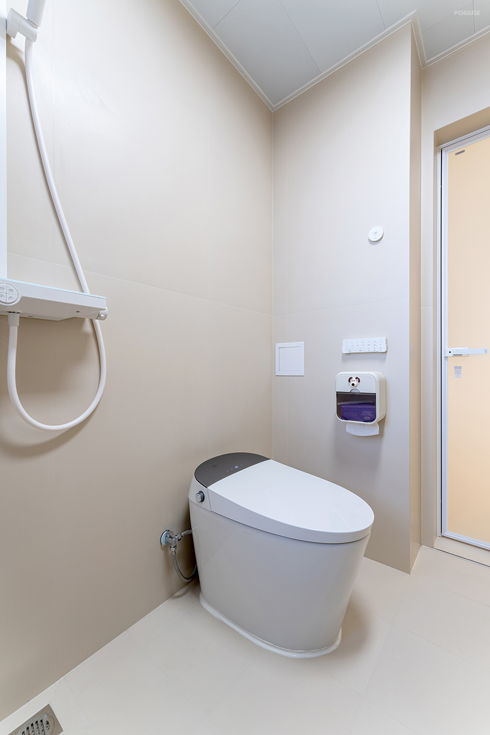 顶面使用铝扣板吊顶拼接安装,简洁大气还很方便维修。整体选择暖白色瓷砖通铺,在花洒洁具也优先考虑的白色。营造出明亮的空间,使用时也更有舒适感。