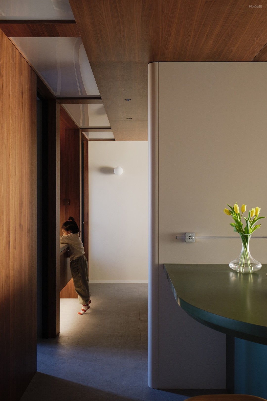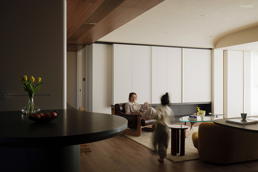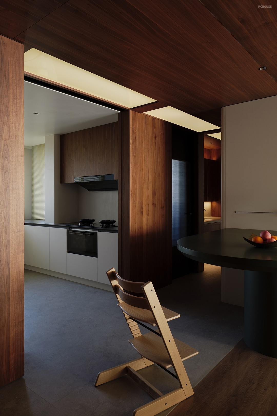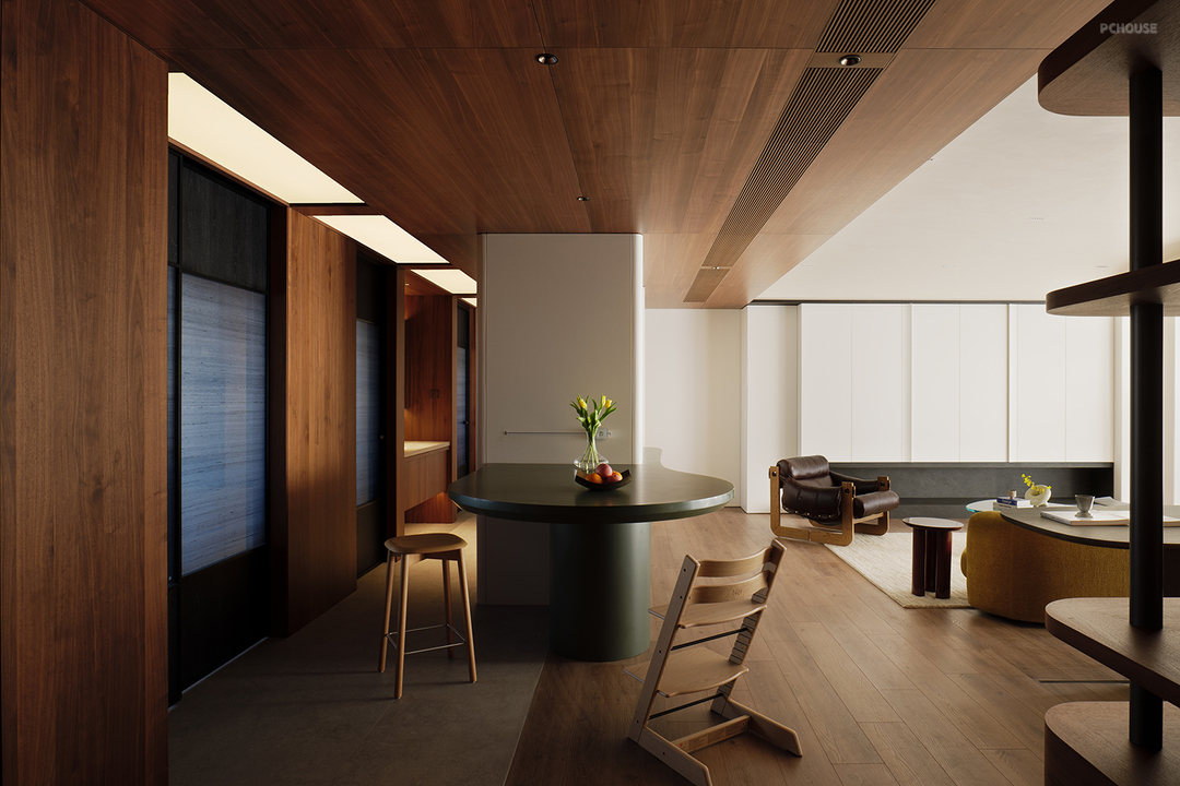 在顶面切出一条灯膜优化此处的灯光环境,满足不同的场景需求,面向开敞明亮的客厅和餐厅,这是家人互动最为密集的区域。