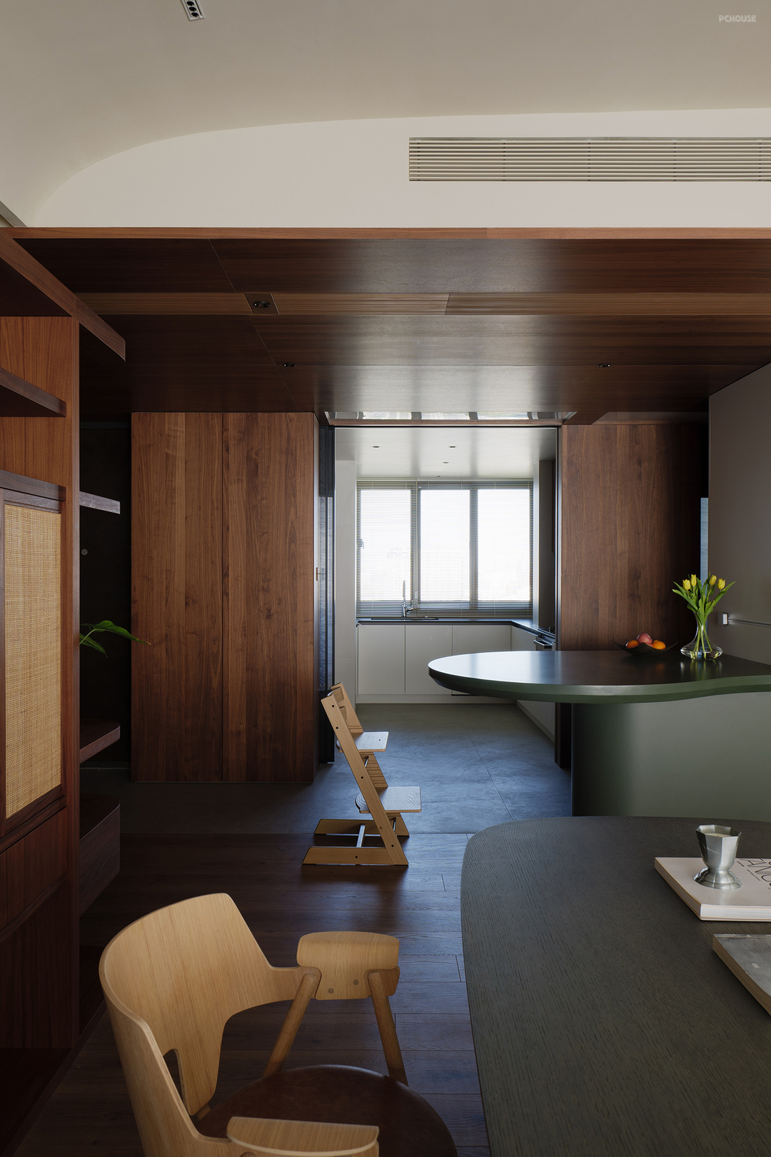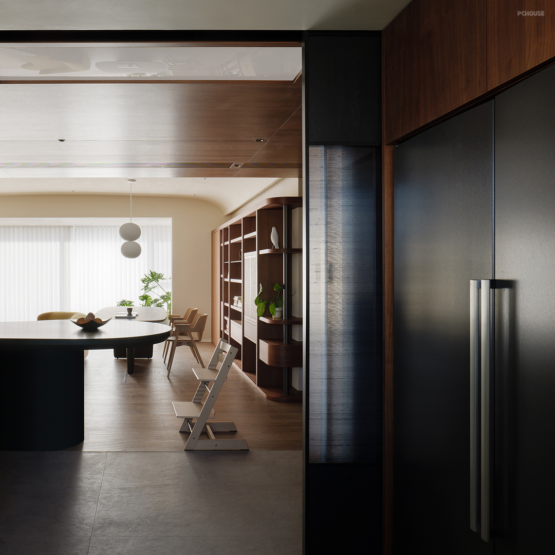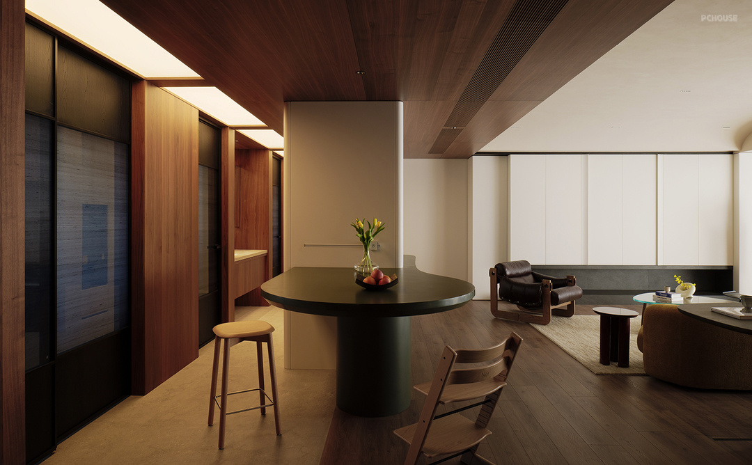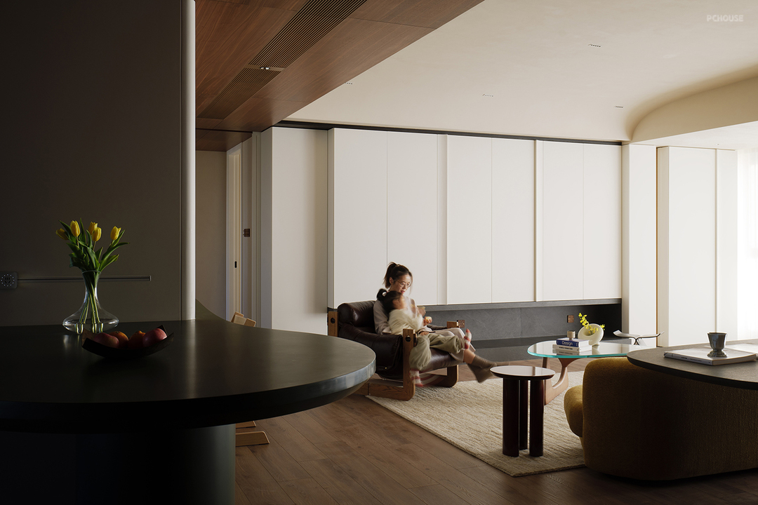 在顶面切出一条灯膜优化此处的灯光环境,满足不同的场景需求,面向开敞明亮的客厅和餐厅,这是家人互动最为密集的区域。