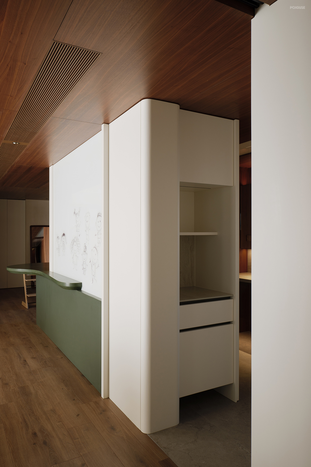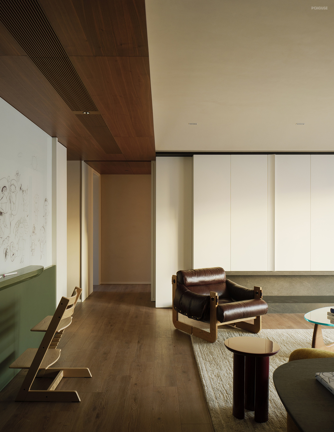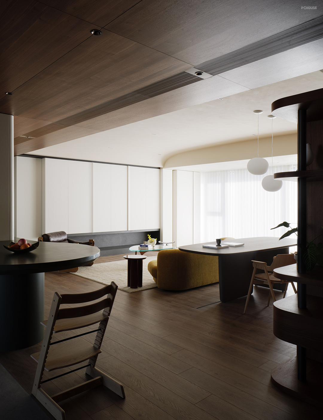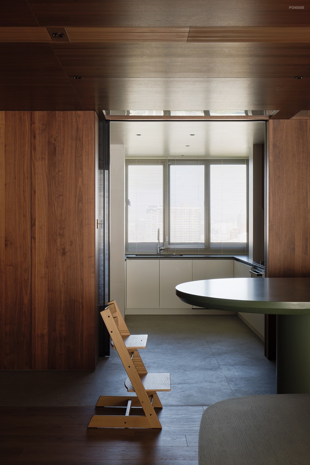 在顶面切出一条灯膜优化此处的灯光环境,满足不同的场景需求,面向开敞明亮的客厅和餐厅,这是家人互动最为密集的区域。