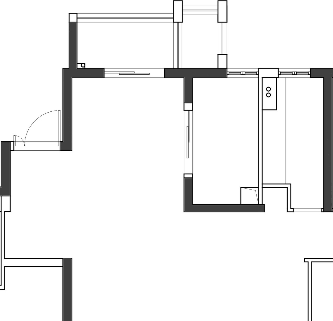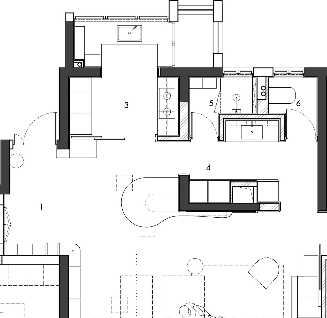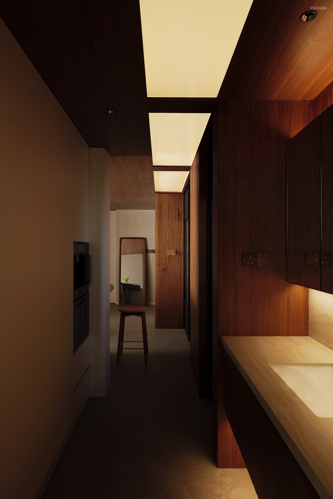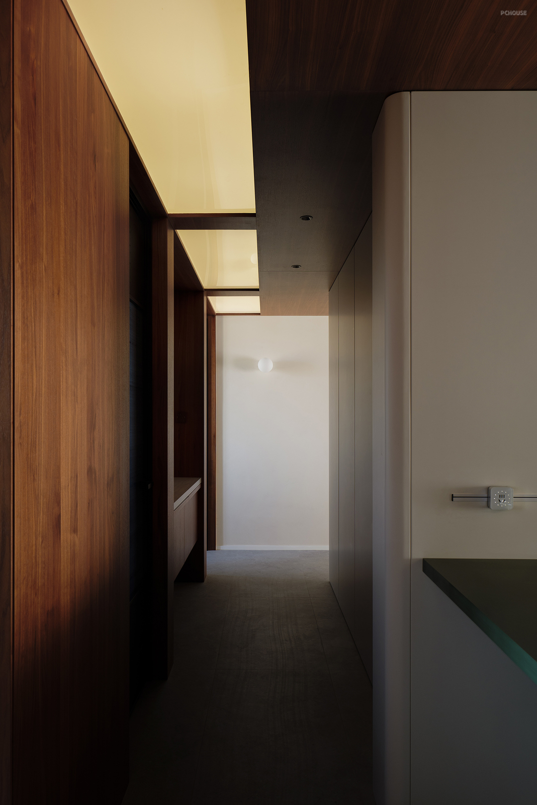 改造后的厨房和卫生间的通道因承重墙遮挡形成暗区是光线处理的重点,空间从入口处开始,视角略过吧台落入一条长廊,长廊的天花板和墙面都覆盖着深色材质。