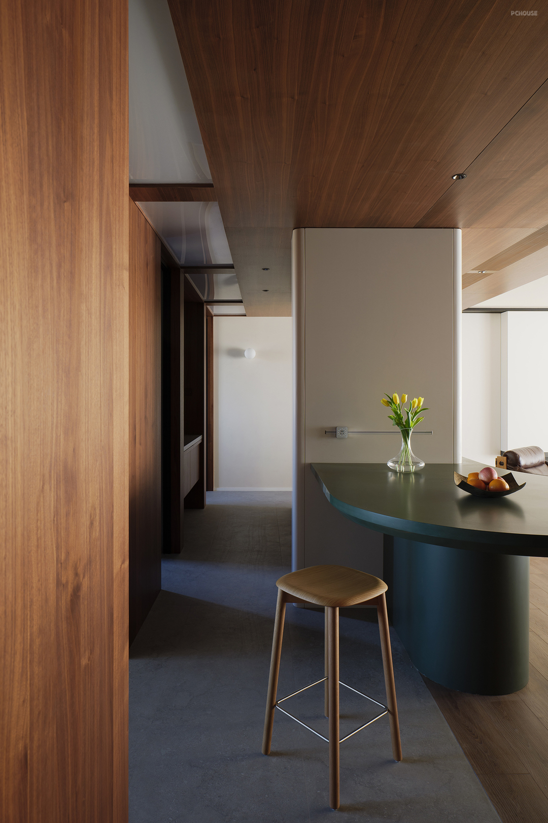 承重墙、高柜、吧台和展示墙的功能组合形成环形动线的同时隔离厨卫门的界面,扩大视线的同时让南北向的空间层次更具节奏。