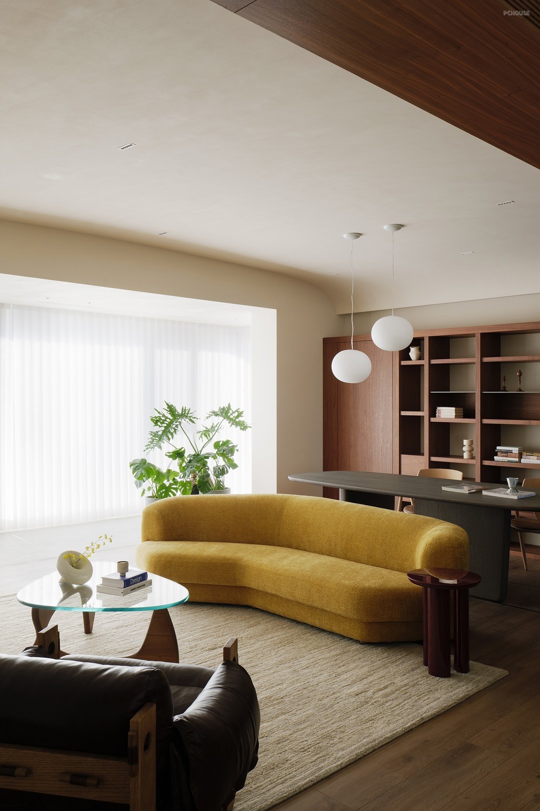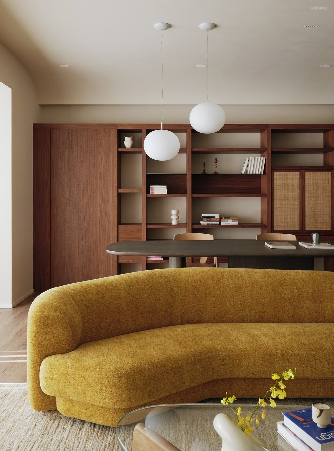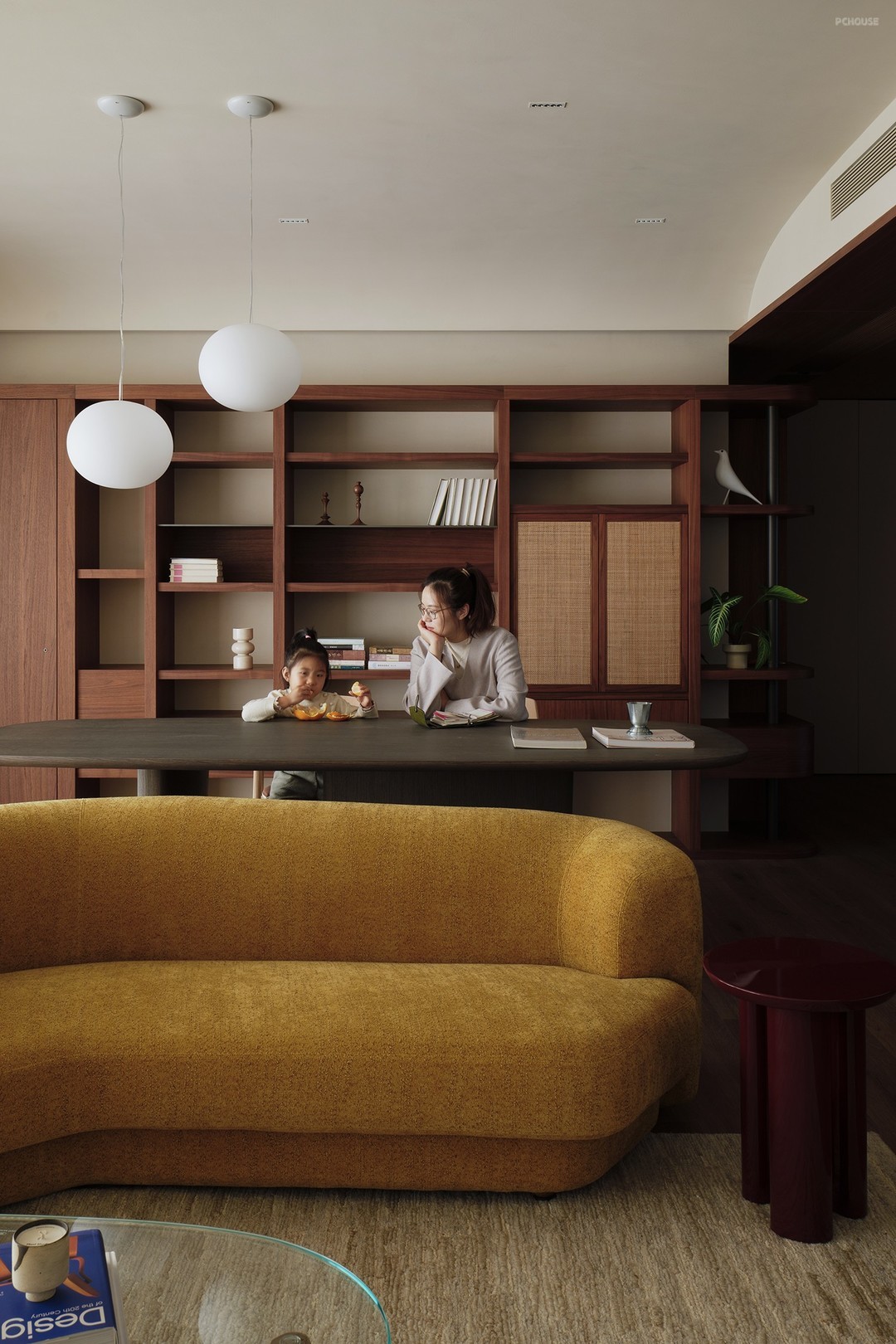 于是设计师利用横厅的优势增加收纳,书桌沙发结合作为空间的主角,平时就餐可以利用吧台,家庭聚会等场合沙发稍加腾挪满足多人用餐。