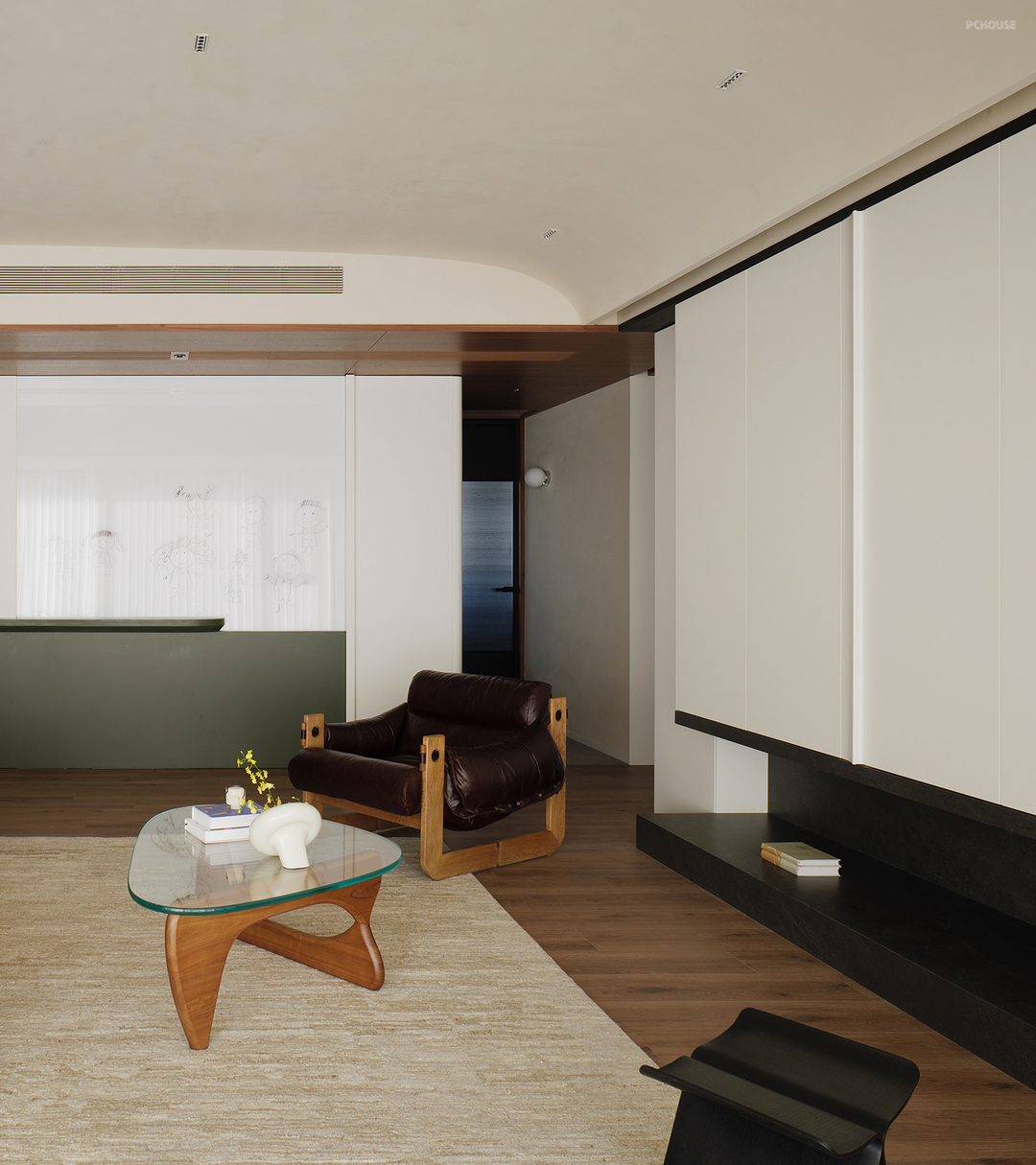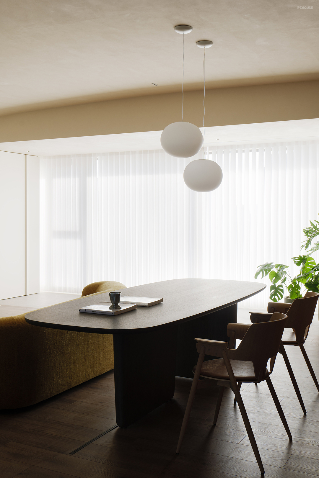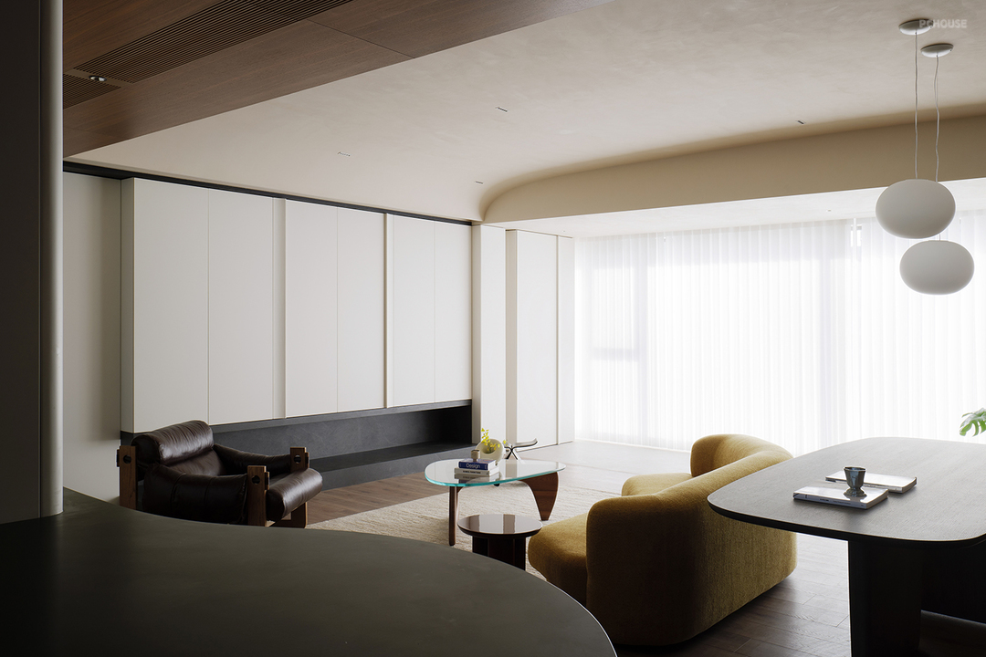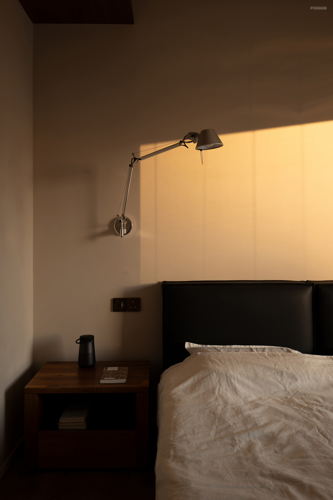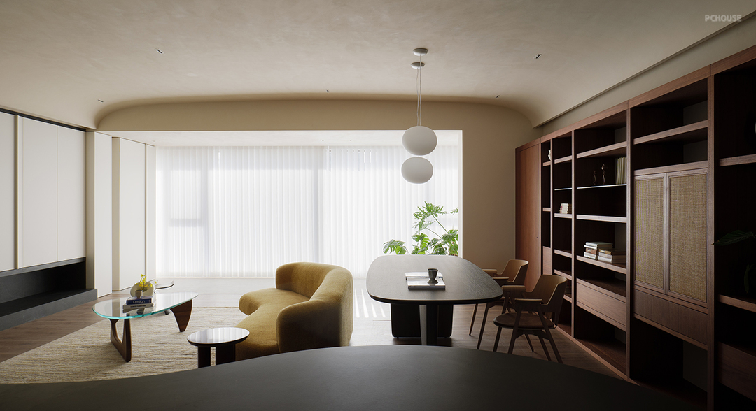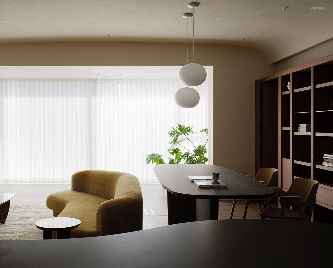 柔软的光透过窗帘,被弧形顶面的艺术涂料吸收再反射,散在空间中,多了些粘稠感,温暖和安静。