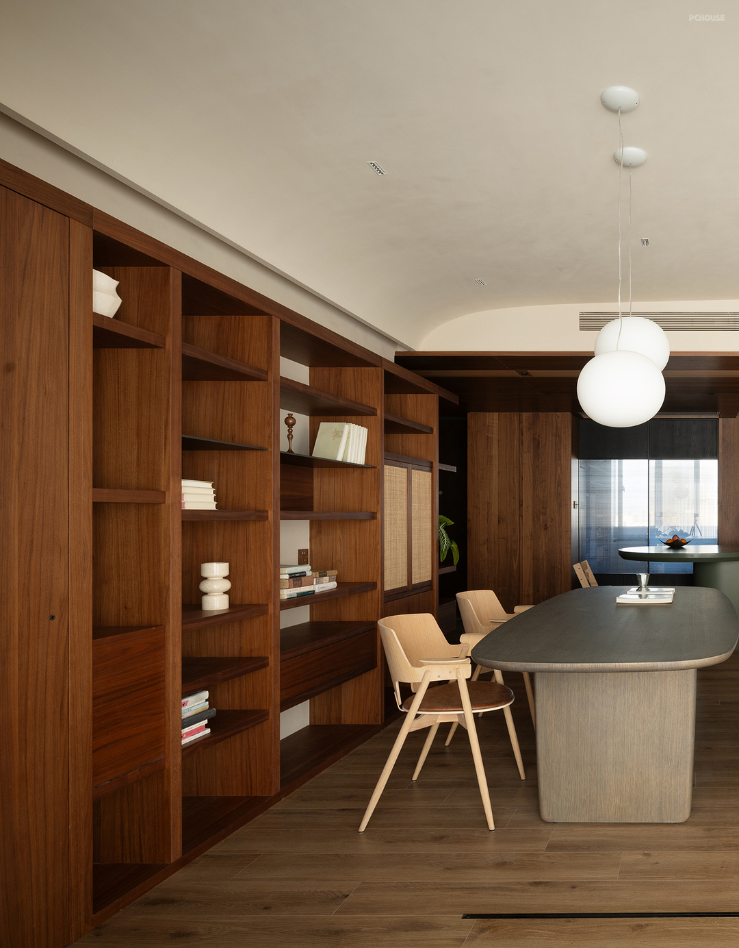 书桌后侧的L形柜体用形式统一功能,一柜三用,整体柜体线条与块面协调比例,虚实对比。