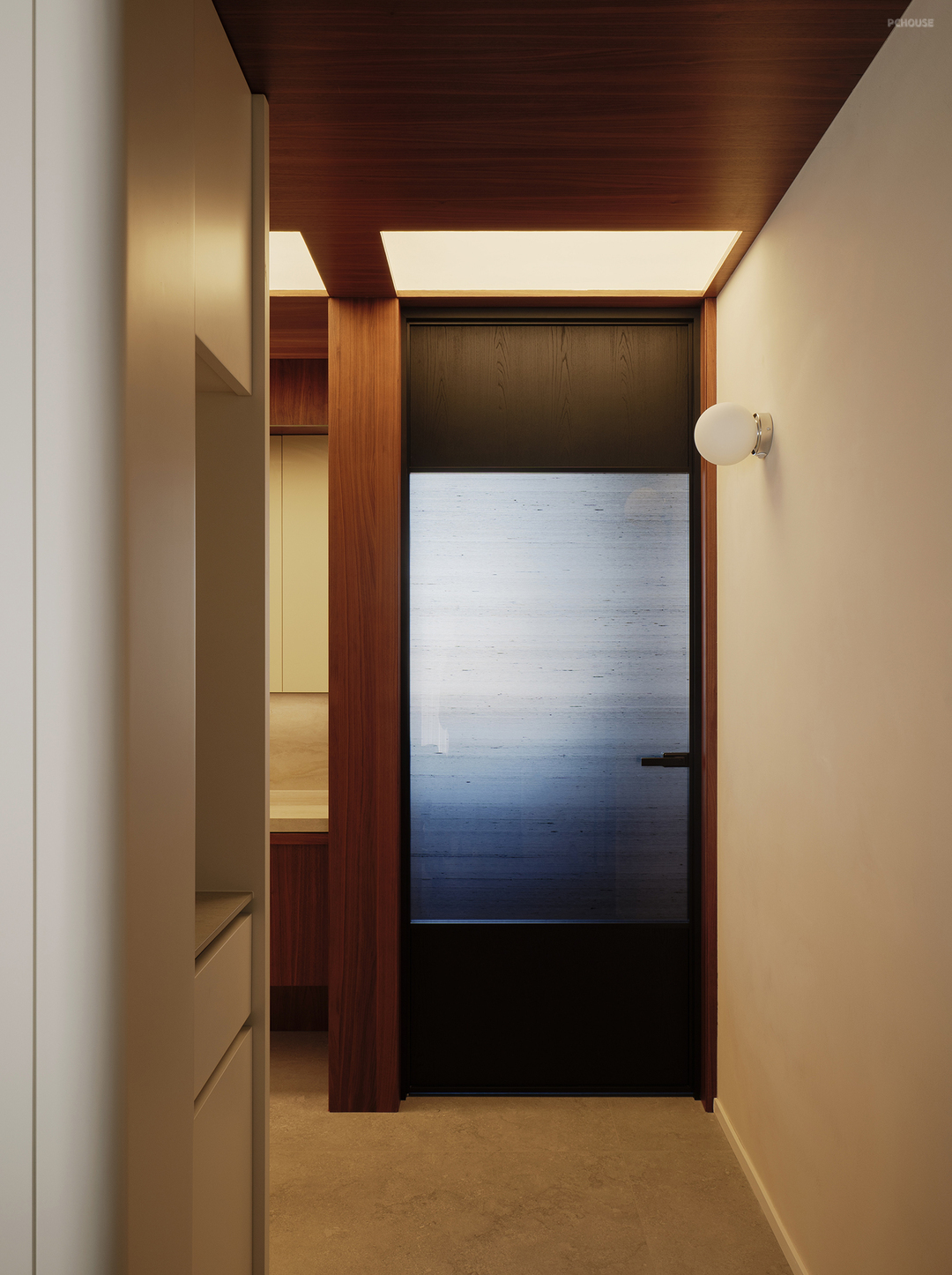 中厨及卫生间的门黑色木饰面+艺术玻璃的组合统一形式和比例,作为公区北向的图底。