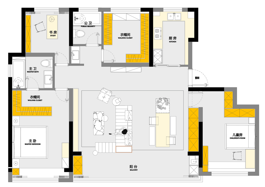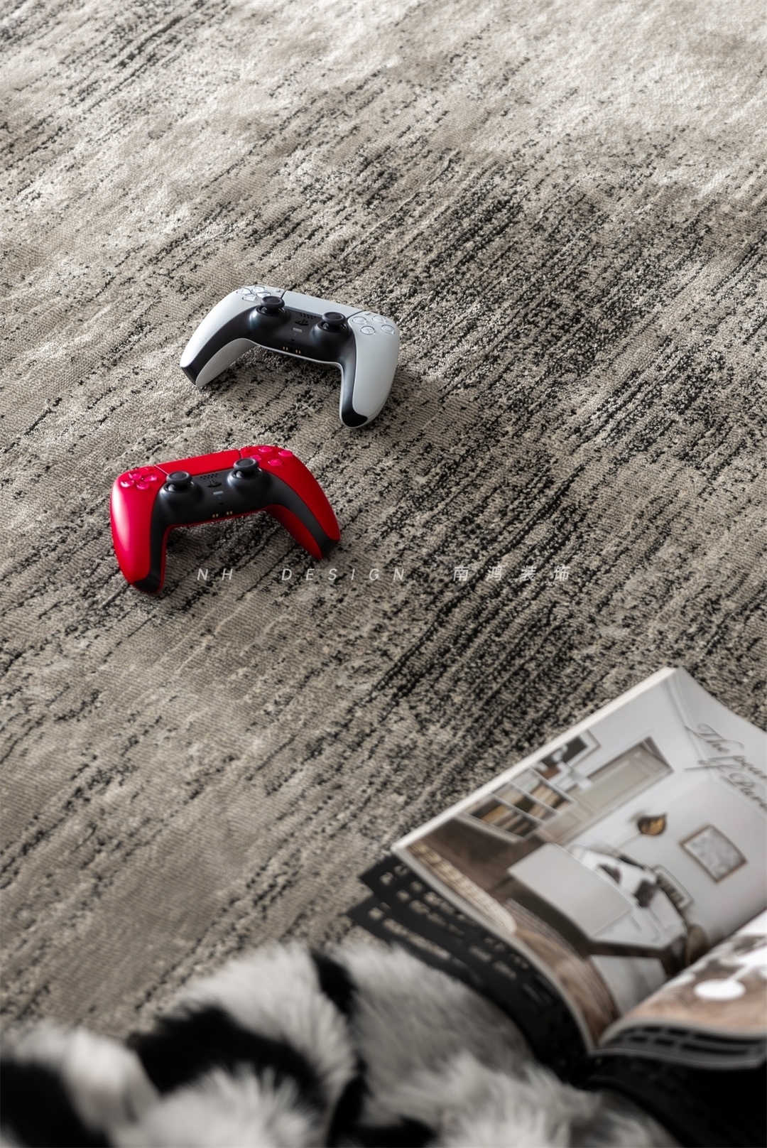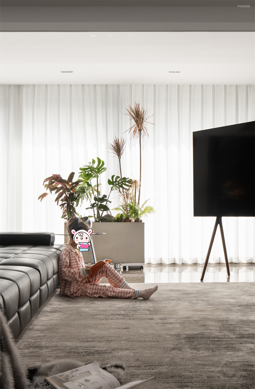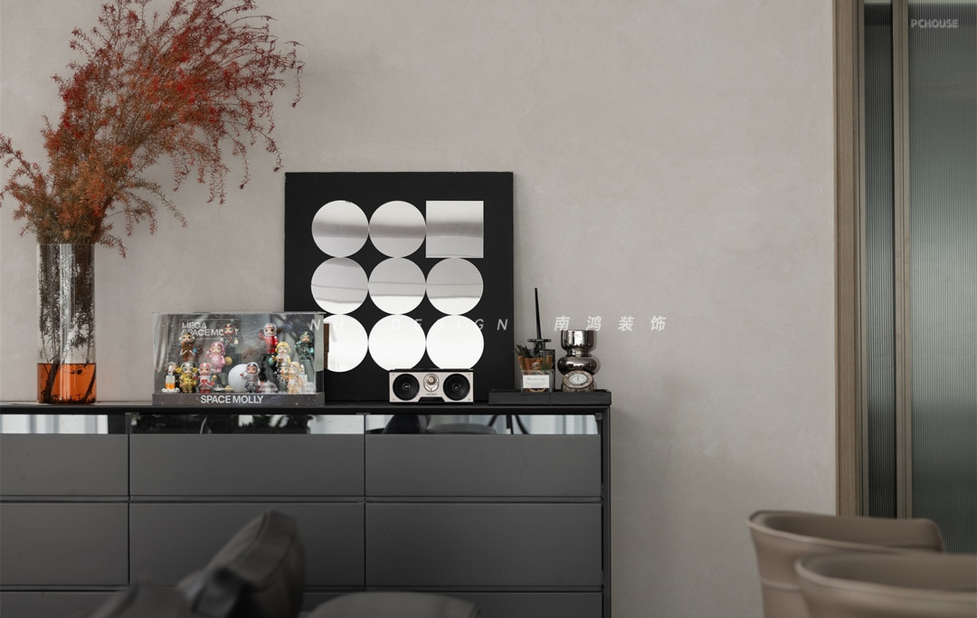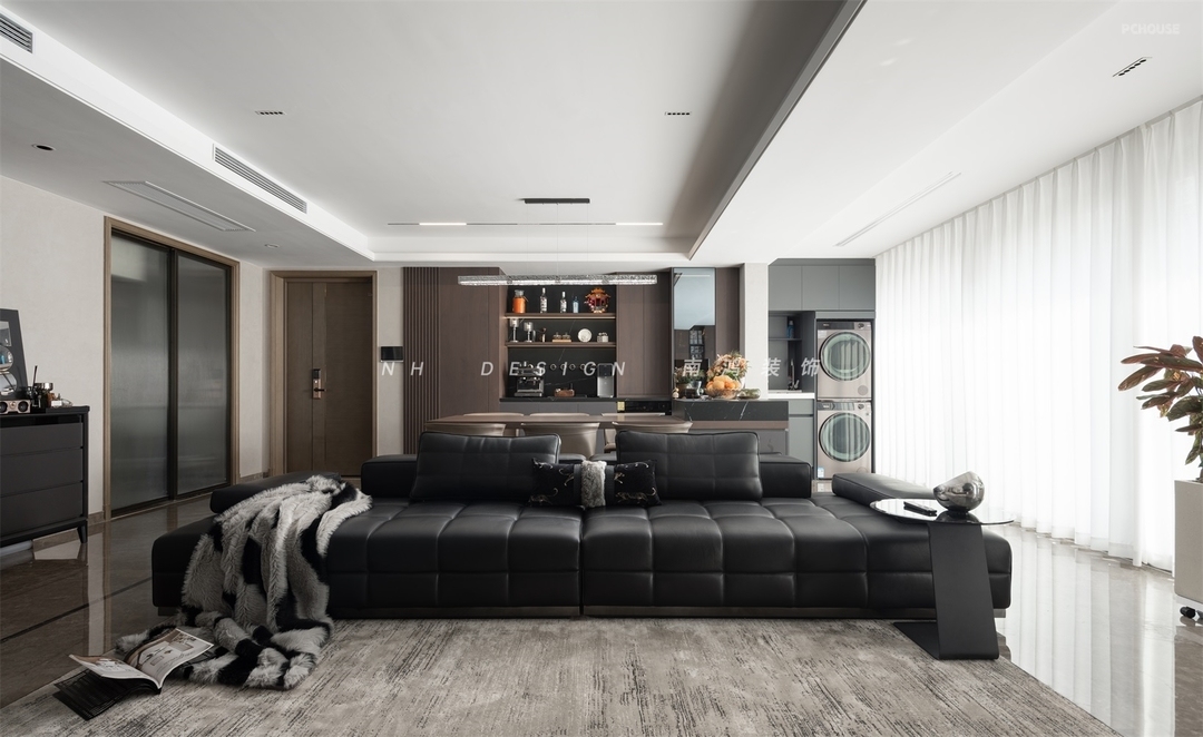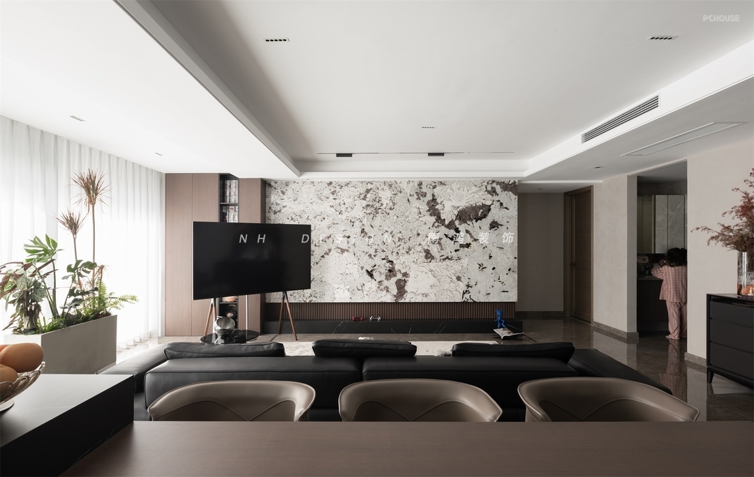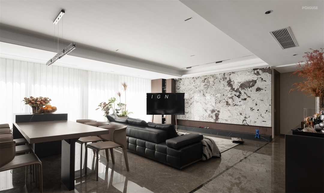 客餐一体开放式横厅格局,为家提供优越的视野、采光以及通风。主背景墙结合格栅底和奢石材料,营造高级氛围。移动式电视取代传统挂墙电视,使用上更灵活。黑色劳伦斯真皮沙发尽显精英气场,轮廓低调却优雅,极富质感。省去传统的大茶几位置,为一家人留出更加宽敞的互动空间。
