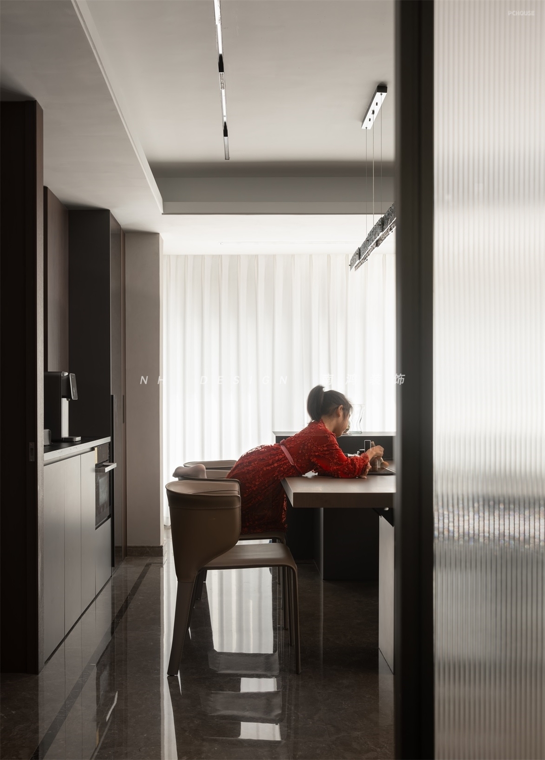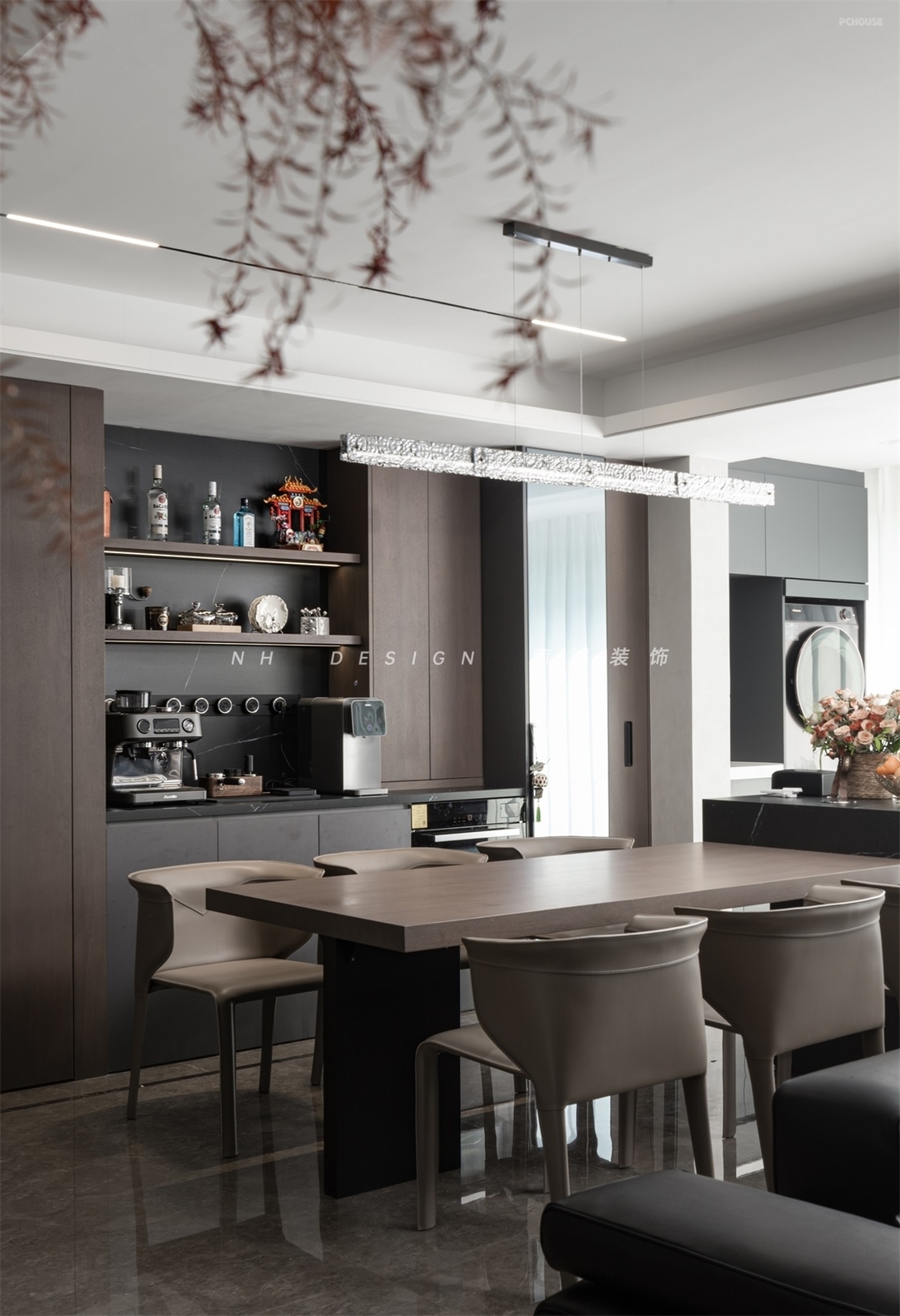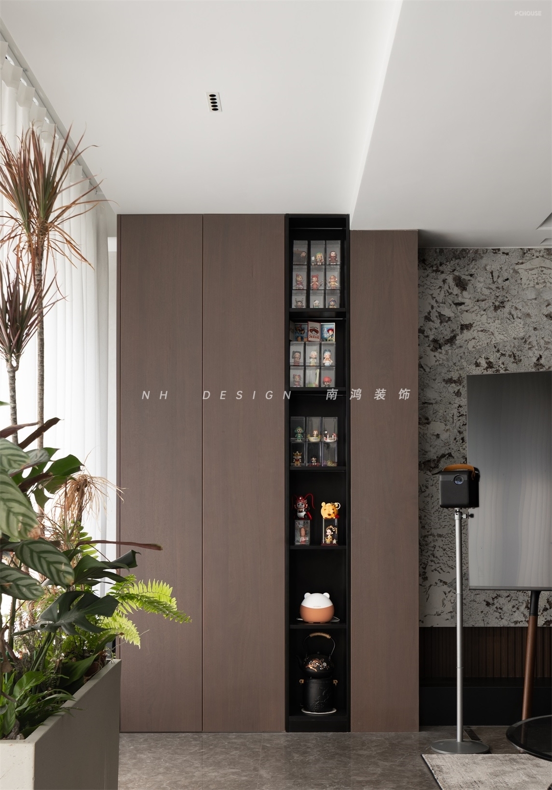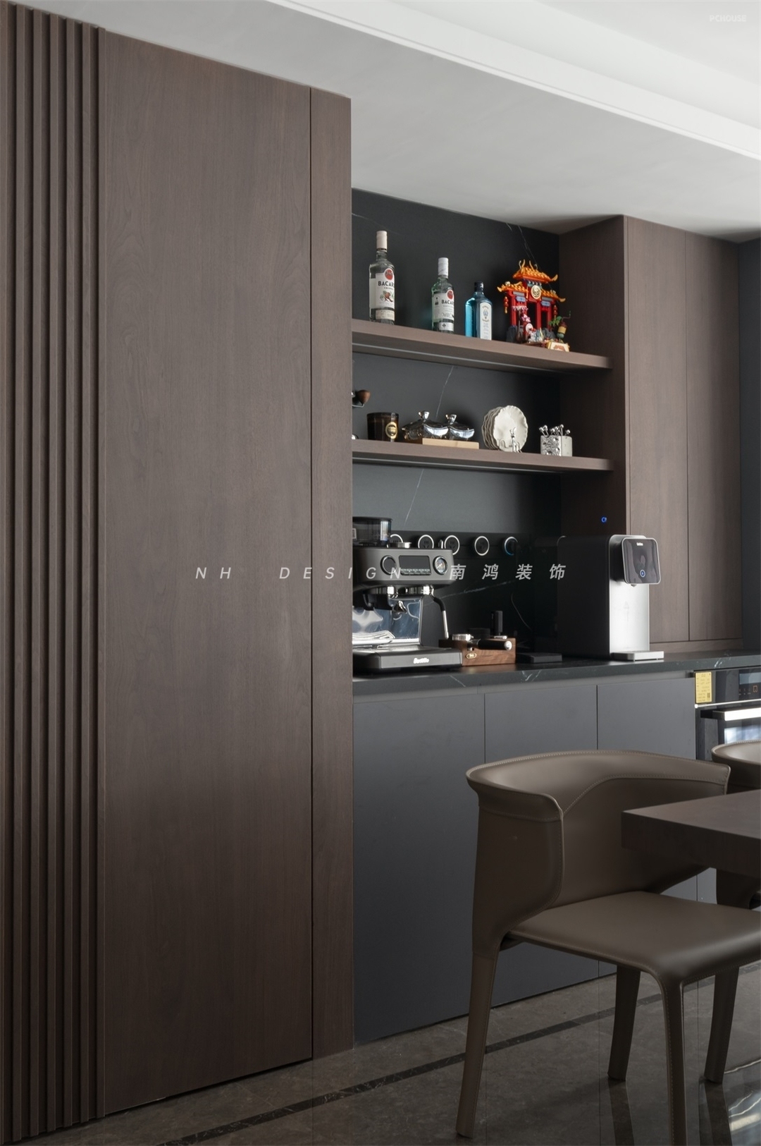 前言: 本案为意式风格的精装房改造,主以简约的设计笔法,融洽都市商务感与细腻生活气息,柔和的中性配色酝酿出安稳宁静的居室氛围。大面积的木纹与石材搭配,整体偏深色的质感,加上利落的线条、有序的体块以及通透性材质的穿插,使得空间调性平衡而和谐,充分展现了意式轻奢的风格美学。