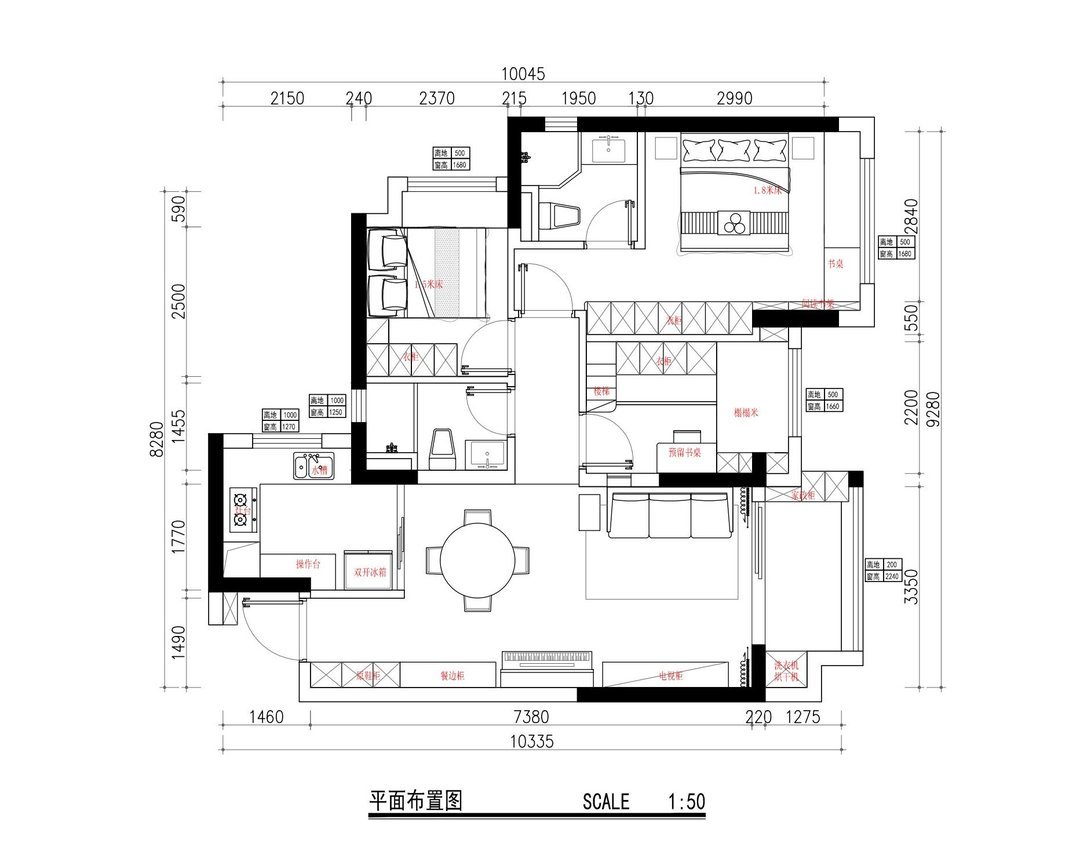 4.主卧 1.8米床,无法满足三侧行走,收纳空间严重不足,需要满足业主偶尔居家办公的需求