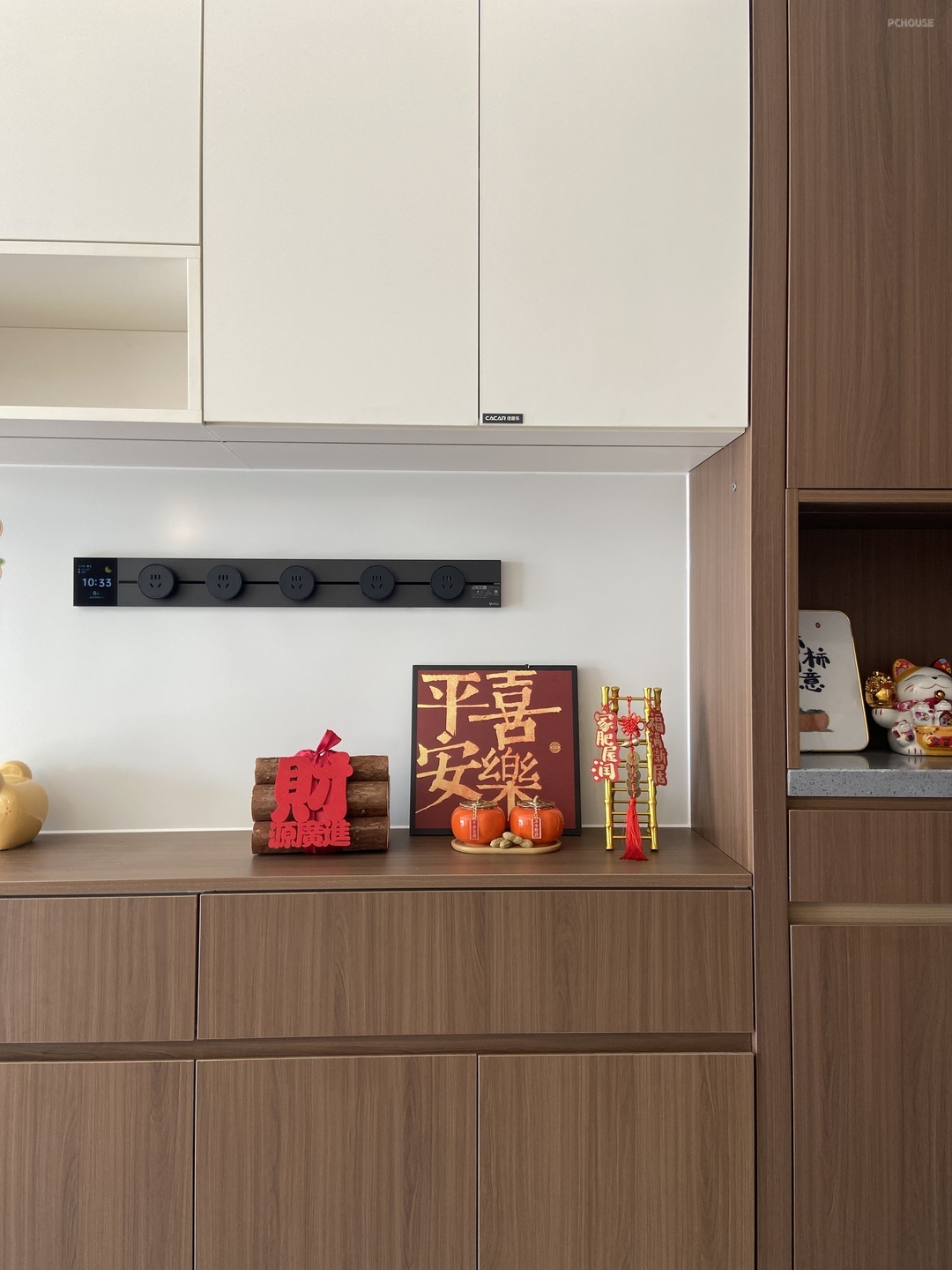 餐边柜地柜与鞋柜颜色一致,增加回家视觉延伸感一致,镂空格子可以放置常用食品茶叶。上方白色吊柜更加轻盈,储物柜和开放式木质抽屉也为整个空间增添了层次感和实用性。