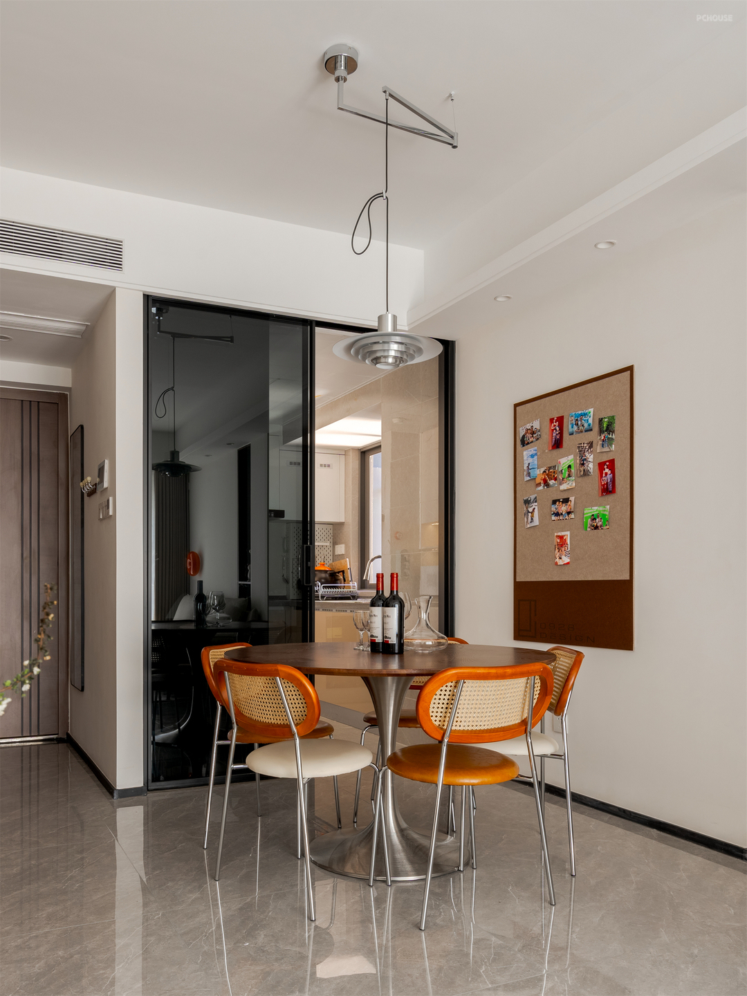 餐厅中央,圆形餐桌摆放在中央,中古藤椅橙白交替,为整个空间增添了一抹活泼的色彩。银色的摇臂吊灯悬挂在桌子上方,可以跟随餐桌调整位置,为用餐时光投下柔和温馨的光影。