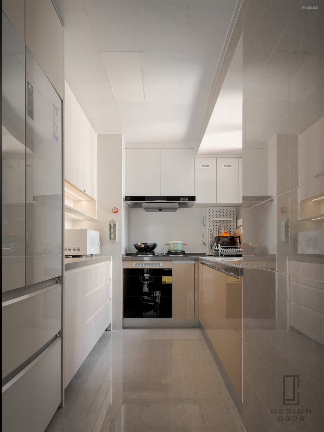 3.厨房改造为U型橱柜,增设操作台面作电器区,便于操作与清洁。新砌墙面采用珐琅板饰面,与原有灰色墙砖融合,既美观又实用,易于打理。