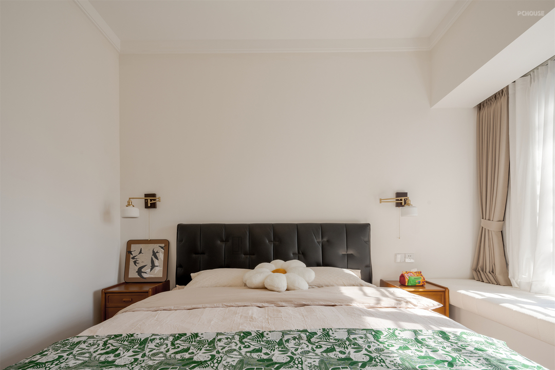 黑色床头板与白色墙壁、绿色被子相互衬托,增强层次感的同时不失和谐。壁灯增添温馨感。木质床头柜兼具质感与实用性,提供储物空间。可以在上面摆手机等小物品,既实用又美观。窗帘与墙壁色彩相近,保持整体空间统一,兼顾保护个人隐私。